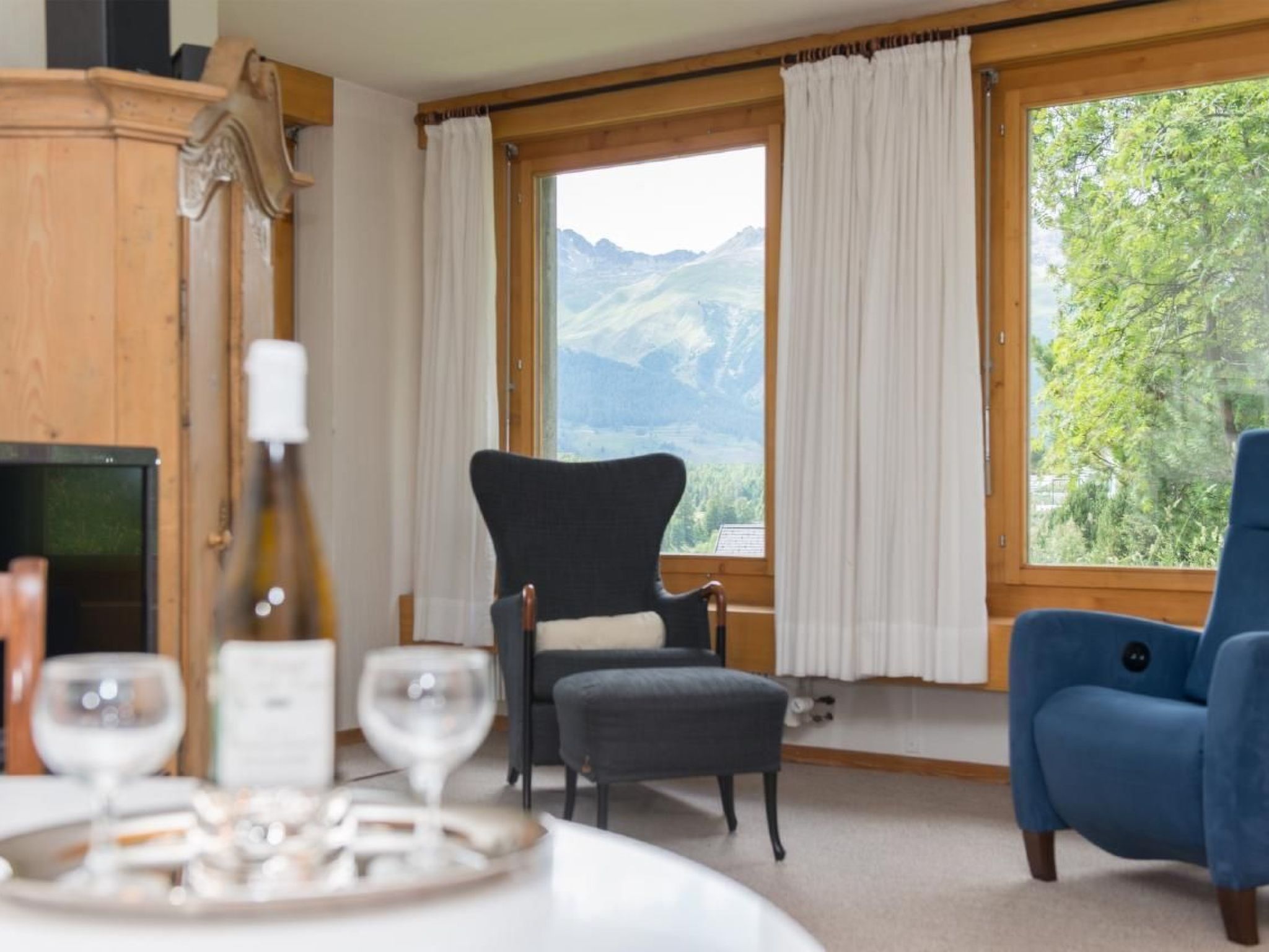 Gemütliche 2-Zimmerwohnung (54m2) mit Südwestbalkon in Haus mit gehobenem Standard. Sehr ruhig am Dorfrand gelegen mit Aussicht auf die Engadiner Bergwelt. Wohnzimmer mit SAT-TV, Radio. Separate Küche mit Geschirrspüler, Backofen, Kaffeemaschine.