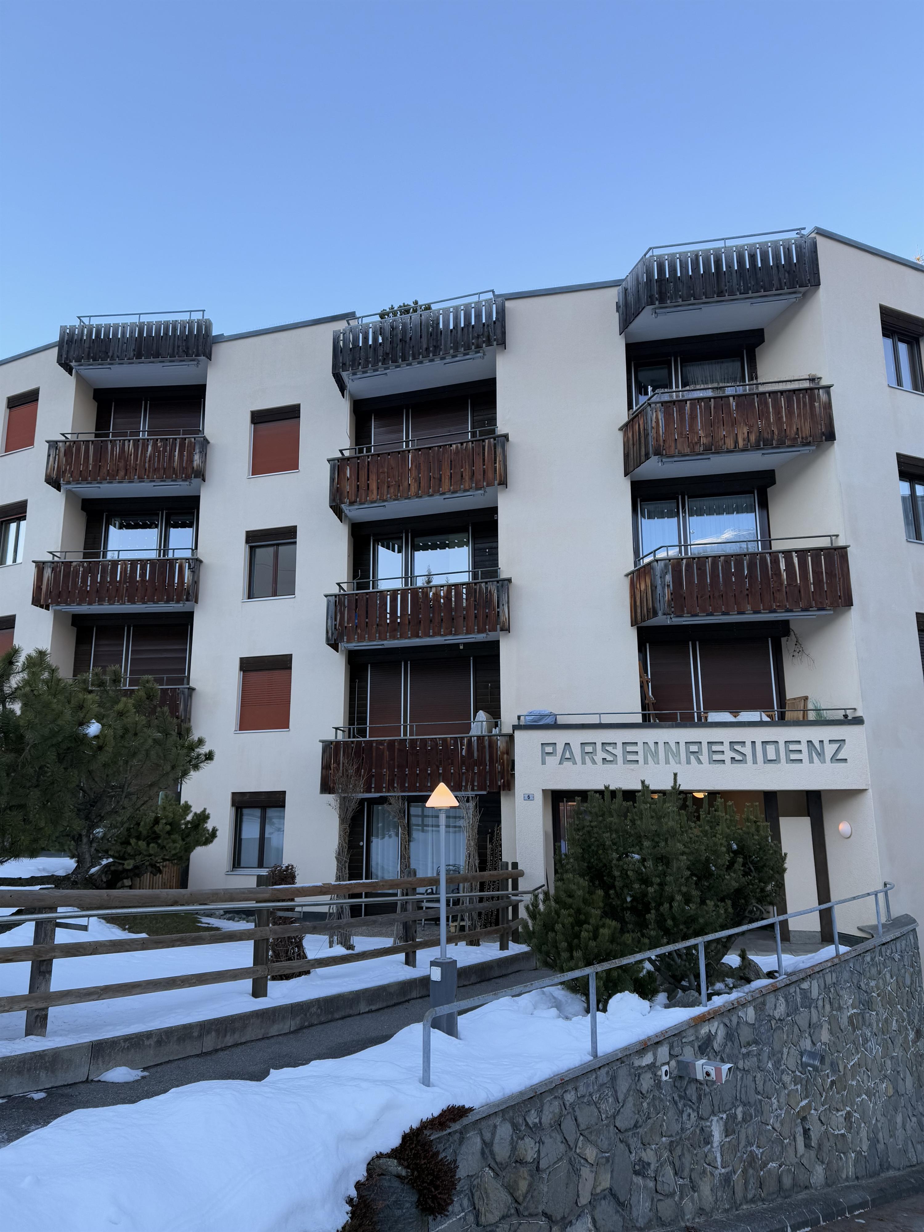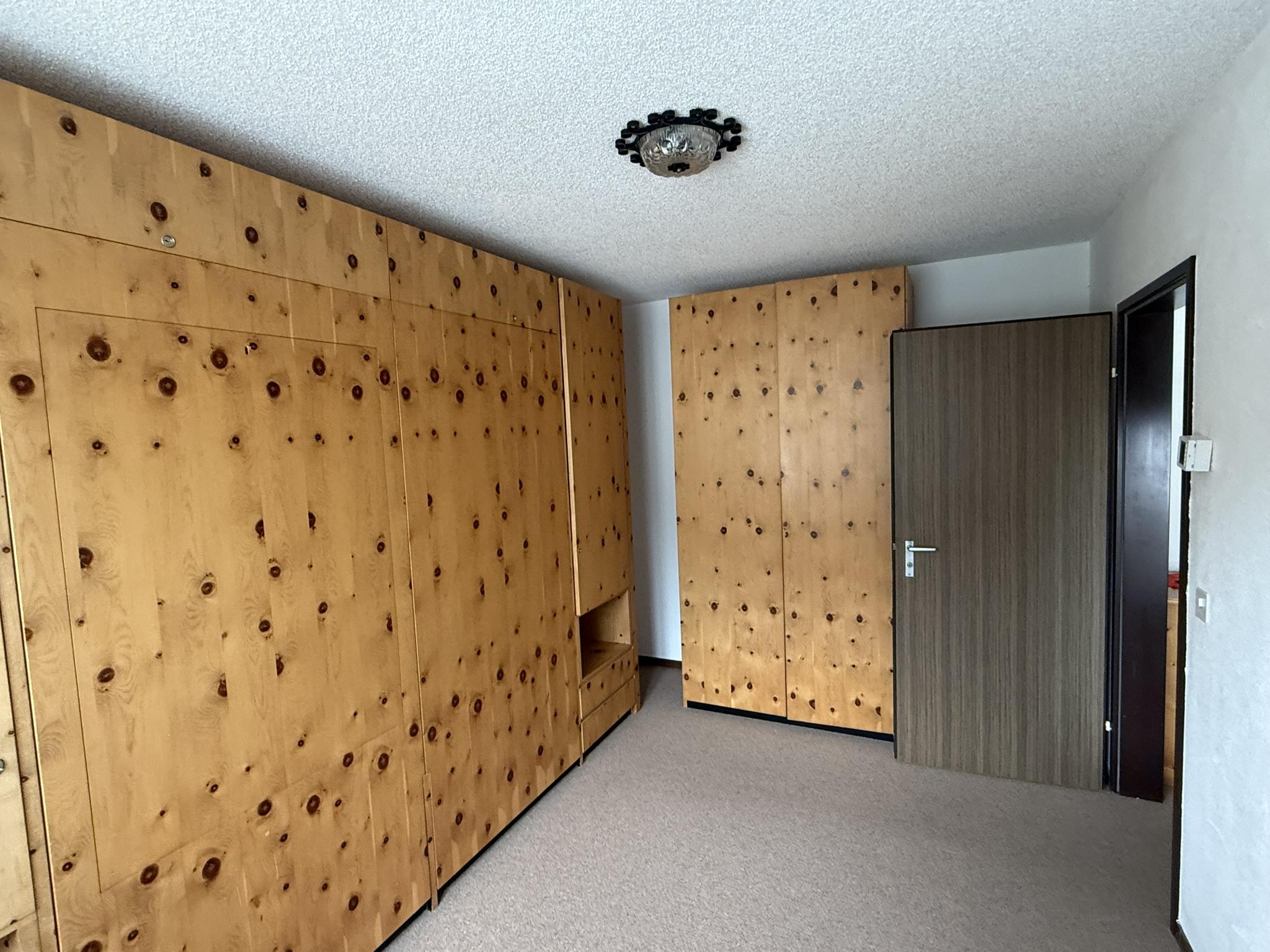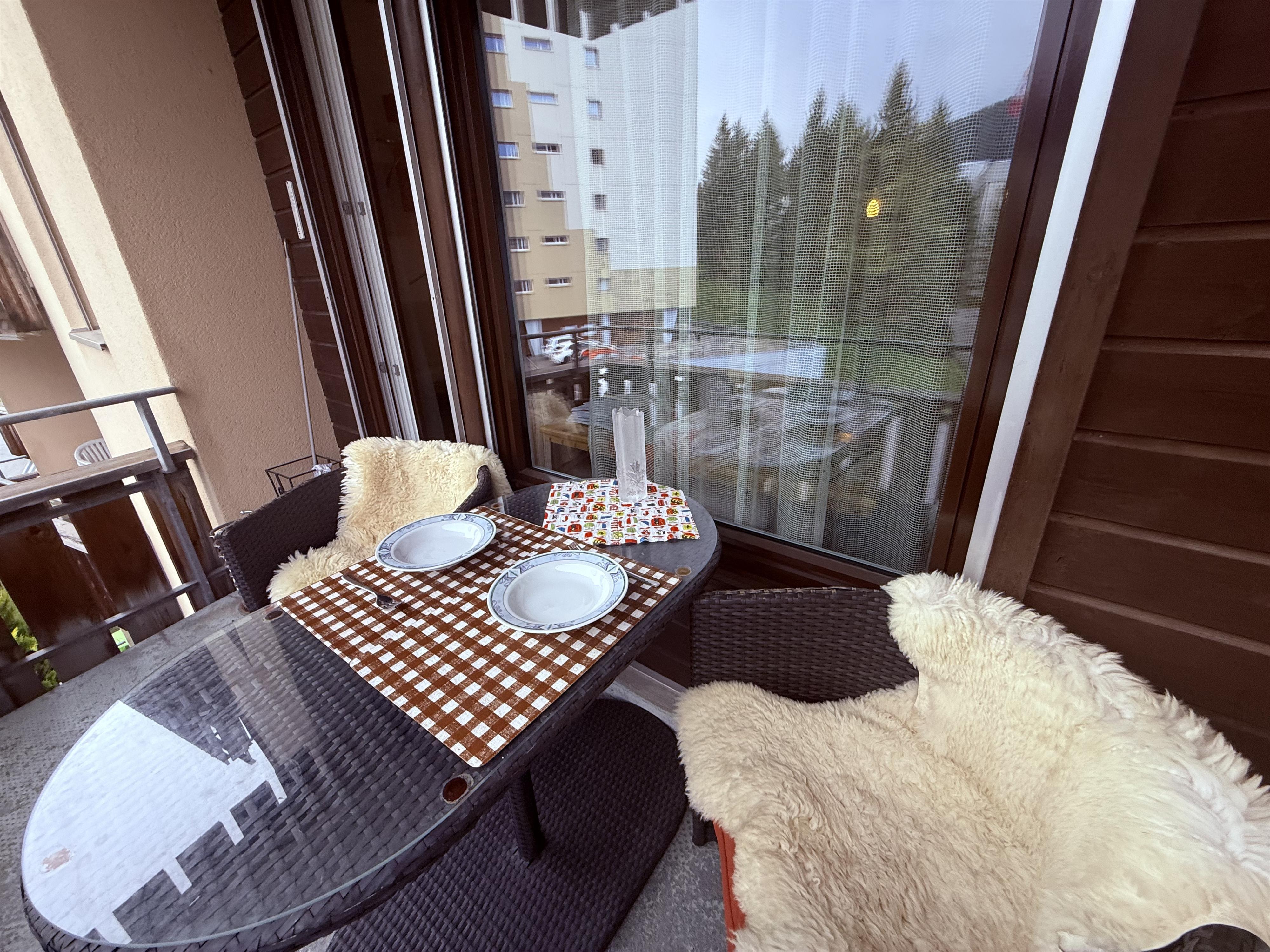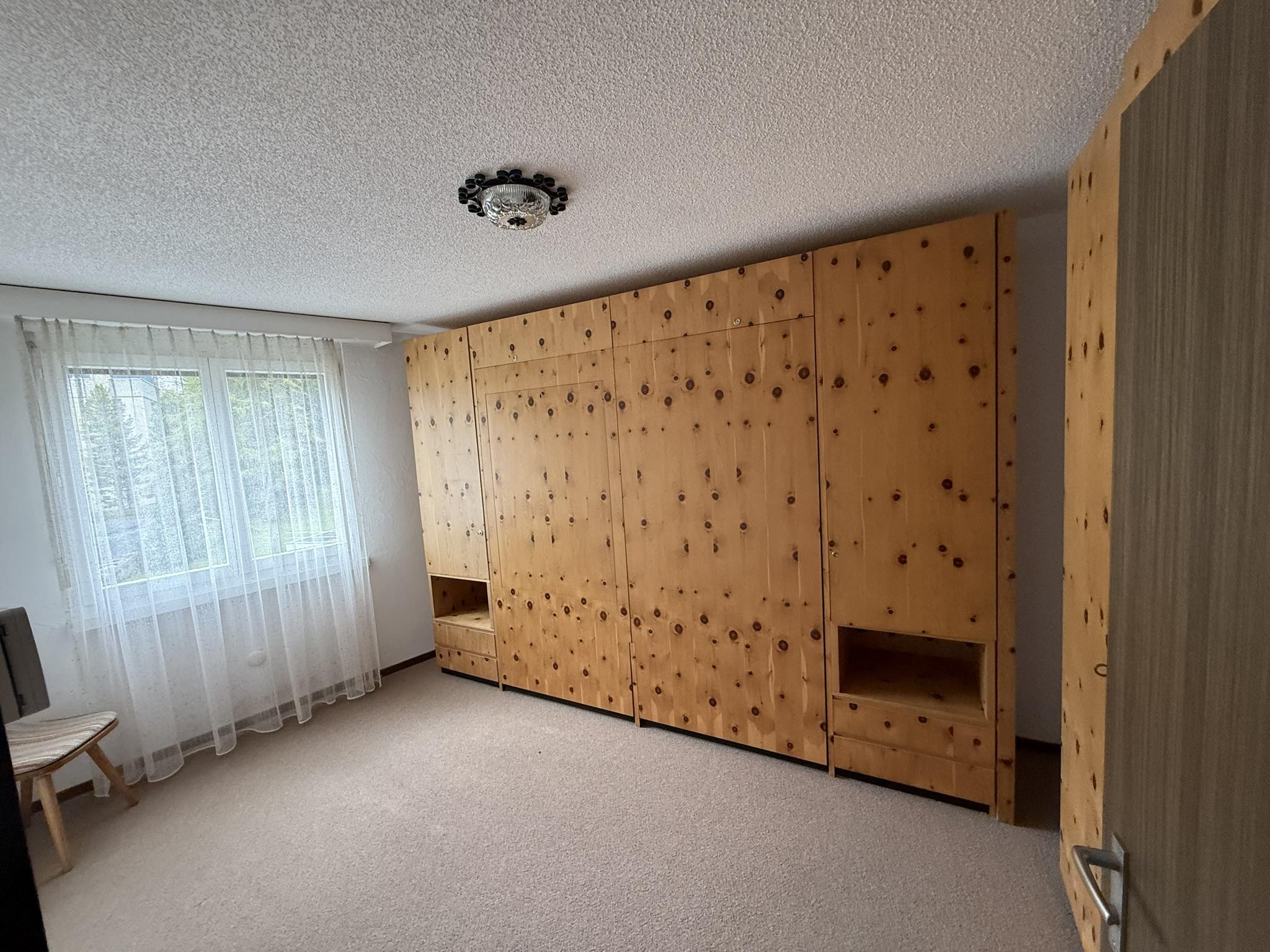 2 Zimmerwohnung im 4. Stock in Mehrfamilienhaus, (ca. 48 m2), Lift, Balkon, Parkplatz in Einstellhalle. Wohnschlafzimmer mit Bettsofa, 2 Sessel, Schlafzimmer mit 2 Klappbetten; sep. Küche mit Backofen, Kühlschrank, Geschirrspülmaschine, Kaffeemaschine; Bad mit Duschvorrichtung und WC im selben Raum, Frotteewäsche, Bettwäsche, Küchentücher, Duvet nordisch. Rustikal eingerichtete Wohnung mit Arvenholz. Mitbenützung von Waschmaschine und Skiraum. Telefon, WLAN, TV, 1 Abfallsack (blau); Nichtraucher Wohnung; Haustiere sind erlaubt!