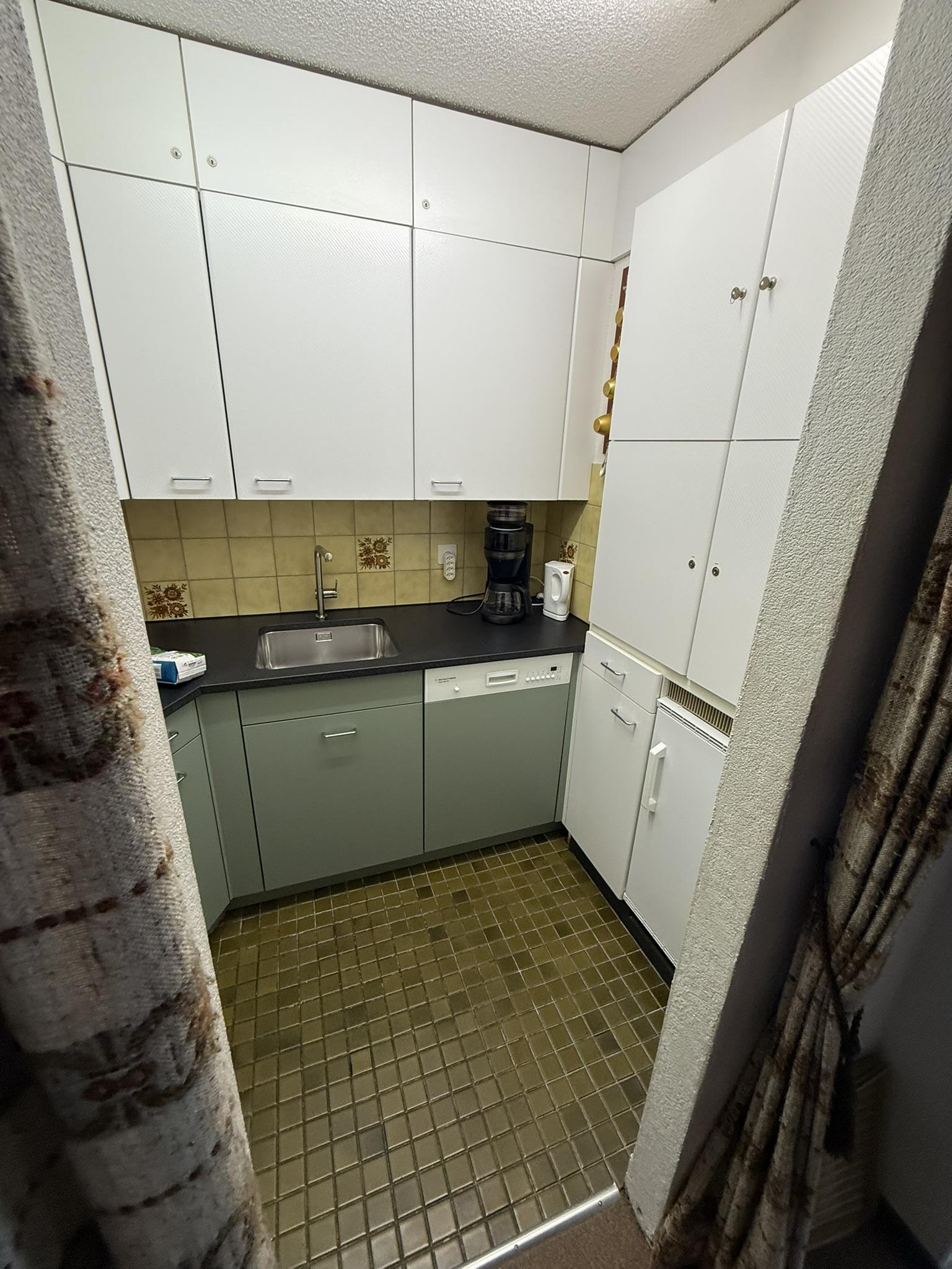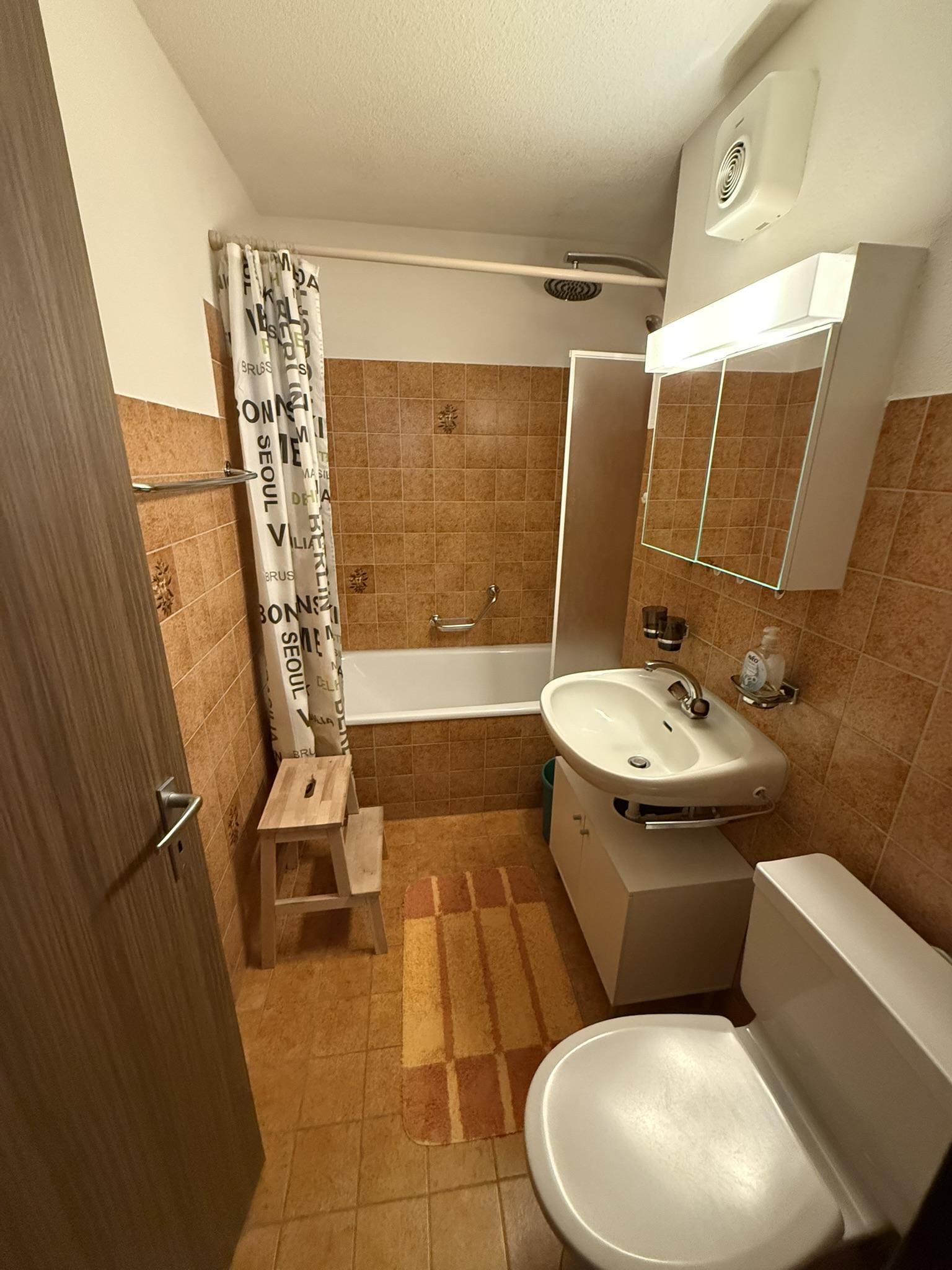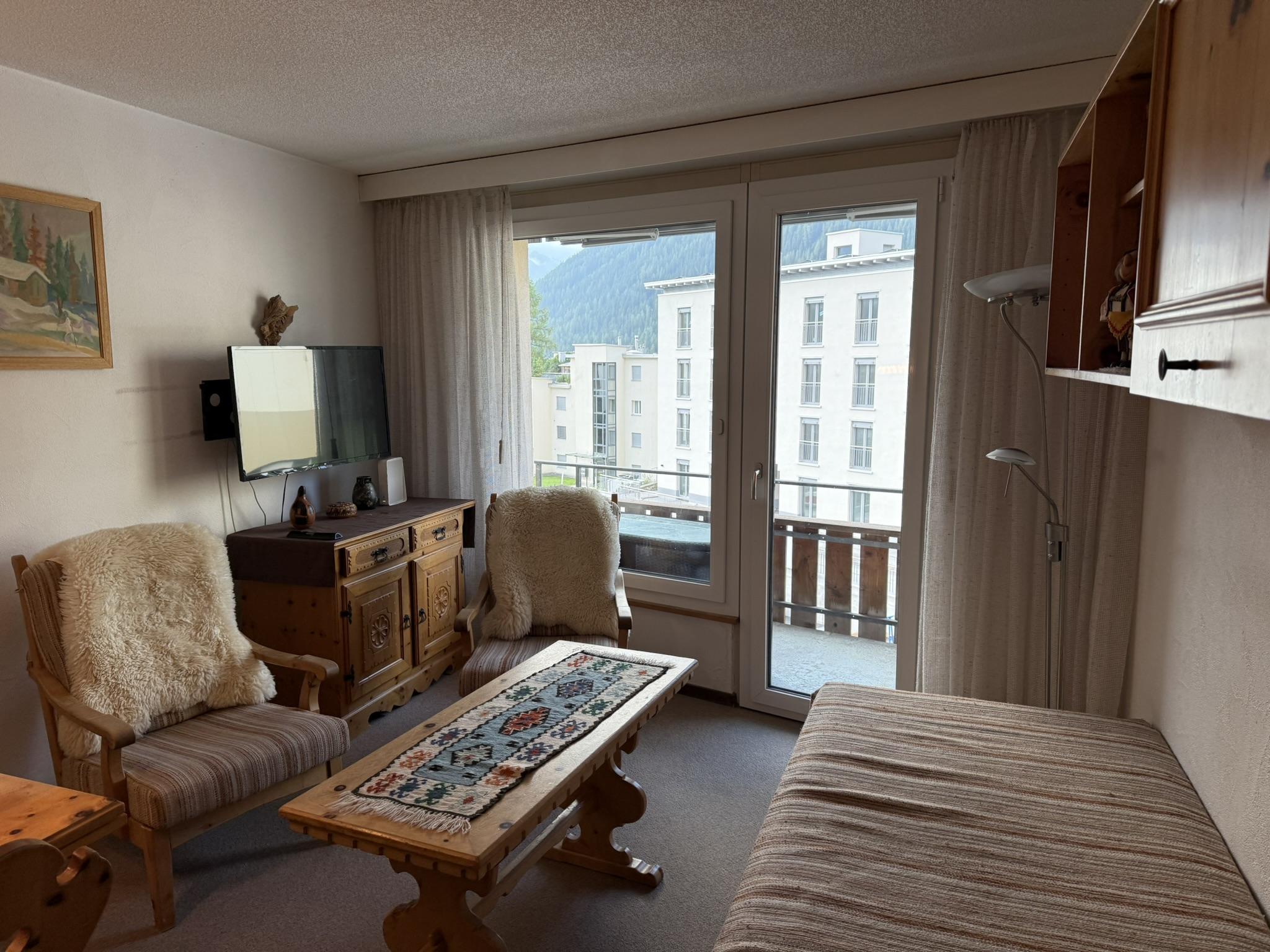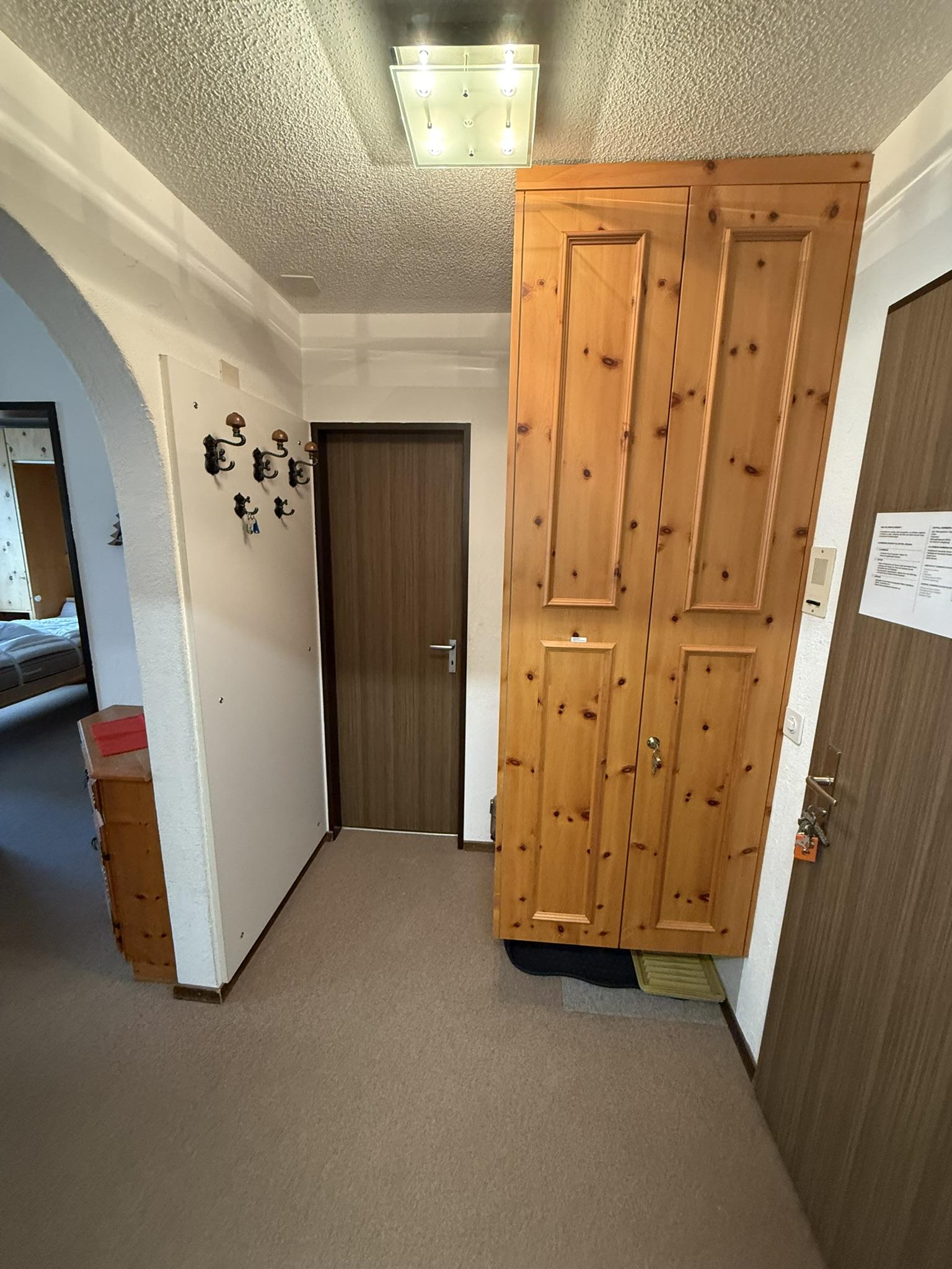 2 Zimmerwohnung im 4. Stock in Mehrfamilienhaus, (ca. 48 m2), Lift, Balkon, Parkplatz in Einstellhalle. Wohnschlafzimmer mit Bettsofa, 2 Sessel, Schlafzimmer mit 2 Klappbetten; sep. Küche mit Backofen, Kühlschrank, Geschirrspülmaschine, Kaffeemaschine; Bad mit Duschvorrichtung und WC im selben Raum, Frotteewäsche, Bettwäsche, Küchentücher, Duvet nordisch. Rustikal eingerichtete Wohnung mit Arvenholz. Mitbenützung von Waschmaschine und Skiraum. Telefon, WLAN, TV, 1 Abfallsack (blau); Nichtraucher Wohnung; Haustiere sind erlaubt!