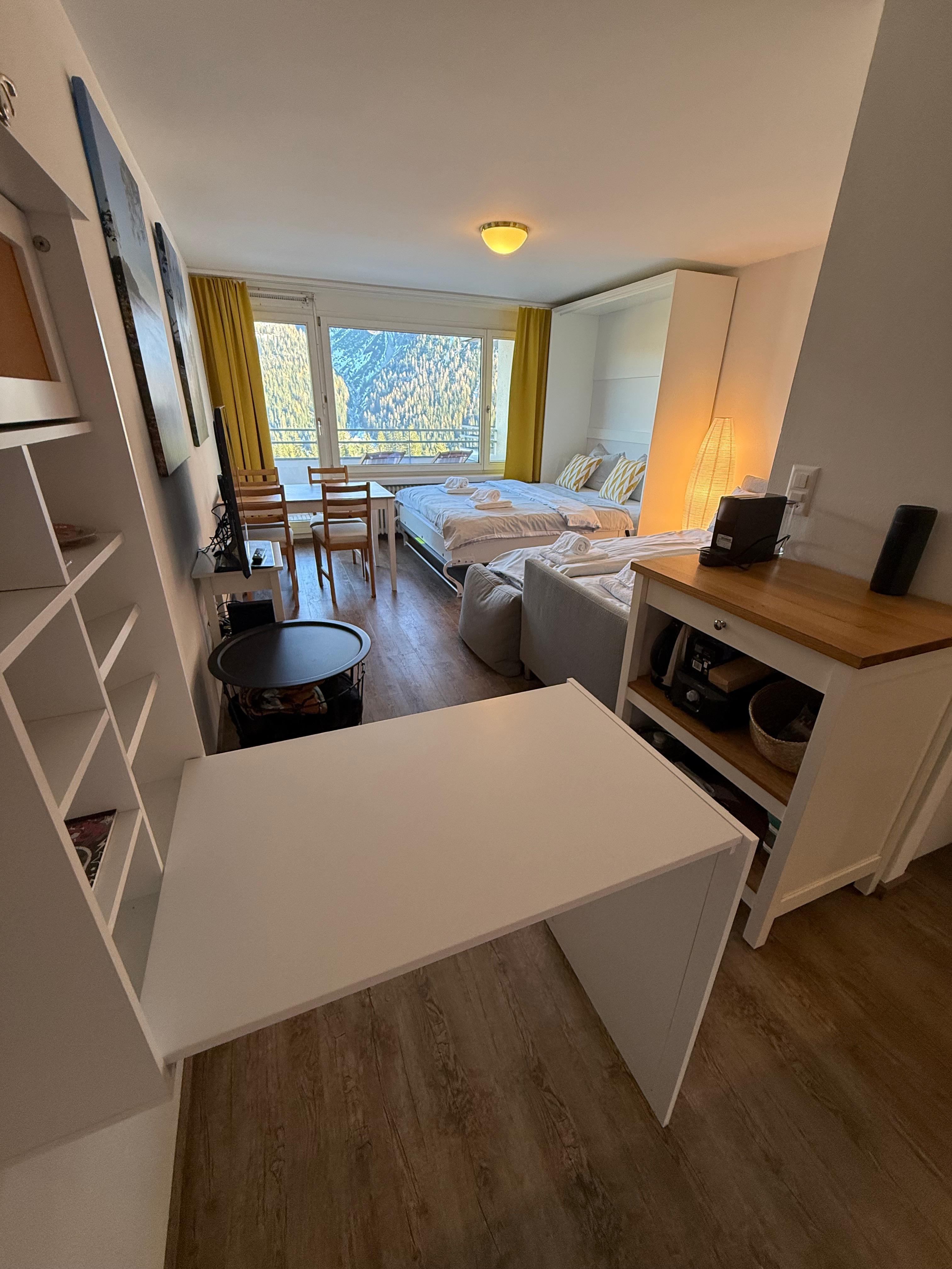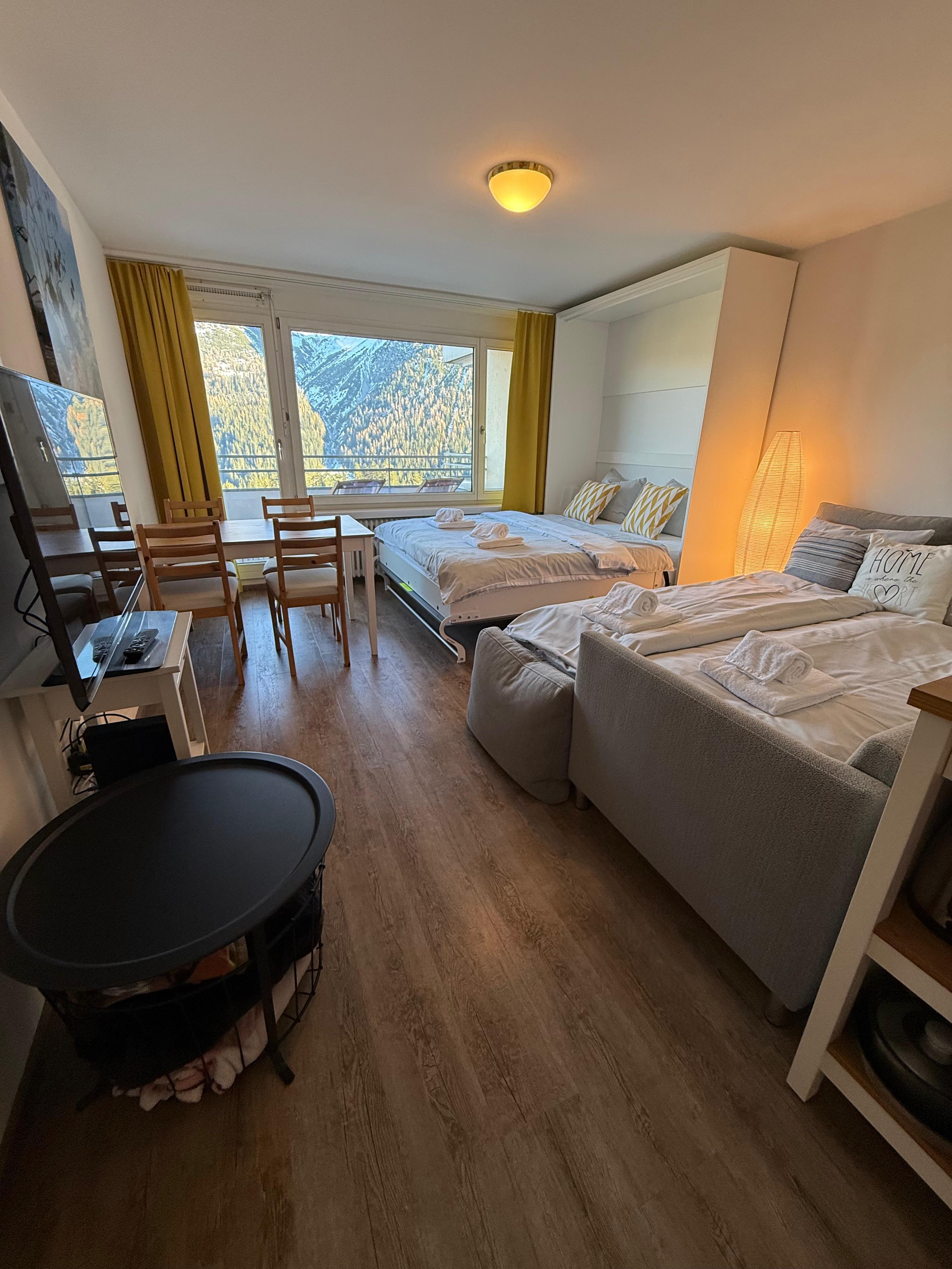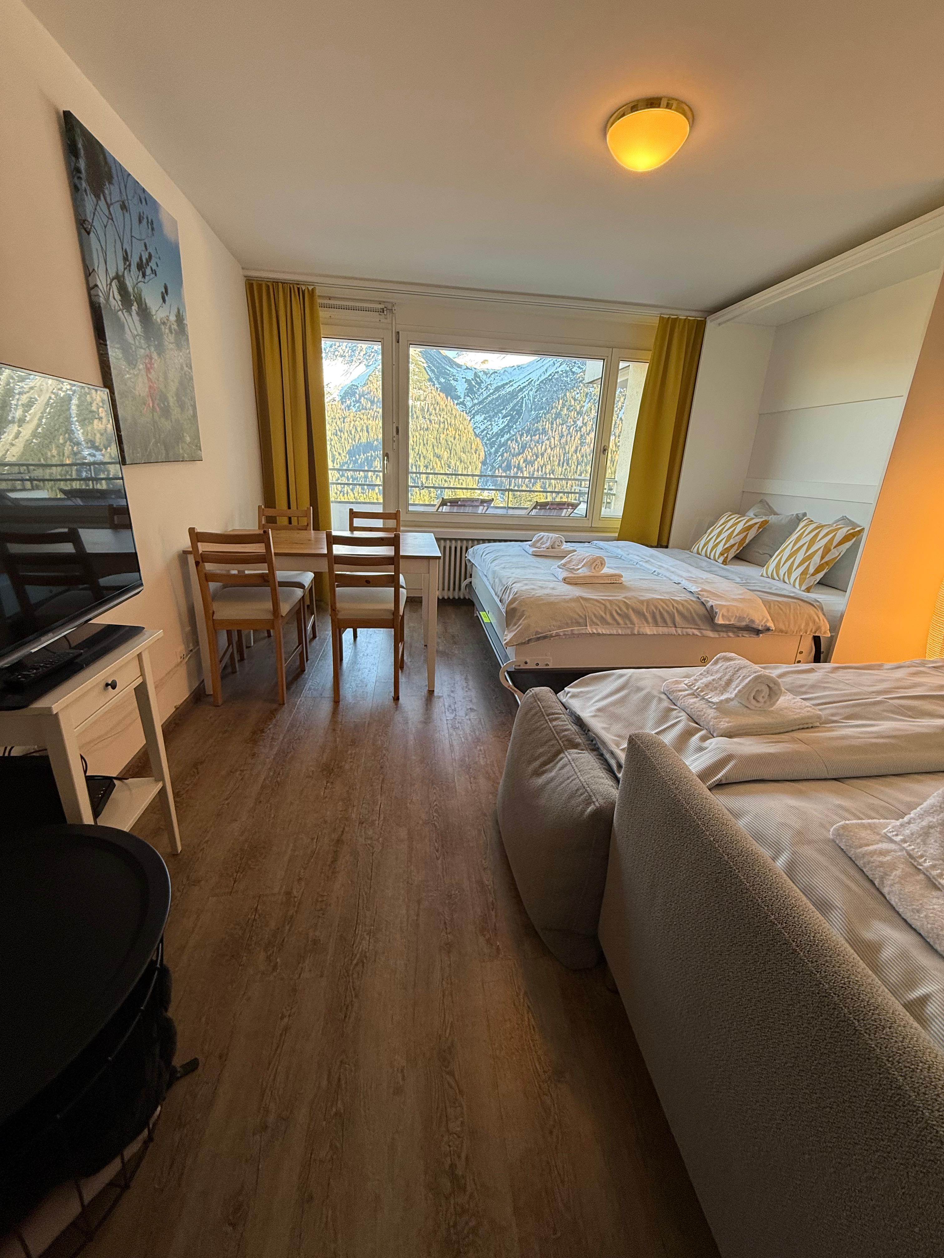 Das moderne und komfortable Studio mit spektakulärem Bergblick befindet sich im 2. Stock eines Wohngebäudes an zentraler Lage in Arosa. Mit der Bushaltestelle, dem Supermarkt sowie Restaurants & Bars direkt vor der Tür, geniesst man direkt das Dorfleben. Trotz der zentralen Lage liegt das Studio ruhig und der Einstieg ins Ski- und Wandergebiet sowie Bike Trails kann perfekt über den kostenfreien Ortsbus erfolgen.