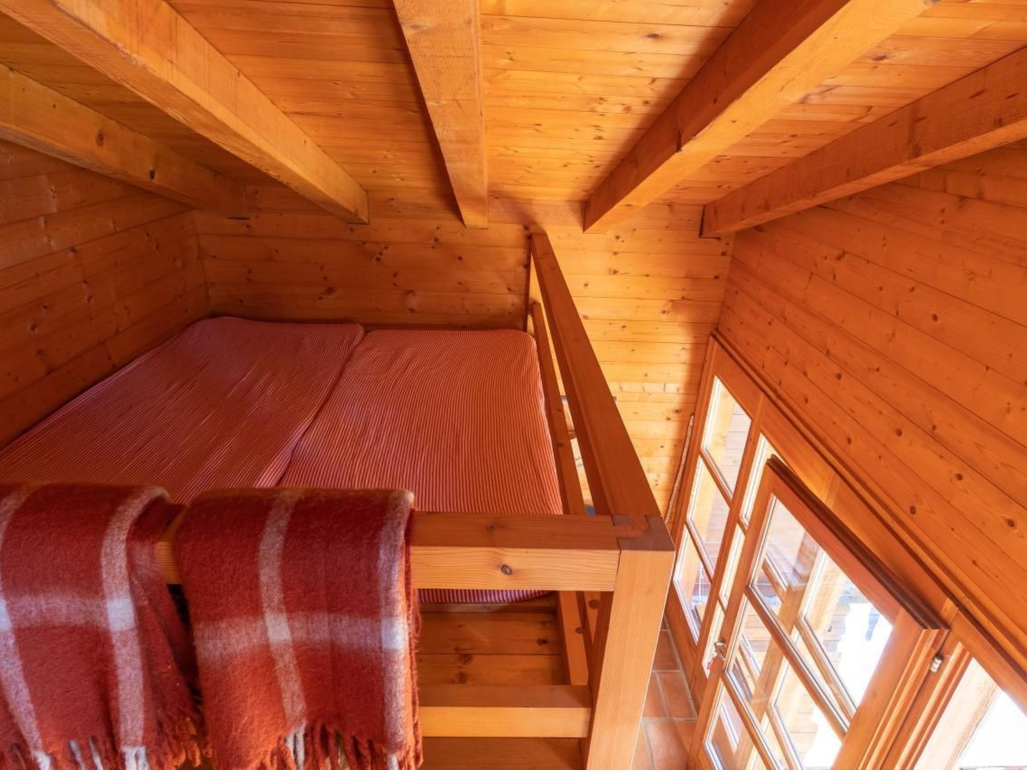 Das Ferienhaus überzeugt durch seine gemütliche Innenausstattung mit ca. 45 Quadratmetern Wohnfläche, die nach Süden ausgerichtet ist. Das Wohnzimmer mit integrierter Küche verfügt über einen Elektroherd und bietet zugleich Zugang zu einer offenen Galerie, auf der sich zwei weitere Betten befinden. Ein separates Schlafzimmer mit einem Traumausblick lässt Sie jeden Morgen mit einem Lächeln erwachen. Das Badezimmer ist praktisch mit WC und Dusche ausgestattet, komplettiert wird das Interieur durch ein Warm-Luft-Cheminée und ein Sofabett im Schlafzimmer für maximalen Komfort.