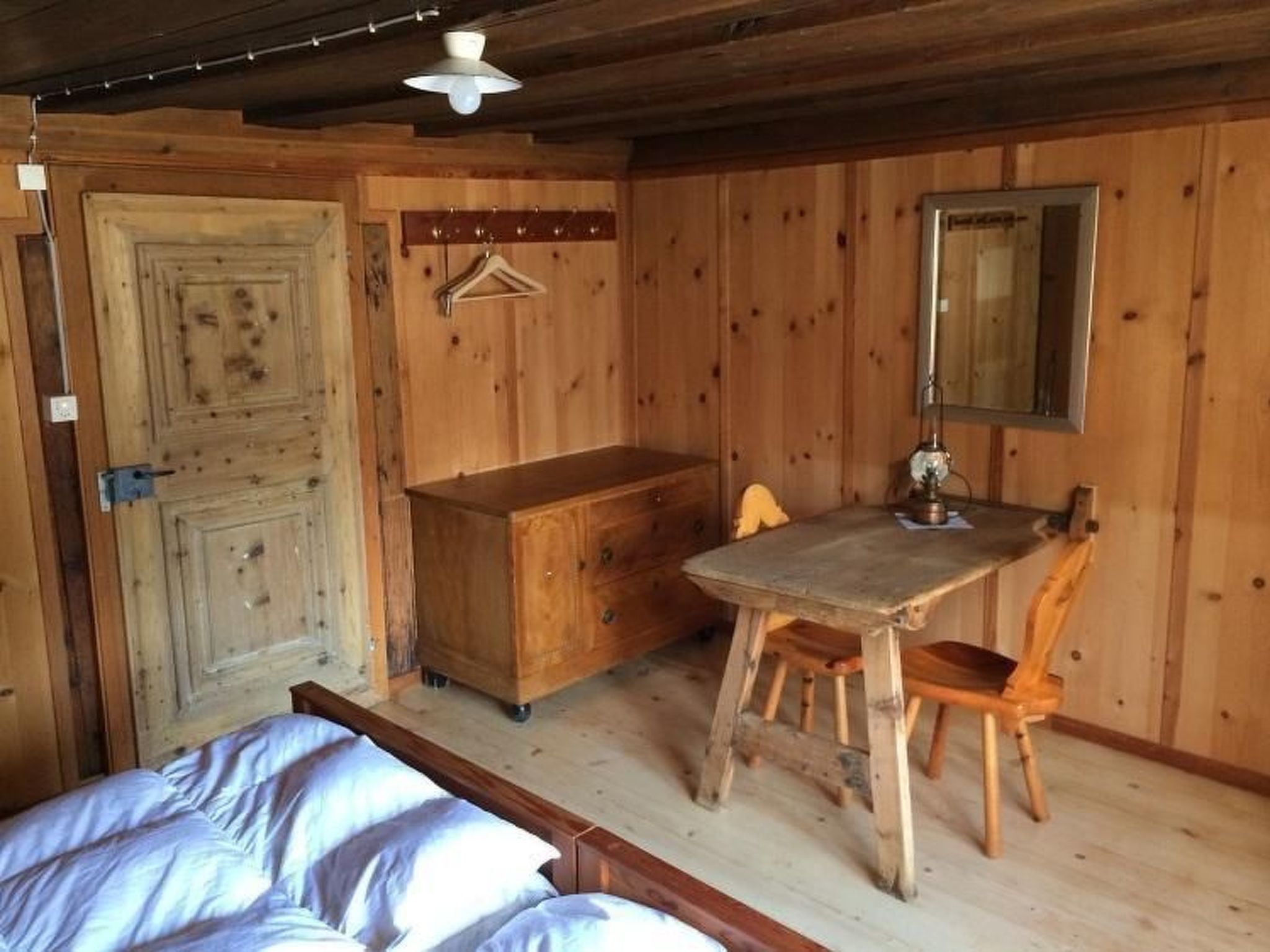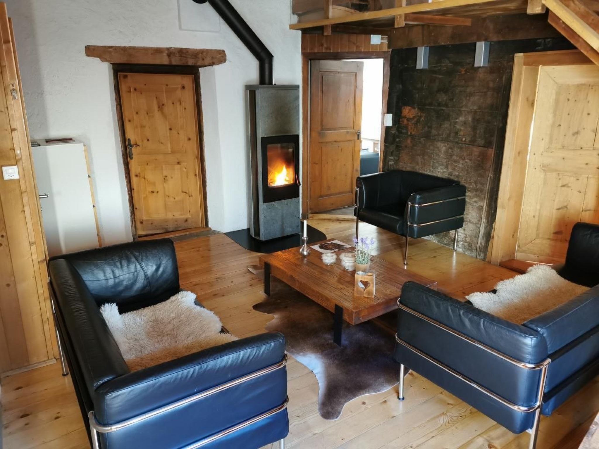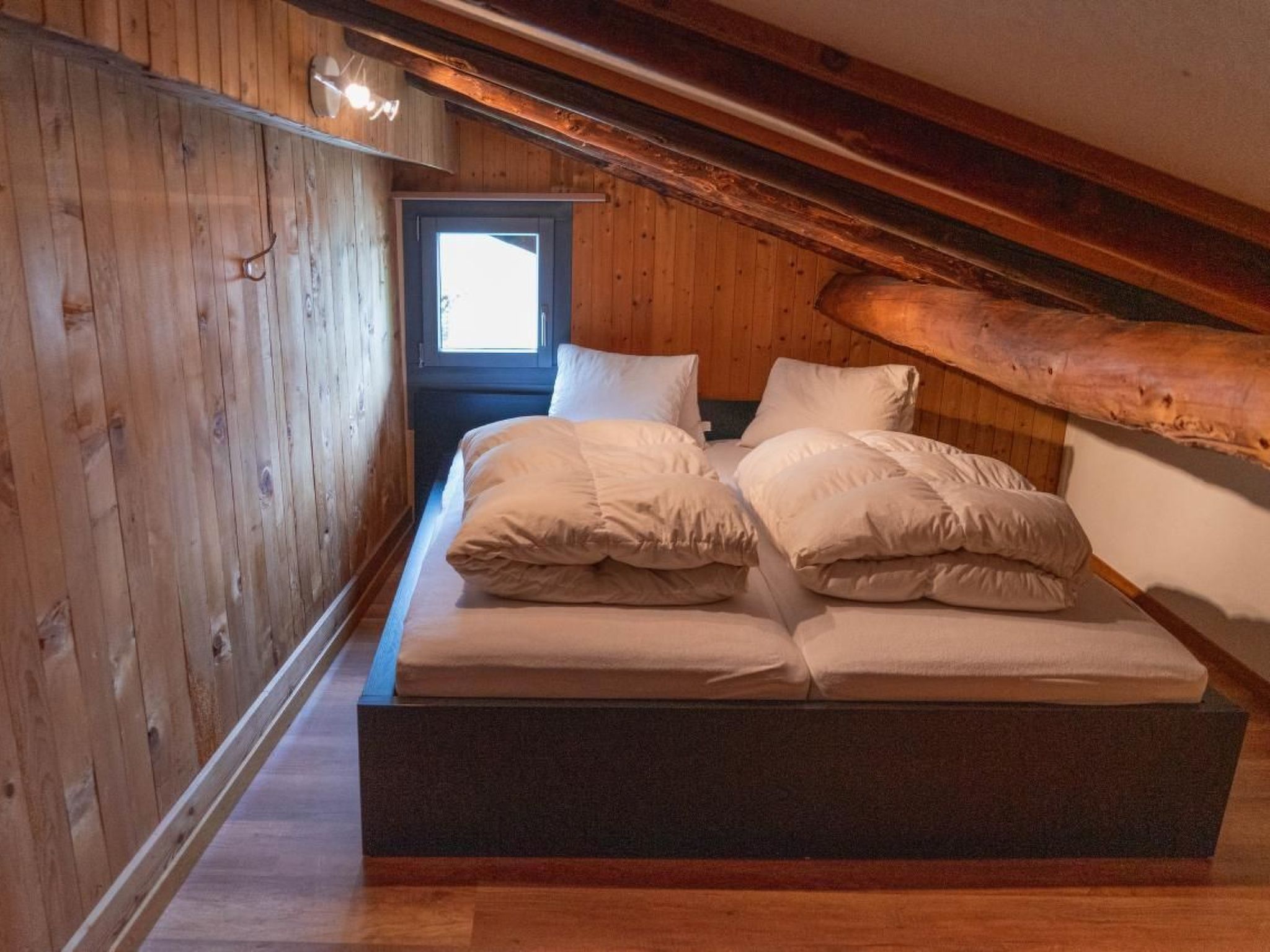 Zwei Schlafzimmer und ein Dachzimmer mit je einem Doppelbett, ein Dachzimmer mit beschränkter Höhe mit einem Doppelbett, ein grosses Wohnzimmer, ein Badzimmer (mit Dusche und Lavabo) und zwei Toiletten, eine grosse Wohnküche mit Holz und Elektro Herd, Strom, Wärmepumpenboiler. Schlafzimmereinrichtung (Schlafzimmer1): Matratzen (2x) 90 cm x 200 cm, Duvets 160 cm x 210 cm, Kopfkissen 65 cm x 100 cm. Kücheneinrichtung (Küche1): Kaffeemaschine ist vorhanden:- Bialetti Kaffeekocher, benötigt Pulverkaffee- Delizio Kaffemaschinen, benötigt Delizio Kaffeekapseln (Migros, Fust, LeShop, Denner) Kaffeekapseln und Kaffeepulver werden keine zur Verfügung gestellt Öl, Essig uns Salz sind vorhanden. Kühlschrank/Tiefkühlschrank befinden sich im Keller.