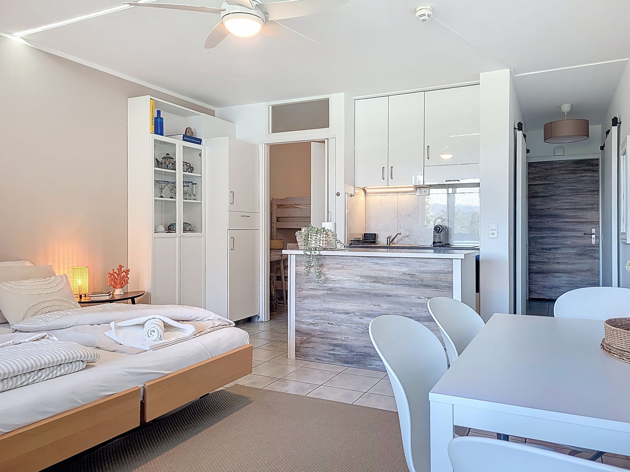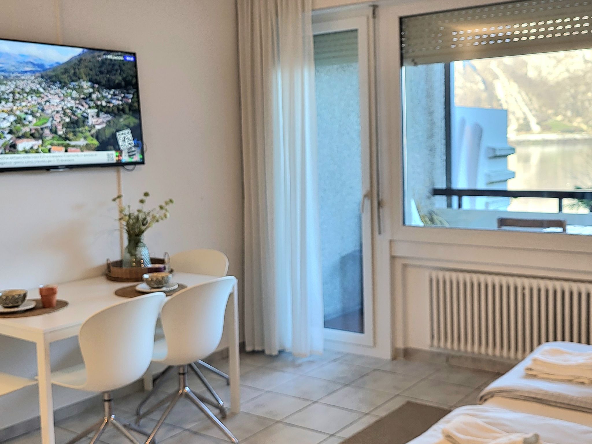 "Blue Lake Lugano Apt.312", 2-Zimmer-Wohnung 50 m2 im 3. Stock, Nordwestlage. Objekt geeignet für 2 Erwachsene + 2 Kinder. Geräumig und hell, schön und modern eingerichtet: Wohn-/Schlafzimmer mit 2 Betten (90 cm, Länge 200 cm), Internationale TV-Sender, Flachbildschirm und Klimaanlage. Ausgang zum Balkon, Richtung Nordwesten. 1 offenes Doppelzimmer, ohne Fenster mit 1 x 2 Etagenbetten (90 cm, Länge 200 cm), Ventilator. Offene Küche (Backofen, 2 Glaskeramikplatten, elektrische Kaffeemaschine, Kapseln für die Kaffeemaschine (Nespresso) extra). Dusche/WC. Natursteinboden. Kleiner Balkon 10 m2, Nordlage und Westlage. Terrassenmöbel. Herrliche Sicht auf den See, die Landschaft und die Ortschaft. Zur Verfügung: Kinderhochstuhl, Babybett bis 2 Jahre (extra), Haartrockner. Internet (WLAN, gratis, Bandbreite: 500 Mbit/s). Parkplatz beim Haus. Bitte beachten: Nichtraucher-Unterkunft. NL-00013009