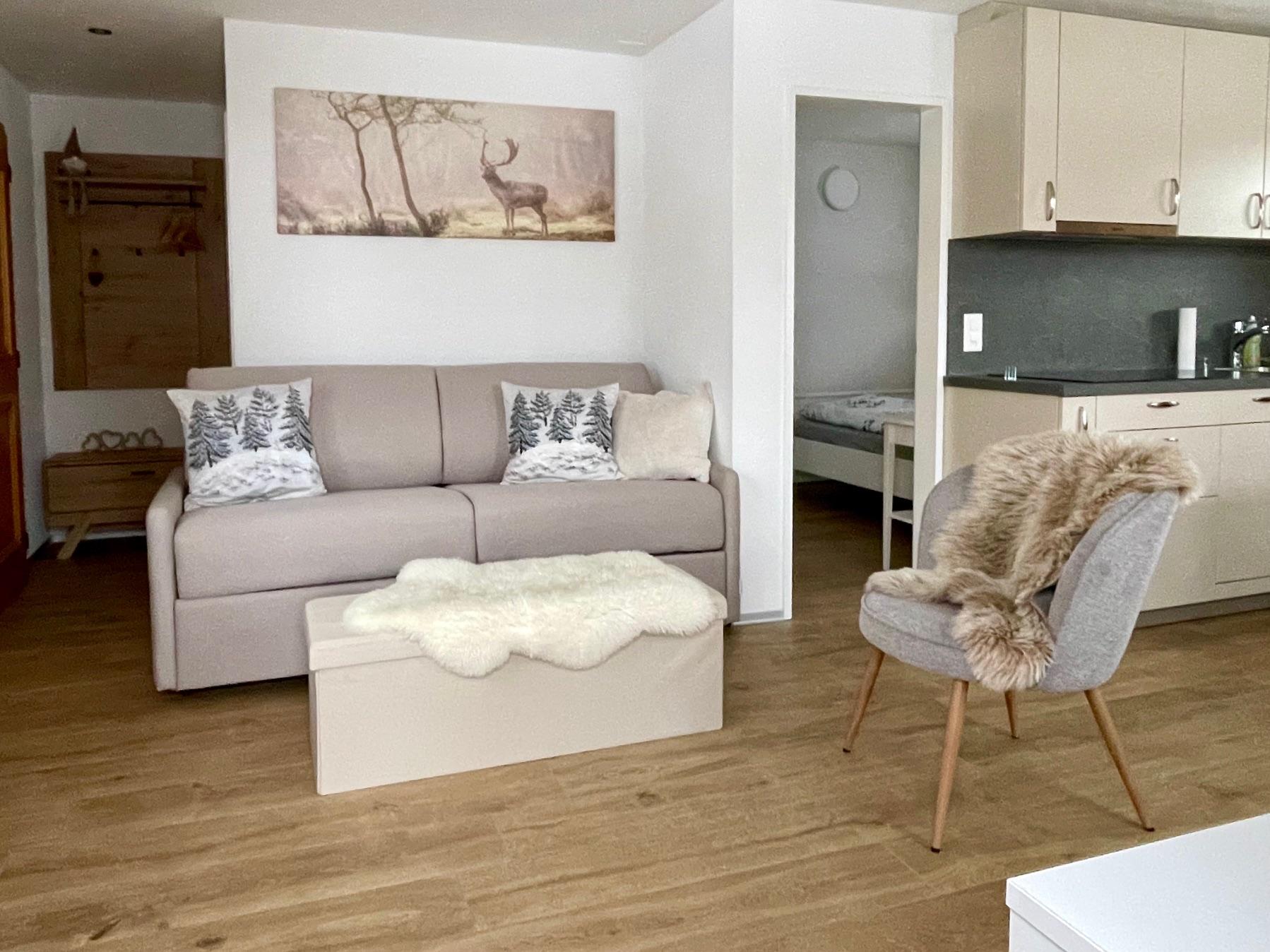 Inklusive: Parkplatz, Strom, Heizung (Wohnraum, Küche und Bad mit Bodenheizung), Bettwäsche und Küchenwäsche