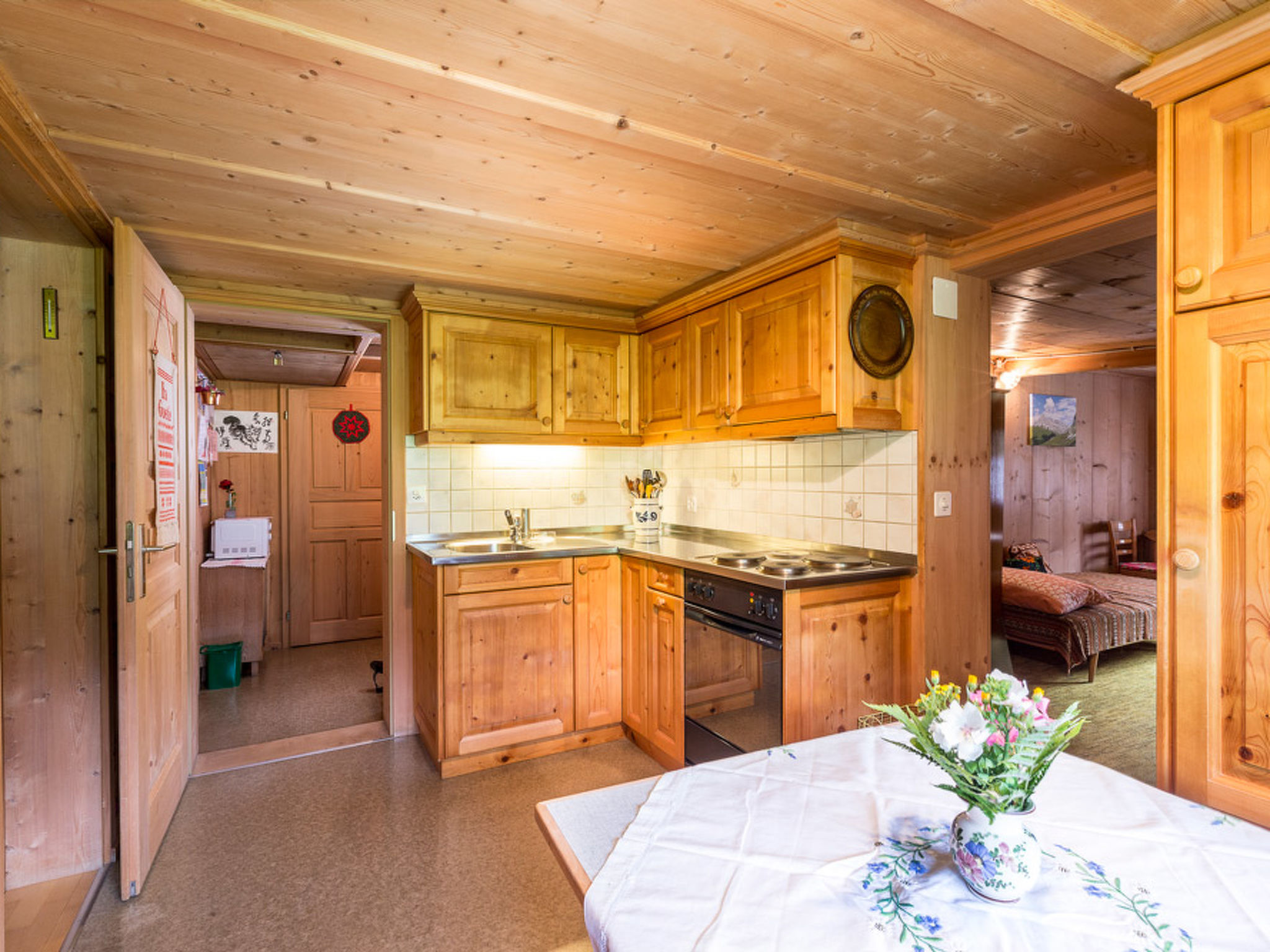55 m2. 1 Haustier/Hund erlaubt. Weitere Angaben des Anbieters: Grosses Schlafzimmer (ca. 19m2) mit zwei einzelnen Betten (und bei Bedarf 1 Schlafcouch und/oder Kinderbett), ein kleines Schlafzimmer (ca. 6m2) mit zwei einzelnen Betten, ein Wohnzimmer (ca. 15 m2) mit Schlafcouch und Dusche mit Toilette. Die Küche ist komplett ausgestattet inkl. Fonduegeschirr, Raclette-Ofen, Filterkaffeemaschine, Mikrowelle und Elektroherd. Ein Elektrogrill ist vorhanden sowie Radio/TV, Internet (W-LAN) und diverse Gesellschaftsspiele. Geheizt wird mit einer Zentralheizung, Thermostat kann in den einzelnen Zimmern reguliert werden.