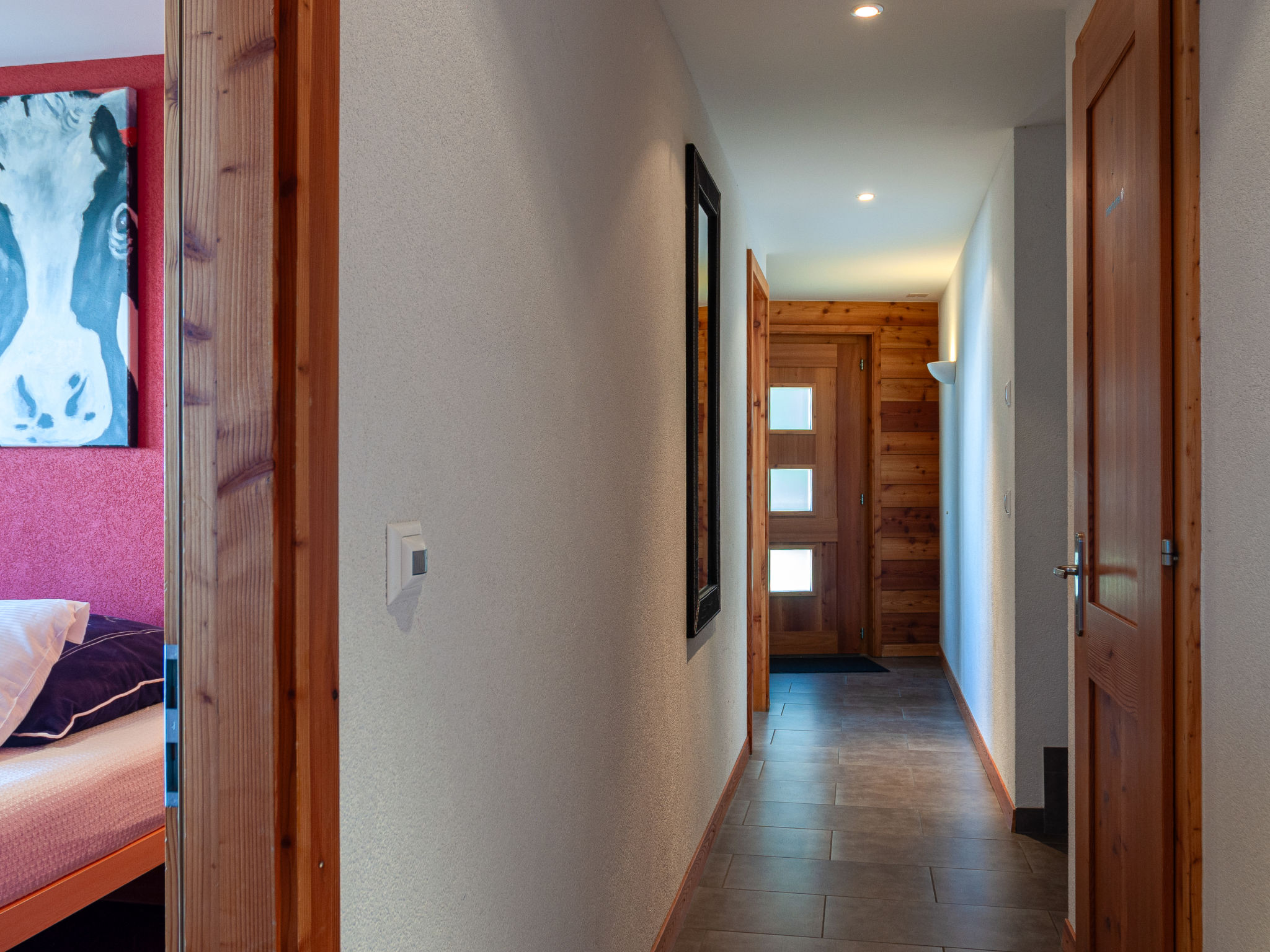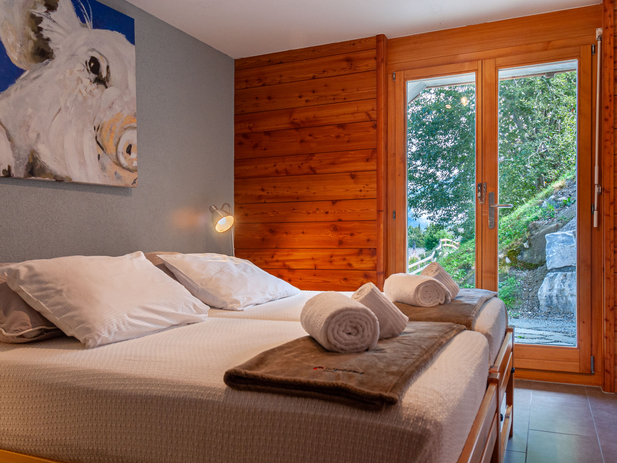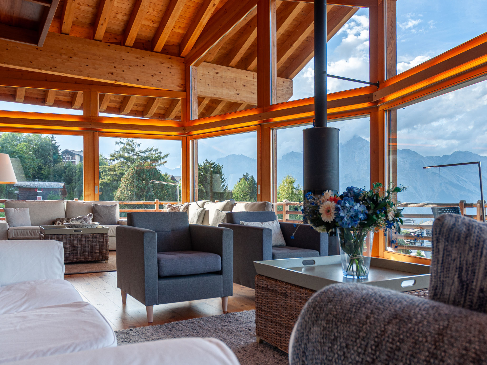 "Chalet Aquarius", 6-Zimmer-Chalet 245 m2 auf 3 Stockwerken. Modern und geschmackvoll eingerichtet: grosses Wohn-/Esszimmer 85 m2 mit Panoramafenster mit Schwedenofen, Kabel-TV und DVD. Offene Küche (Backofen, Geschirrspüler, 5 Induktionskochplatten, Toaster, Wasserkocher, Mikrowelle, elektrische Kaffeemaschine, Kapseln für die Kaffeemaschine (Nespresso) extra, Racletteofen, Fondue Set (Käse)). Sep. WC. Heizung. Unteres Geschoss: 1 Zimmer mit 2 Betten (90 cm, Länge 200 cm), Dusche/WC. 2 Zimmer, jedes Zimmer mit 2 Betten (90 cm, Länge 200 cm). Bad/Dusche, sep. WC, Sauna. Obergeschoss: 1 Zimmer mit 1 Doppelbett (2 x 90 cm, Länge 200 cm), Dusche/WC. 1 Zimmer mit 1 Doppelbett (2 x 90 cm, Länge 200 cm), Dusche/WC. 4 Balkone, Nordostlage und Nordwestlage, Terrasse, Westlage. Terrassenmöbel, Gartengrill, Liegestühle (8). Panoramasicht auf die Berge, das Tal und die Ortschaft. Zur Verfügung: Waschmaschine, Wäschetrockner, Kinderhochstuhl, Babybett, Haartrockner. Internet (WLAN, gratis). Parkplatz (2 Autos), Garage (2 Autos), Höhe 200 cm, Breite 245 cm. Bitte beachten: Nichtraucher-Unterkunft.
