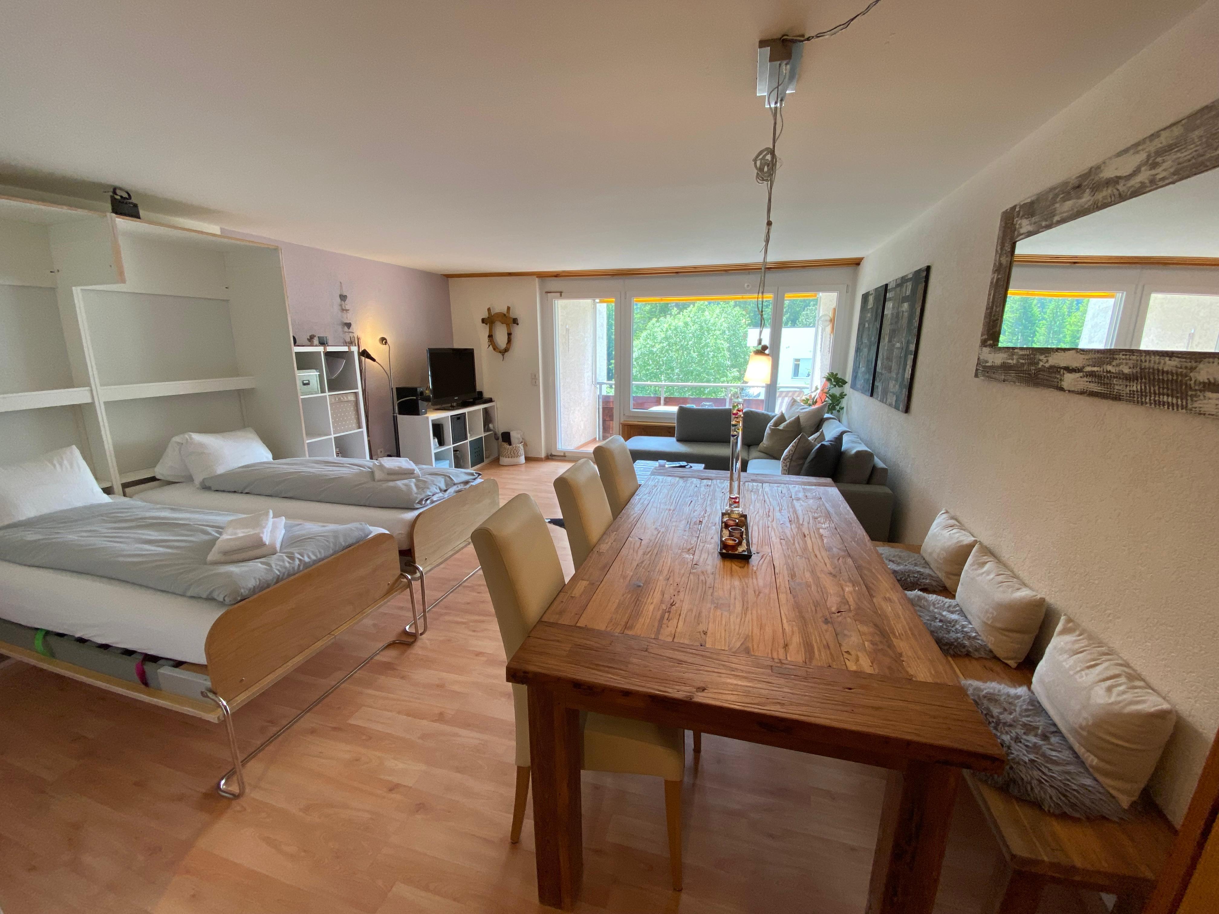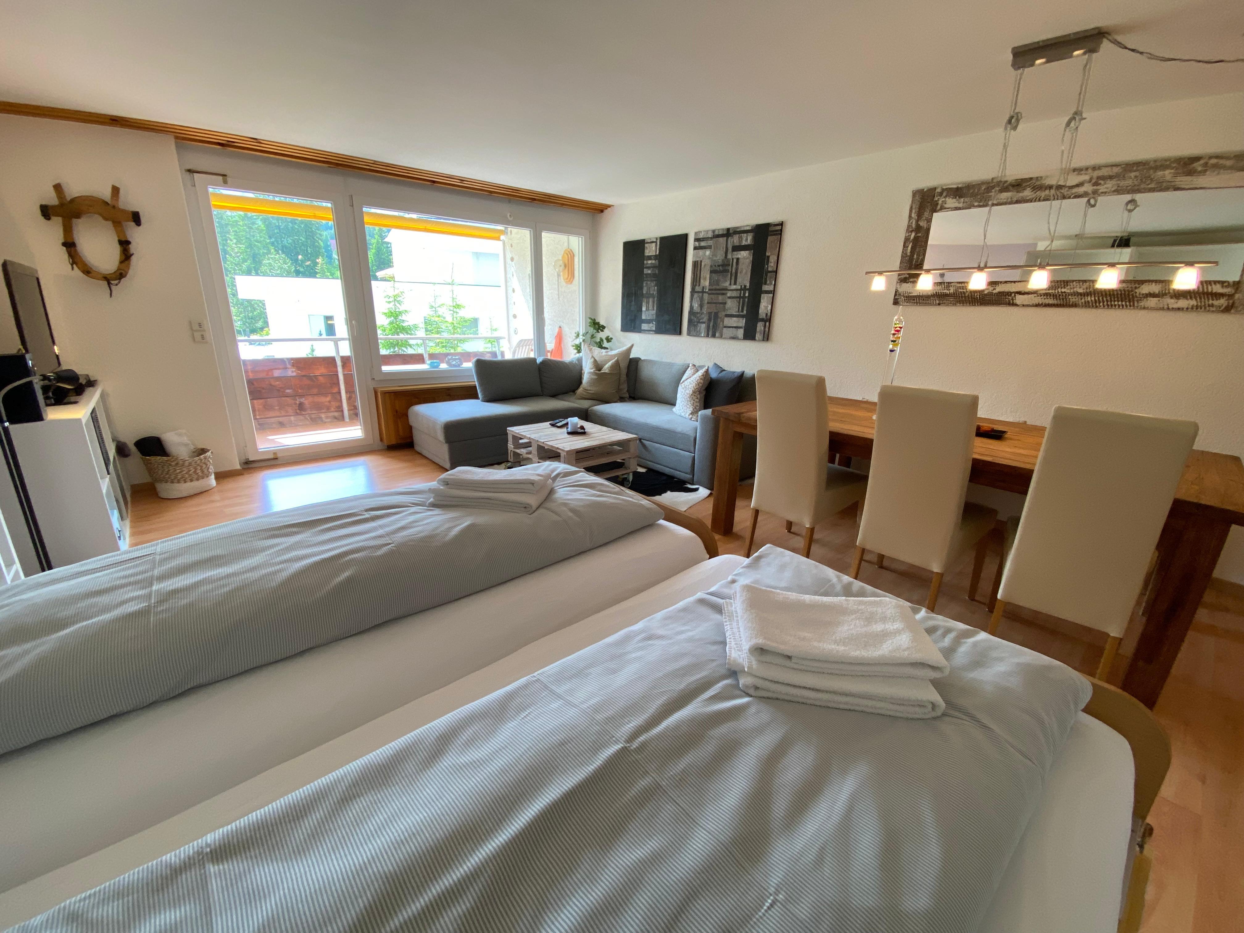 Geräumiges Wohn- und Esszimmer mit 2 x Schrankbetten (90x200 cm) und einer Schlafcouch für 1 Erwachsenen oder 1 Kinder (140 cm)