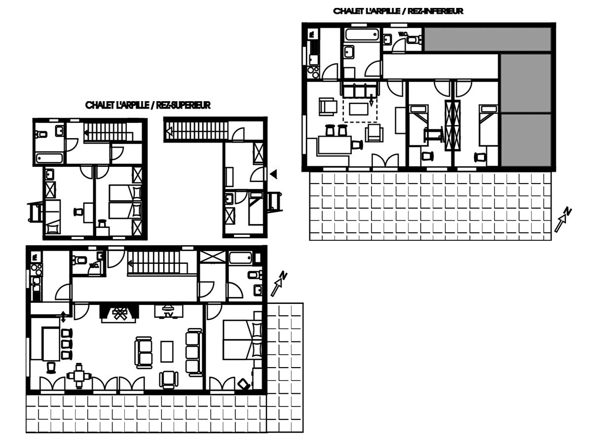Erdgeschoss : 1 Schlafzimmer mit 1 Etagenbett + Waschbecken, 2 Schlafzimmer mit 1 Etagenbett jede, 1 Wohnzimmer mit 2 „gigogne“ Betten und 1 Badezimmer/WC.
