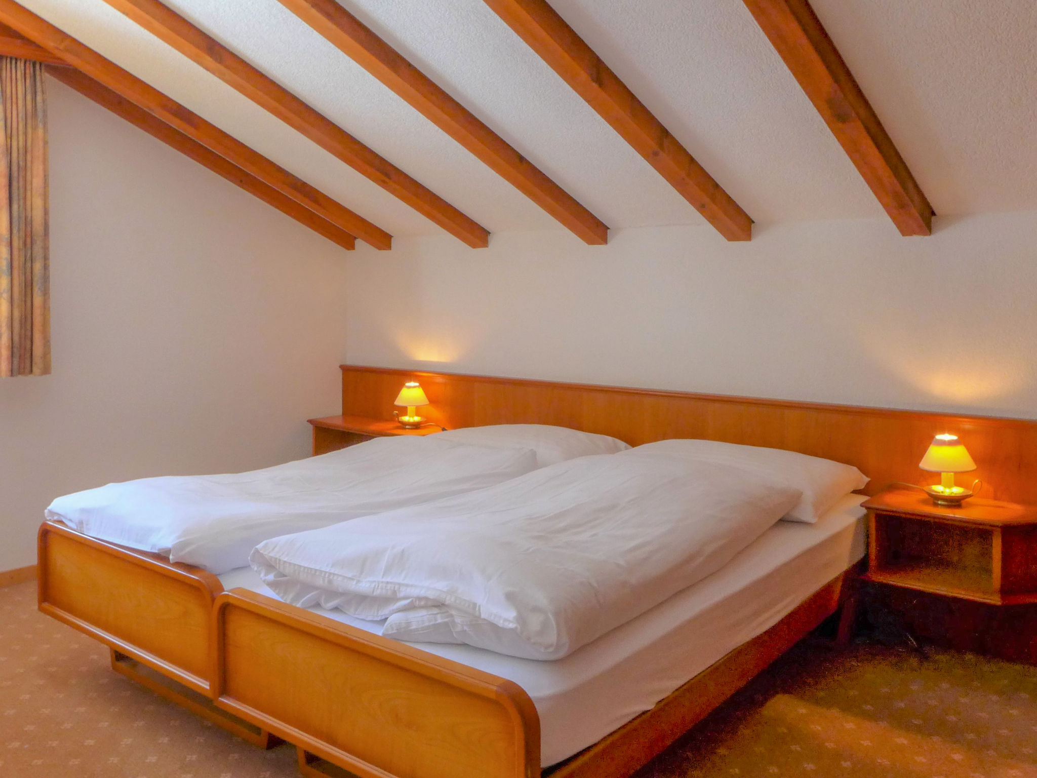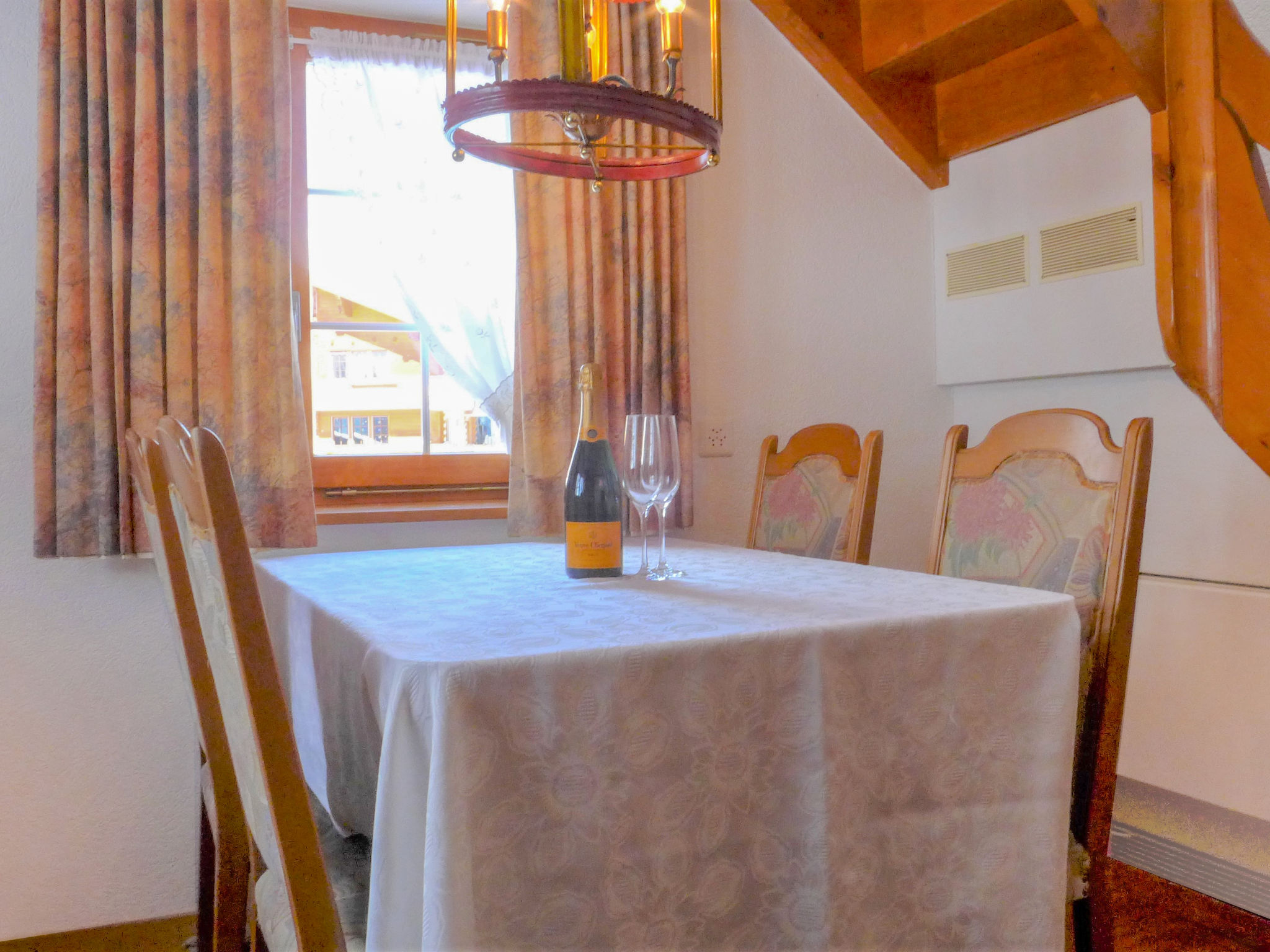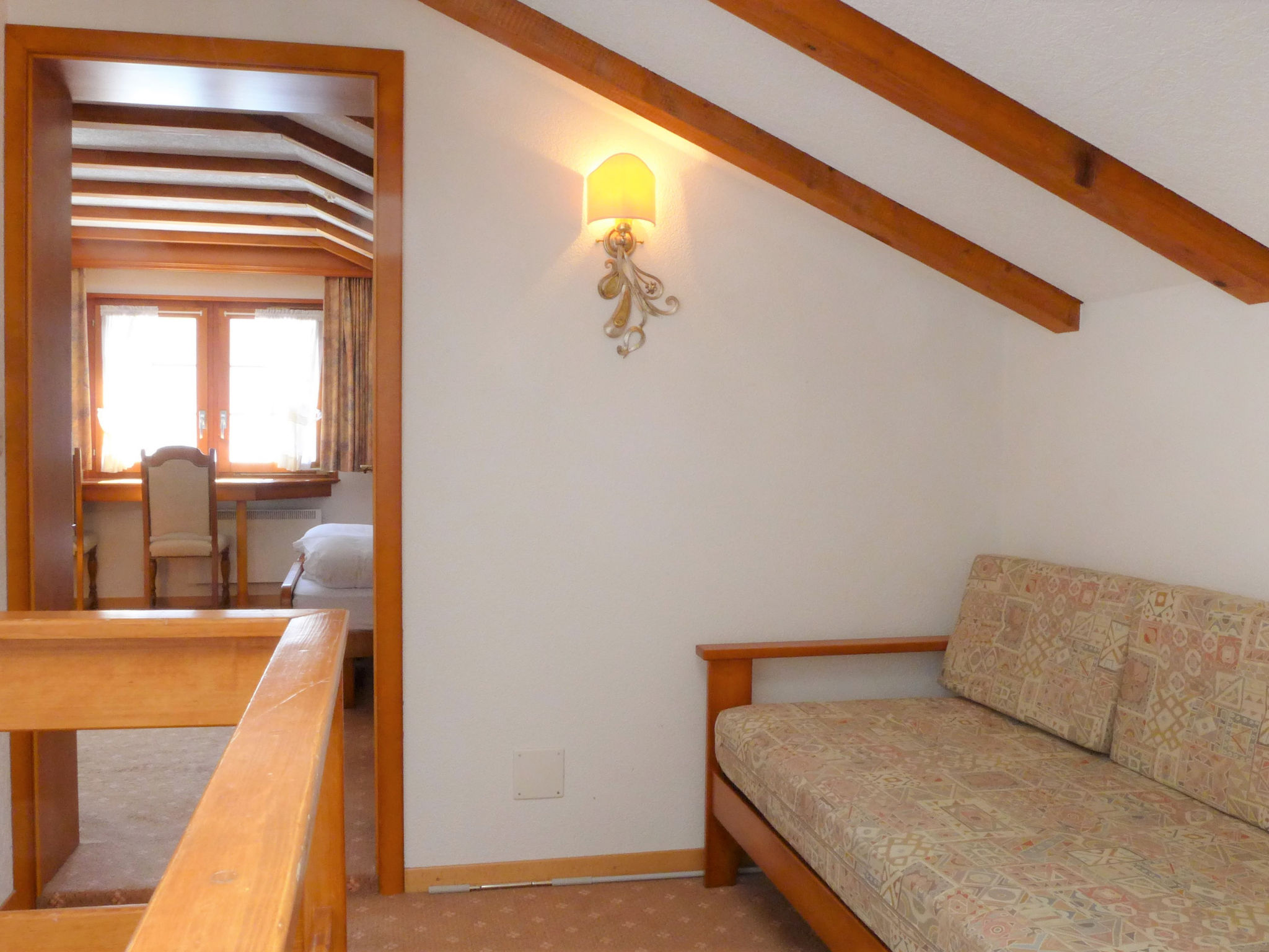 4-Zimmer-Wohnung 89 m2 im 1. Stock, Südlage. Einfach und gemütlich eingerichtet: Durchgangszimmer 16 m2 mit 2 Betten (90 cm, Länge 200 cm), Bad/WC. Verbundenes Zimmer 5 m2 mit 1 Bett (120 cm, Länge 200 cm). Wohnküche (Backofen, Geschirrspüler, 4 Glaskeramikplatten, Toaster, Wasserkocher, Tiefkühler, elektrische Kaffeemaschine) mit Esstisch und TV. Heizung. Obergeschoss: (Wendeltreppe) 1 abgeschrägtes Zimmer mit 2 Betten (90 cm, Länge 200 cm), Bad/WC. Heizung. Balkon, Südlage. Balkonmöbel. Schöne Sicht auf das Matterhorn. Zur Verfügung: Haartrockner. Internet (Wireless LAN, gratis). Bitte beachten: Nichtraucher-Unterkunft.
