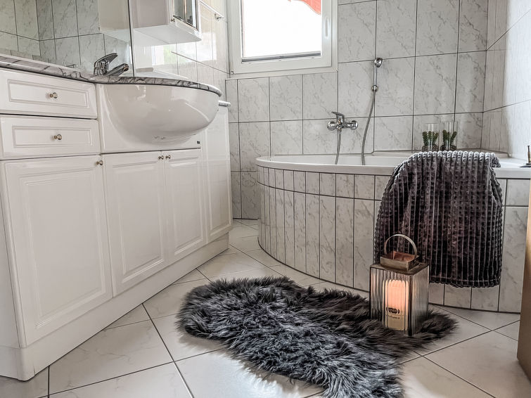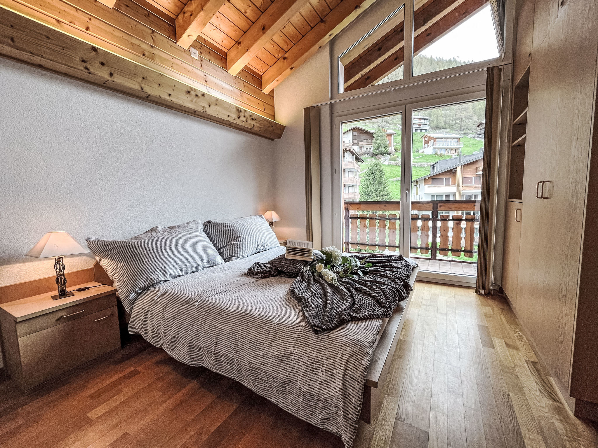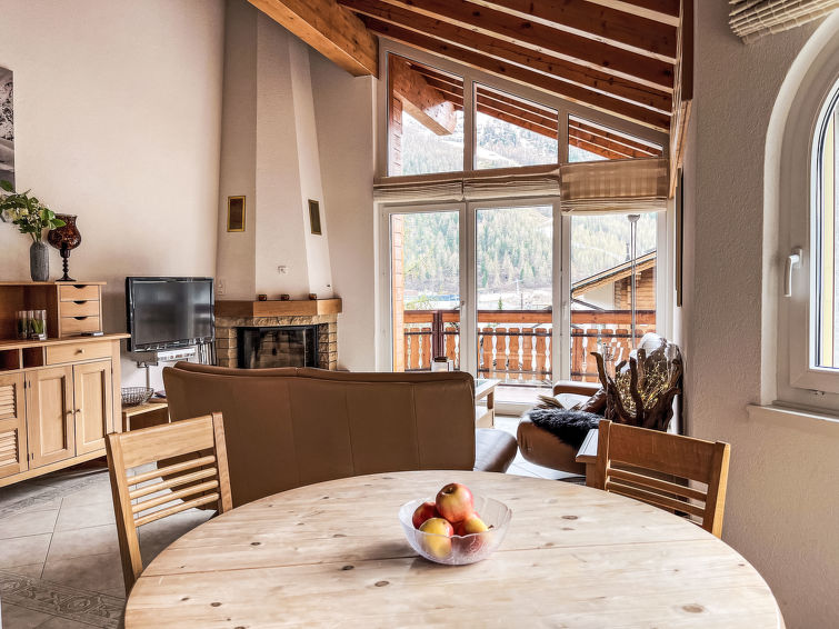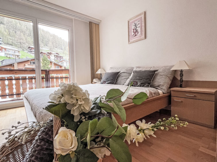 "Apartment Allalin", 3-Zimmer-Wohnung 85 m2 im 3. Stock. Schön und geschmackvoll eingerichtet: Wohn-/Esszimmer mit Esstisch und Kabel-TV. Ausgang zum Balkon. 2 Doppelzimmer, jedes Zimmer mit 1 Doppelbett (160 cm, Länge 200 cm). Offene Küche (Backofen, Geschirrspüler, 4 Glaskeramikplatten, Toaster, Wasserkocher, elektrische Kaffeemaschine). Bad/WC, Dusche/WC. Balkon. Balkonmöbel. Sicht auf die Berge. Zur Verfügung: Haartrockner. Internet (Wireless LAN, gratis). Bitte beachten: Nichtraucher-Unterkunft.