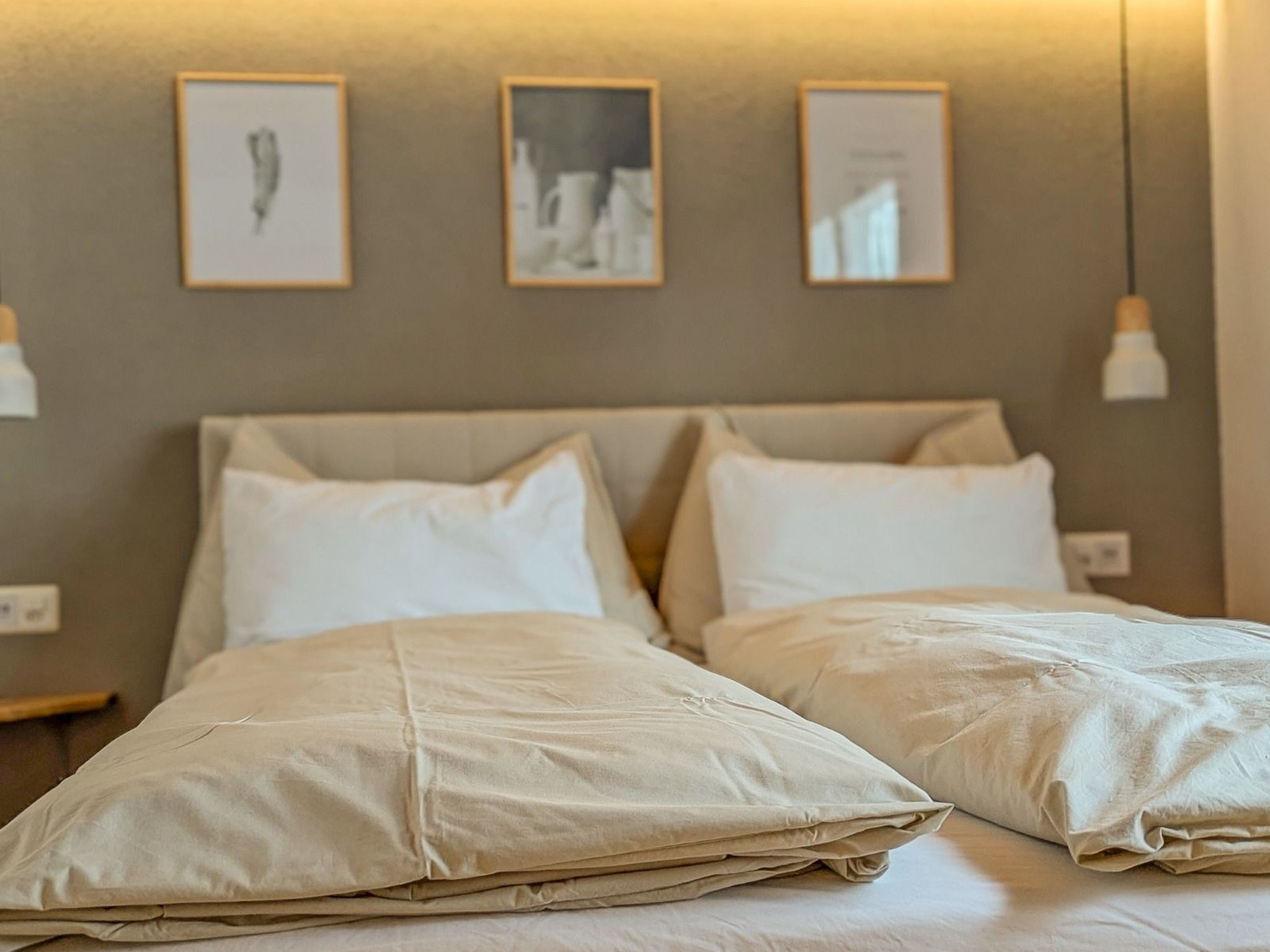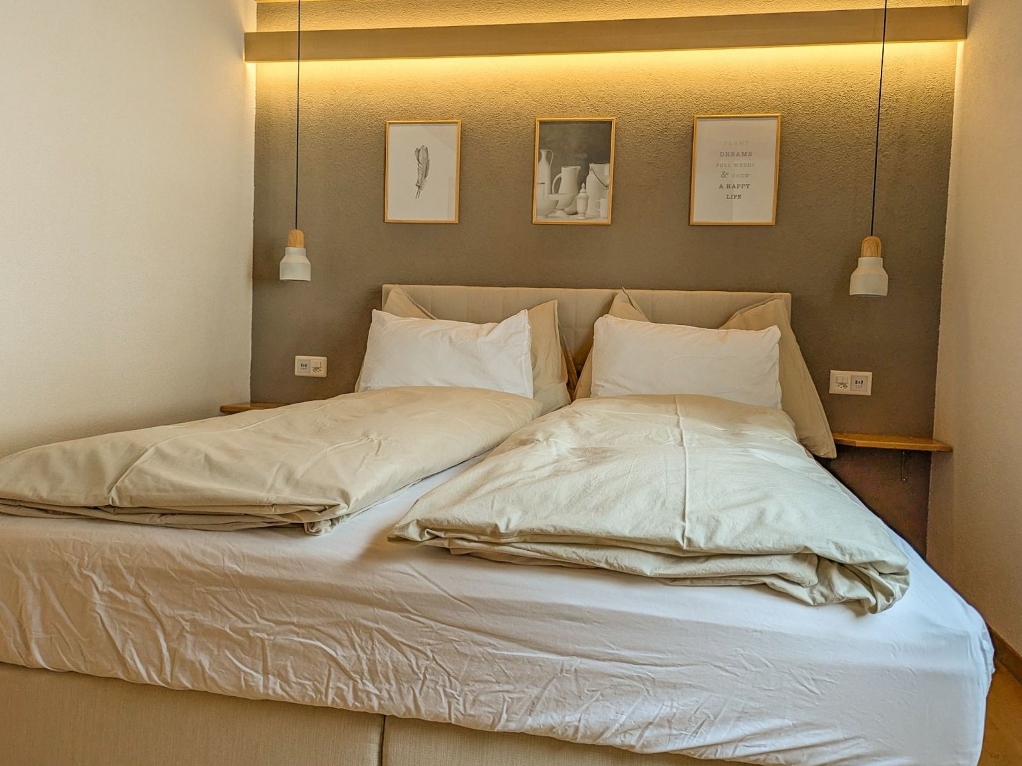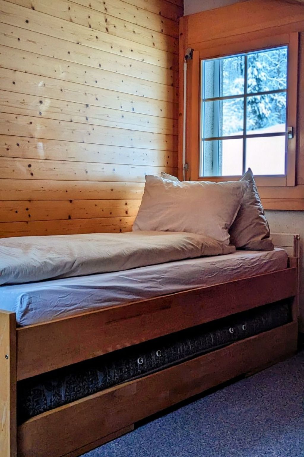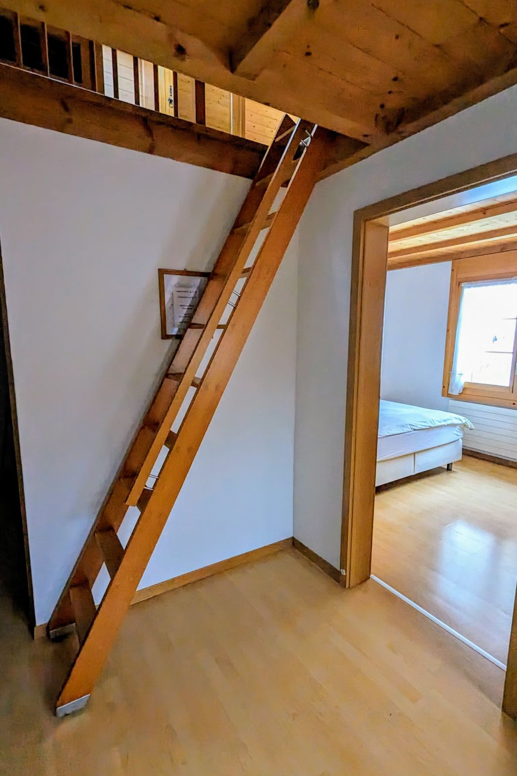 Es sind zwei Schlafzimmer vorhanden. Eines mit einem Doppelbett (160x200) und ein Dachzimmer mit drei Einzelbetten (Zugang über eine steile Treppe).