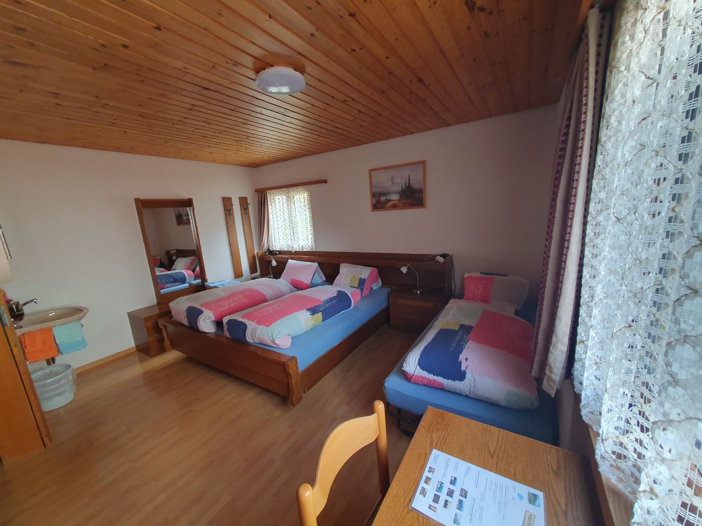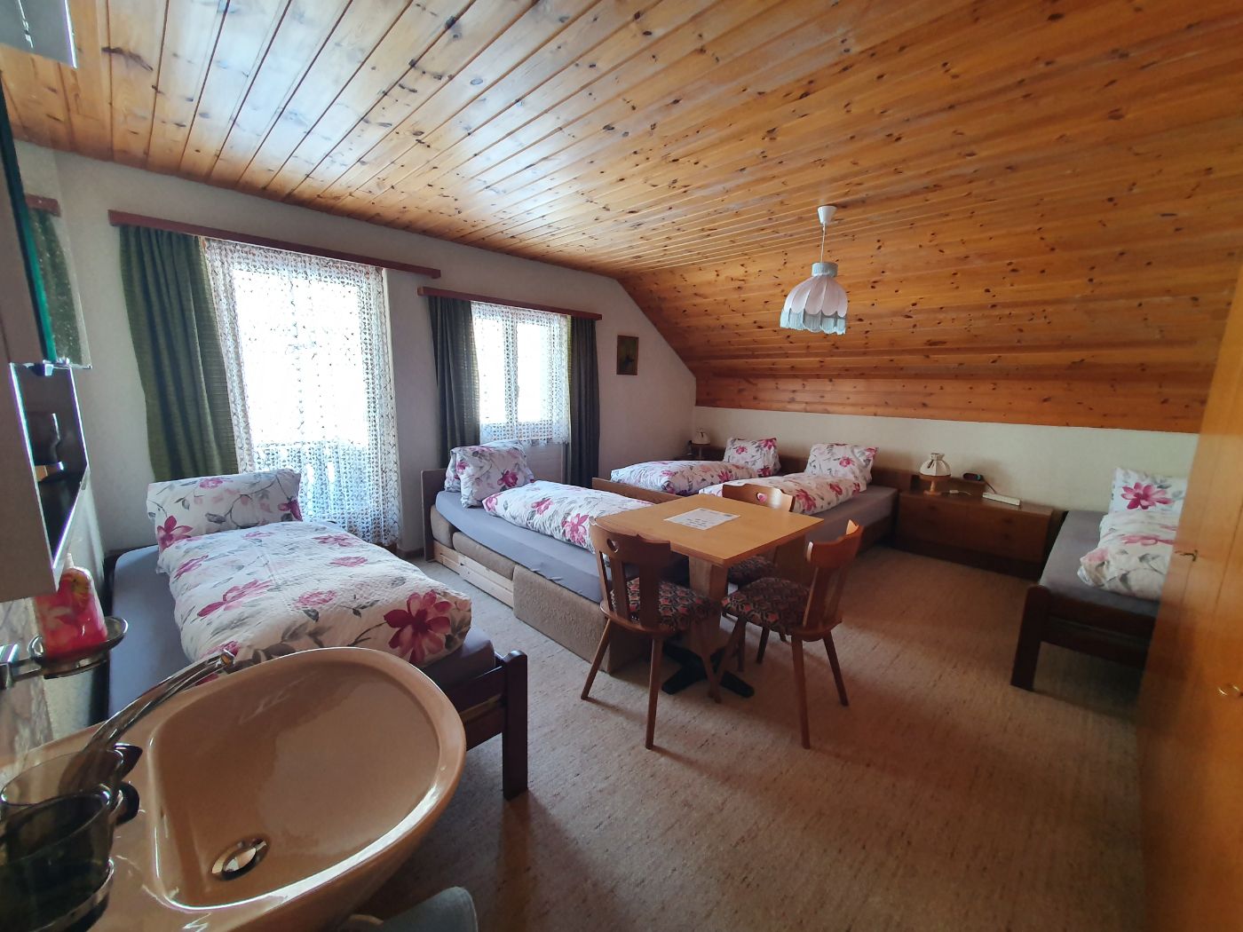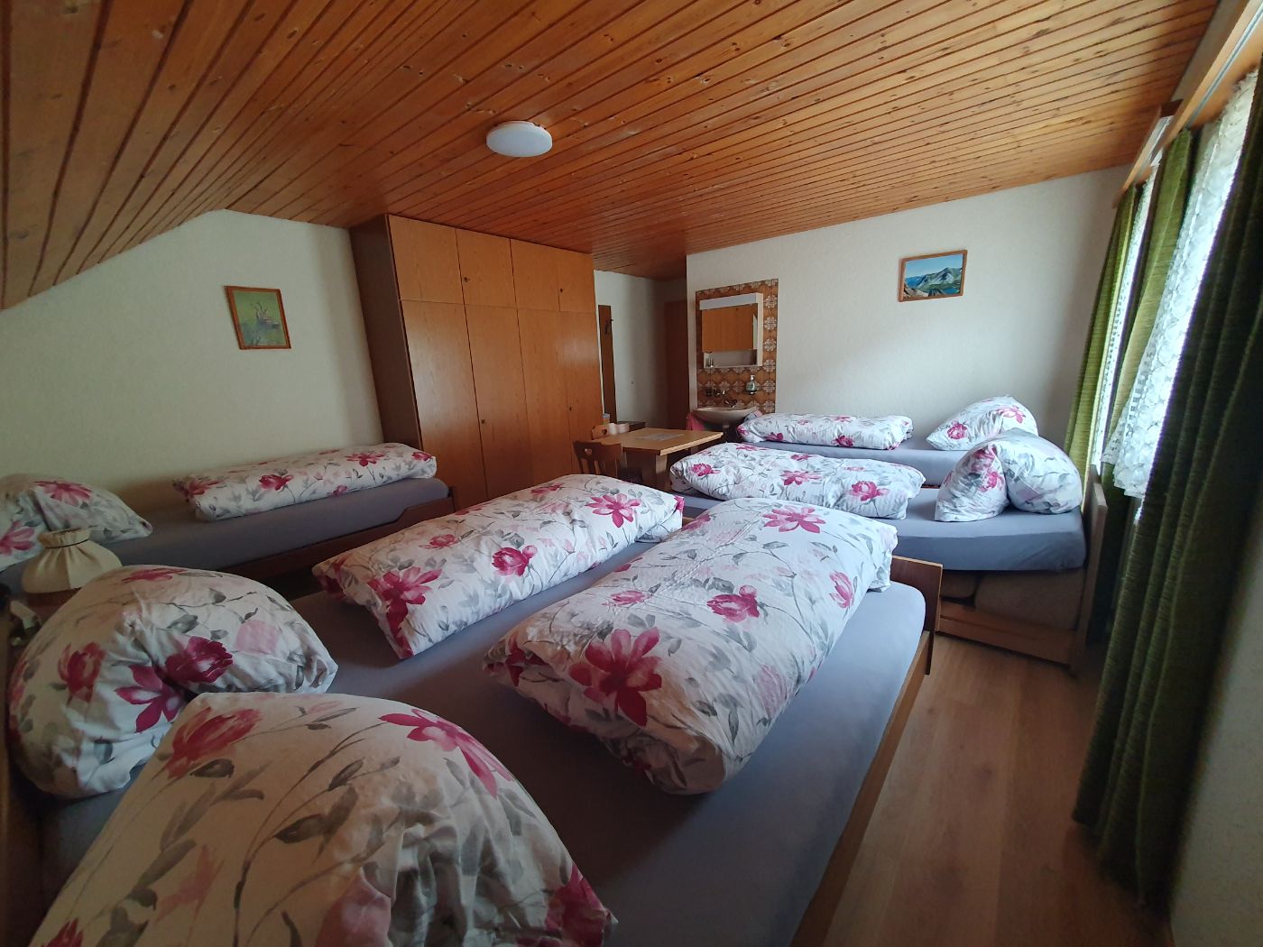 Im Haus stehen dir mindestens 3 Doppelzimmer (ab 5 Personen) zur Verfügung – auf Wunsch kannst du auf bis zu 5 Zimmer erweitern. Insgesamt erwarten dich 16 Schlafplätze: im Erdgeschoss drei Zimmer (jeweils mit Doppelbett/Einzelbetten und Extrabetten), im Obergeschoss zwei weitere Zimmer, darunter ein grosses Zimmer mit Doppelbett, zwei Einzelbetten und Extrabett.