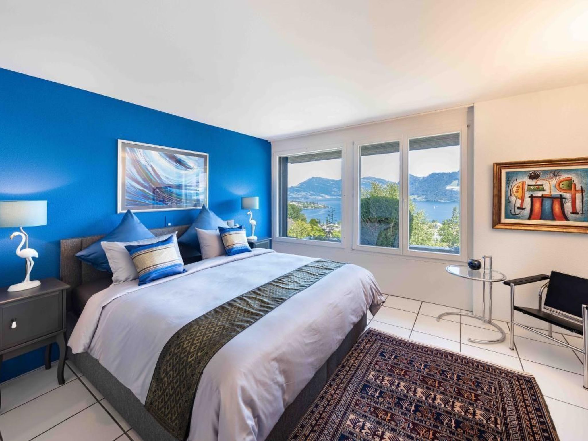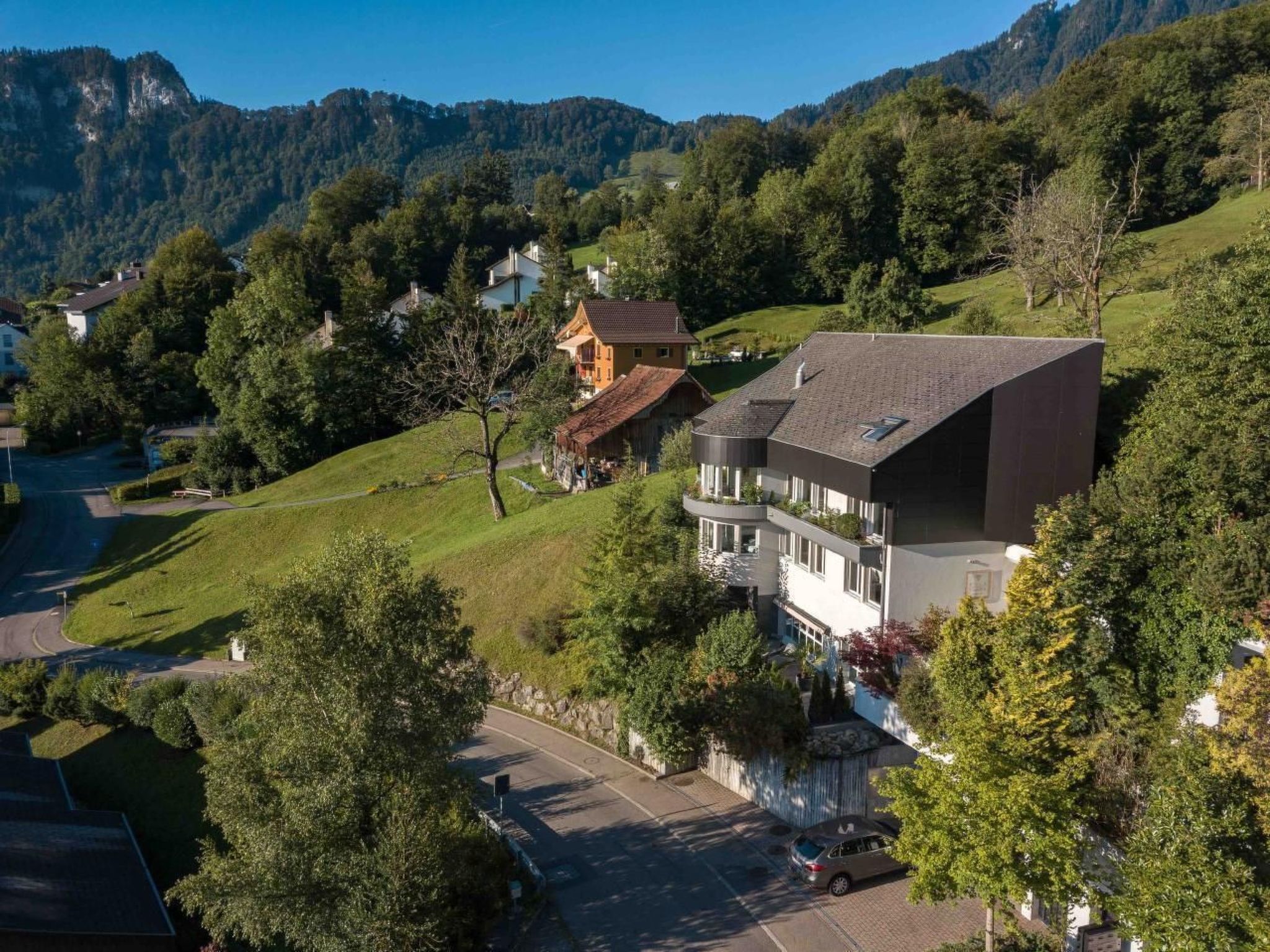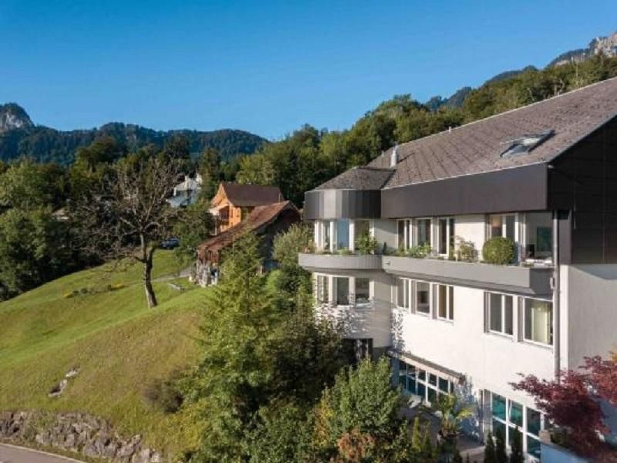 Villa Ysara - 7BR Luxus Pool Villa mit Blick auf den Vierwaldstättersee Die Villa Ysara befindet sich im Dorf Hergiswil, am westlichen Ufer des Vierwaldstättersees. Die Villa liegt hoch auf einem Hügel mit Blick auf den Vierwaldstättersee und das Dorf darunter. Sie befindet sich in einer ruhigen Gegend und ist dennoch nur 10-15 Autominuten von der historischen Luzerner Altstadt und nur 5 Autominuten von den Ufern des wunderschönen Sees entfernt. Der berühmte und majestätische Pilatus befindet sich weiter westlich und kann von der Villa aus gesehen werden. Die Villa Ysara verfügt über sieben Schlafzimmer mit eigenem Bad in verschiedenen Mietkonfigurationen. Der Baustil ist modern, doch die Inneneinrichtung ist eine Mischung aus Moderne, Antiquitäten und Kunst des 20. Jahrhunderts. Jahrhunderts. Das Haus ist komfortabel und gemütlich, aber dennoch sehr luxuriös, und es ist durchweg sehr geräumig. Mit seinen sieben Schlafzimmern und den komfortablen Wohnräumen, die sich über vier Etagen verteilen, ist es der ideale Ort für große Gruppen oder Familien, um Luxus und Komfort zusammen mit der schönsten Kulisse, die man sich vorstellen kann, in einer der begehrtesten Gegenden der Schweiz zu genießen. Auch wenn Sie nicht immer Lust haben, diesen besonderen Ort zu verlassen, gibt es in der Umgebung viele Attraktionen, die einen Besuch wert sind und die Sie leicht erreichen können, sei es mit dem Auto, dem Zug oder dem Schiff. Zusätzlich zu den Innenräumen gibt es ausreichend Sitz- und Essgelegenheiten im Freien, einschließlich eines Grillplatzes, um die jahreszeitlichen Veränderungen des Wetters zu nutzen. Die Villa wurde von den renommierten Reinhard Architekten entworfen und fügt sich sehr gut in die Hanglage ein, wobei die Grundstücksfläche maximal ausgenutzt und die unglaubliche Aussicht maximiert wurde. Die Eigentümer haben die Villa mit aus der ganzen Welt gekauften und gesammelten Gegenständen eingerichtet und dekoriert. In der Villa Ysara gibt es keinen Mangel an Außenwohnbereichen. Es gibt drei verschiedene Außenwohnbereiche, die Sie während Ihres Aufenthalts genießen können. Im zweiten Stock, wenn Sie aus dem Hauptwohnzimmer heraustreten, befindet sich ein Sitz- und Essbereich im Freien mit Grillmöglichkeiten. Dieser Bereich geht L-förmig in einen Bar- und Unterhaltungsbereich über, der sich hinter der Küche befindet und mit einem Weinkühlschrank und einer Tischtennisplatte ausgestattet ist, an der Sie Ihren Wettkampfgeist testen können. Im dritten Stock befindet sich eine große Außenterrasse mit Liegestühlen, von denen aus Sie die Aussicht und die frische Bergluft genießen können. In der ersten Etage, in der sich das Indoor-Schwimmbad, die Sauna und der Fitnessbereich befinden, gibt es einen Außensitzbereich mit Liegestühlen, damit Sie während Ihres Aufenthalts die Sonne, die Entspannung und den Komfort genießen können. Die Villa Ysara wurde so konzipiert, dass sie die Vorteile ihrer ruhigen und herrlichen Lage hoch über dem Vierwaldstättersee voll ausschöpft und dennoch in der Nähe all dessen liegt, was die Gegend zu bieten hat. Der Architekt hat das Grundstück optimal genutzt, um den schönsten Panoramablick auf den See und die umliegenden Berge zu ermöglichen. Es gibt einen kostenlosen Shuttle-Bus von der Villa zum Bahnhof.