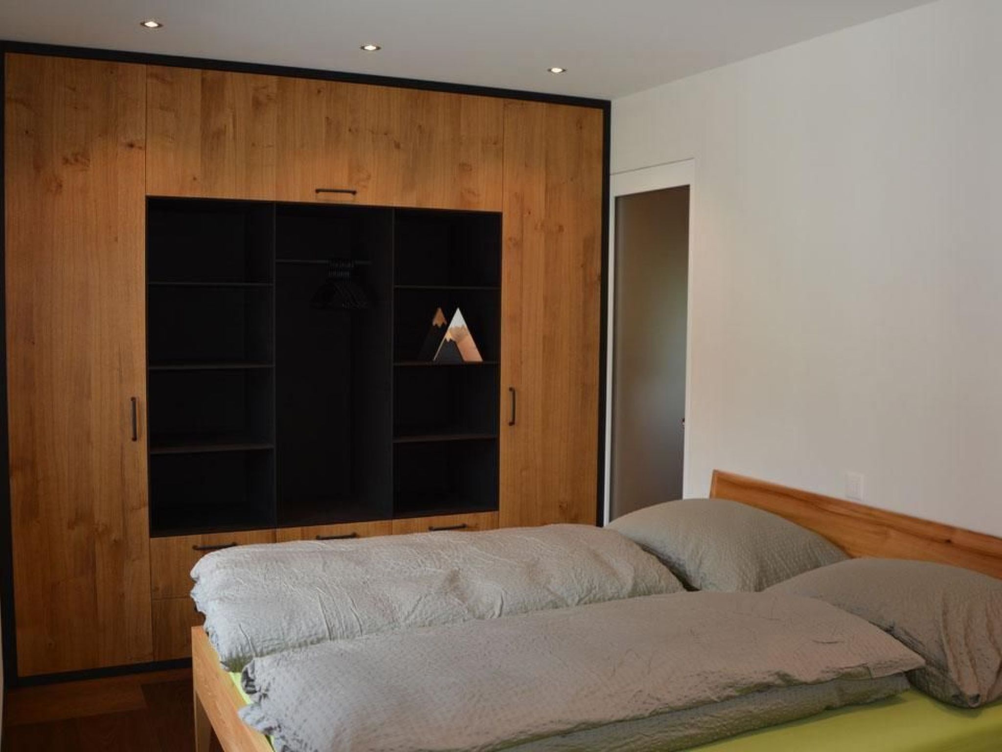 Elternzimmer mit Doppelbett, Babyreisebett vorhanden (kostenlos), grosser Einbauschrank mit viel Stauraum und Garderobe. Direkter Zugang zum Bad.