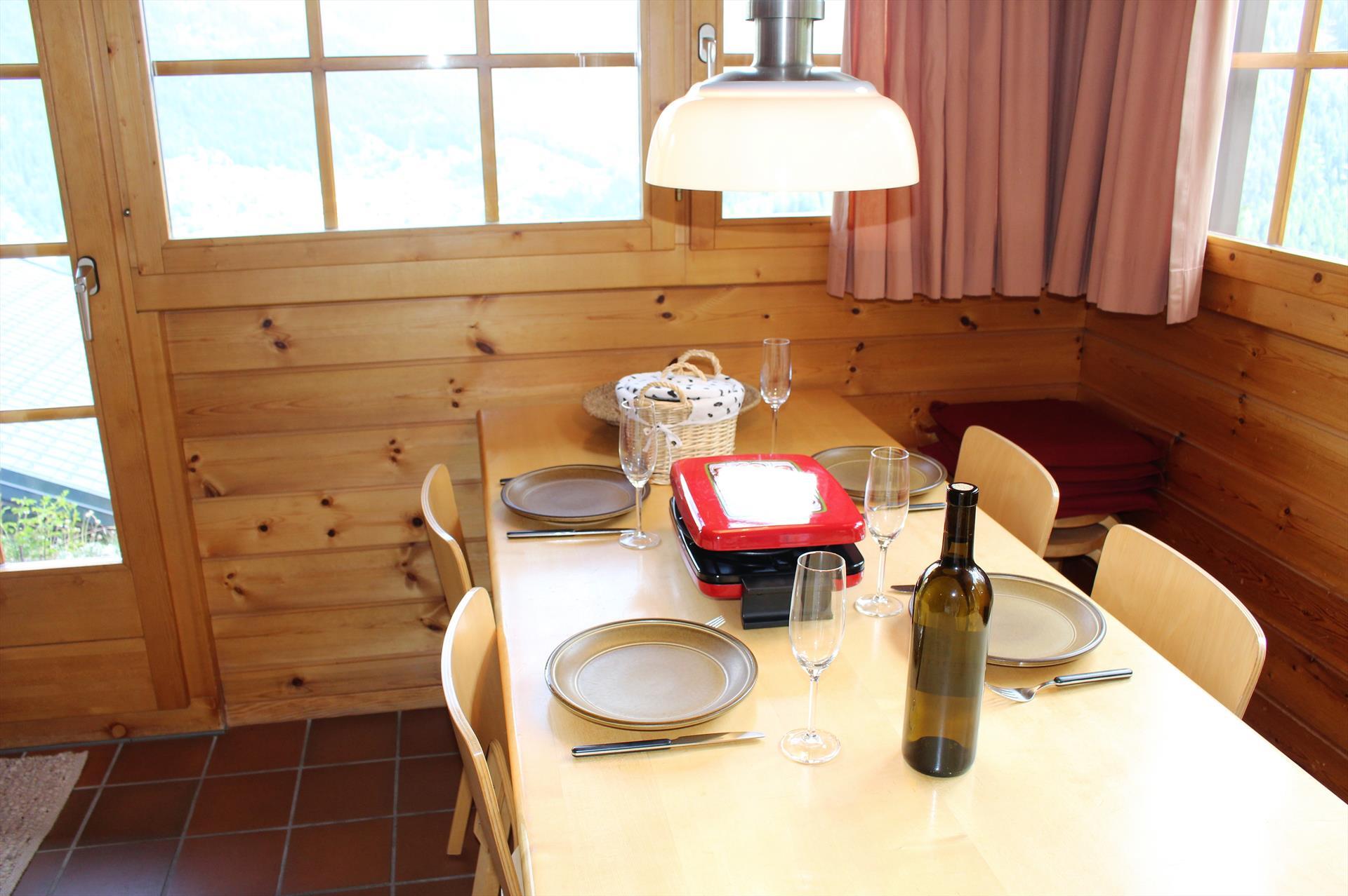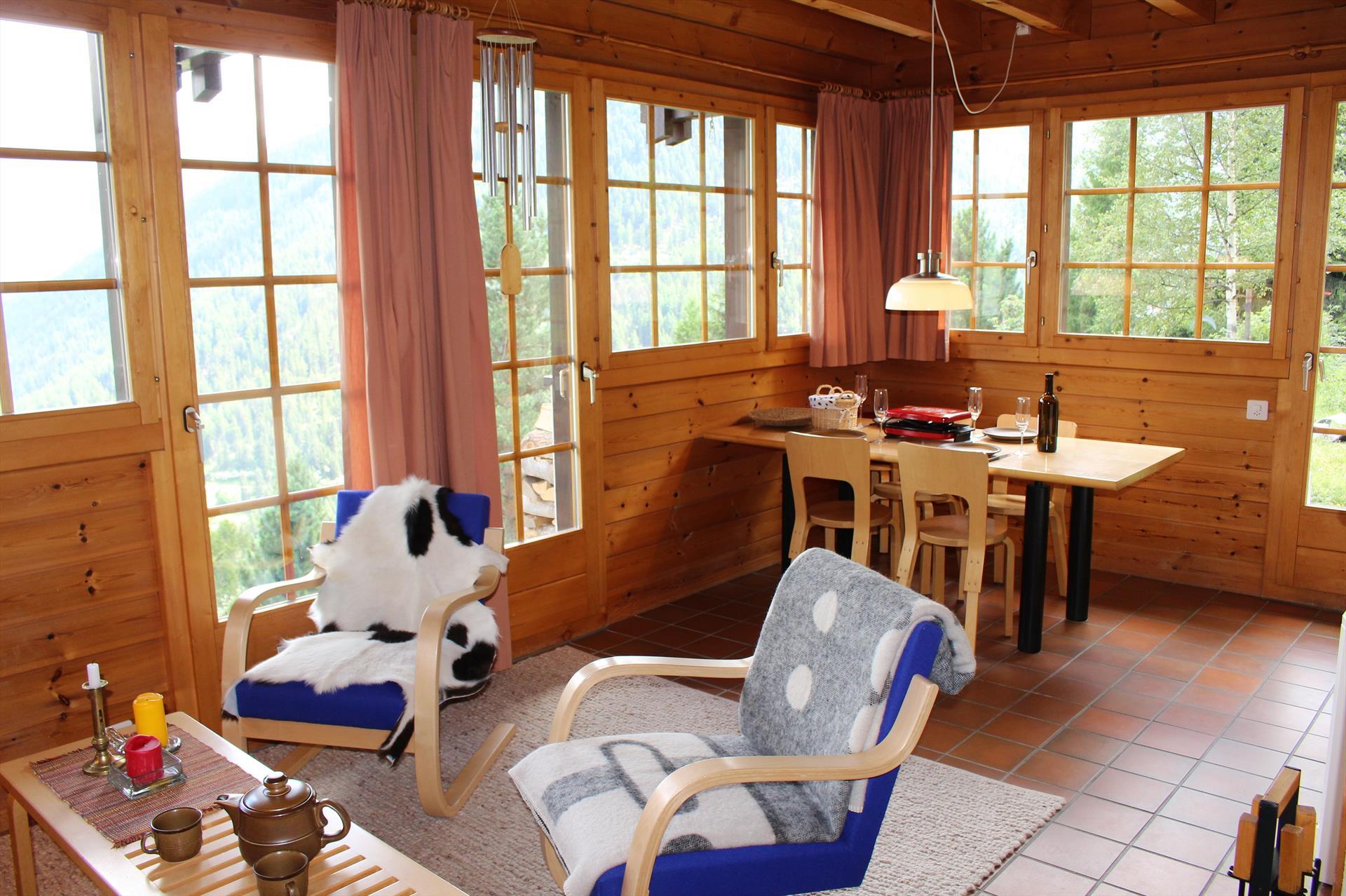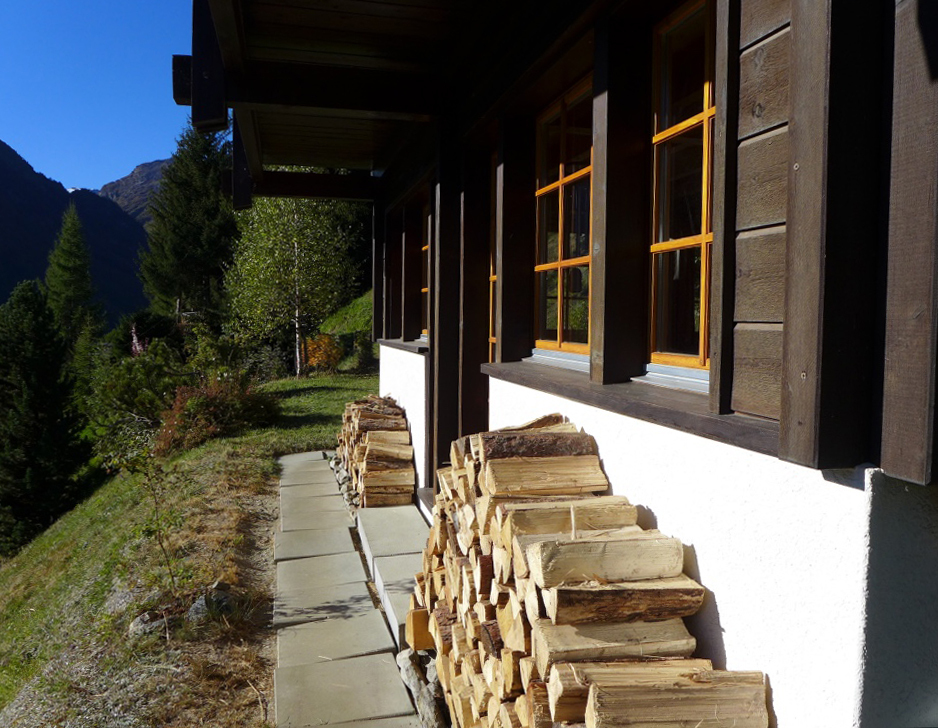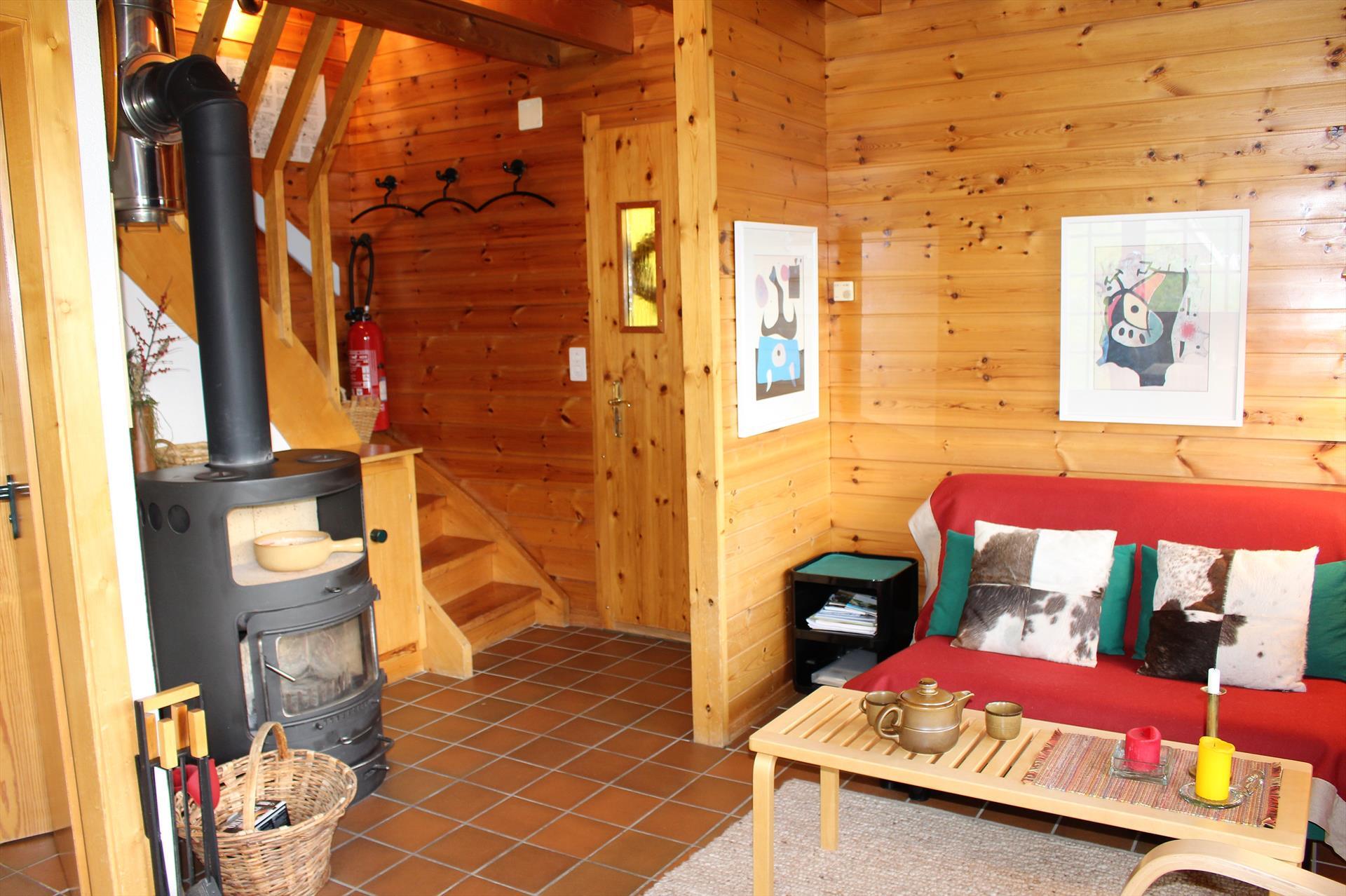 Komfortables Chalet für 4 Personen : Wohnraum mit Schwedenofen (Heizung Elektrizität/Holz - Holz wird gestellt) - 1 Doppelbettzimmer - 1 2-Bettzimmer - Küche mit Spülmaschine und Nespresso Kaffeemaschine - Dusche / WC - WC - Süd-Ostterrasse und Rasen - TV/DVD - kostenloser Internetanschluss WIFI - 1 Aussenparkplatz - Zugang über Weg - Tiere nicht erlaubt - Nichtraucher