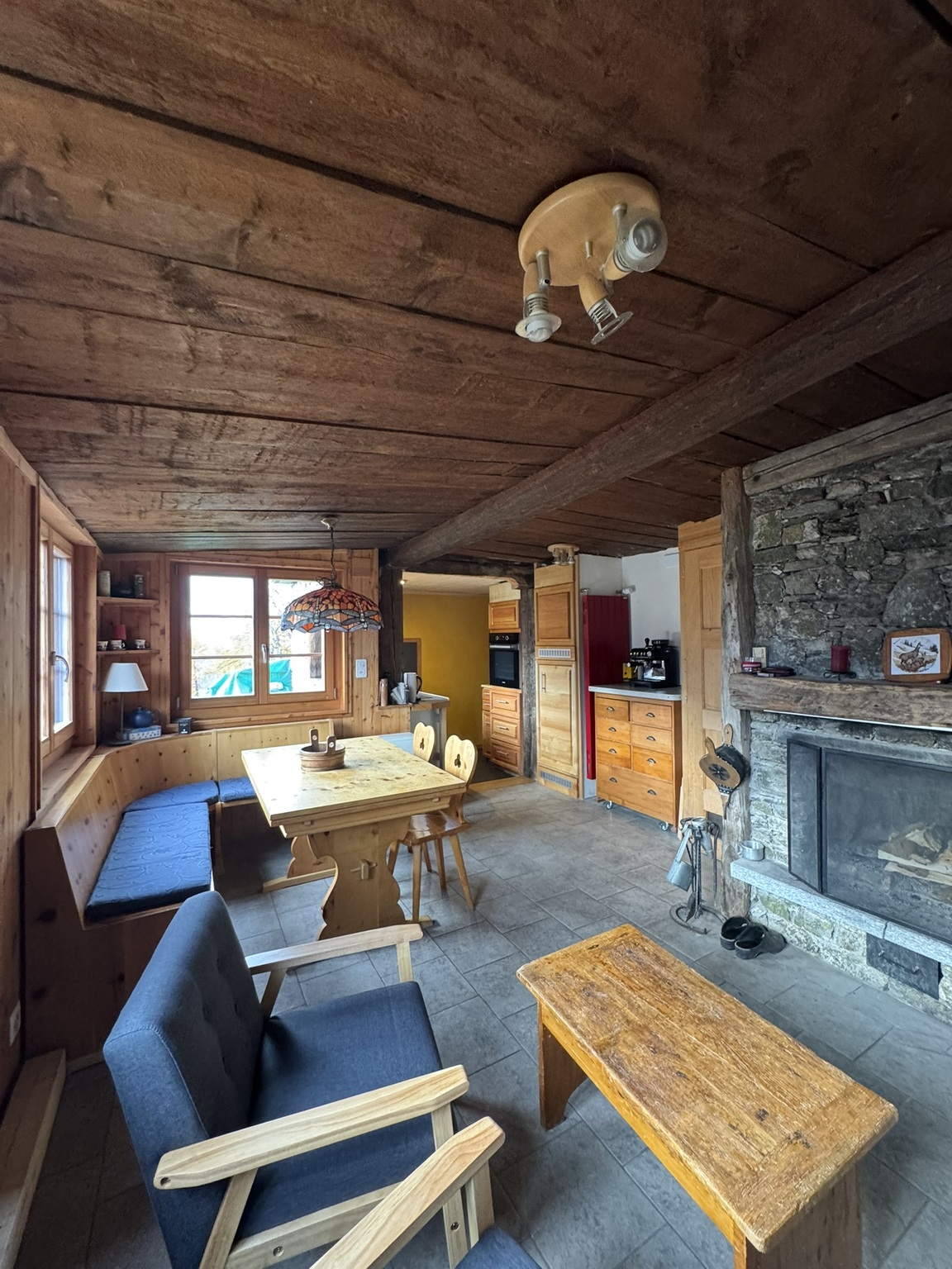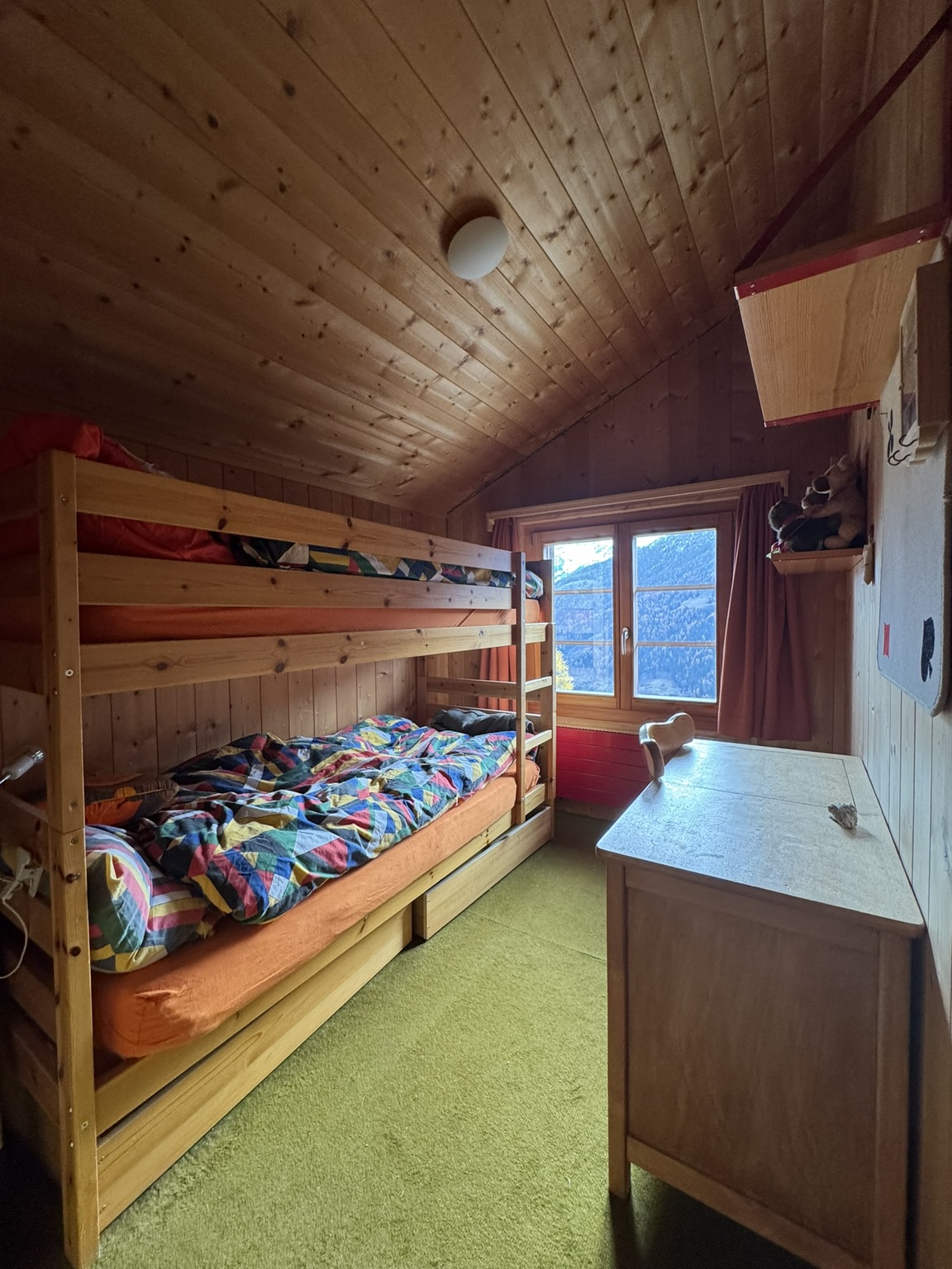 Geräumiges Chalet für 6 Personen, ruhig, mit herrlicher Aussicht.Innen: Wohnzimmer, Küchenbereich, 2-Sitzer-Sofabereich mit Kamin, 3 Schlafzimmer. - < Schlafzimmer / > Schlafzimmer: 3 Schlafzimmer im Obergeschoss: Zwei Doppelzimmer (1 Doppelbett 140 x 200 cm und 1 Doppelbett 135 x 195 cm), ein Schlafzimmer mit 1 Etagenbett (90 x 190 cm)-< / > Sanitäre Einrichtungen: Erdgeschoss: 1 Badezimmer mit Waschbecken, Bad und Toilette. Oben: 1 Bad mit Dusche und WC. < / > Küche: Ausgestattet mit Elektroherd, Geschirrspüler, Dunstabzug, Ofen, Wasserkocher, Kaffeemaschine, Raclette-Ofen, Fondueherd, chinesischem Fondue-Set.-Verschiedenes: Haustiere erlaubt, WLAN, Fernseher, viele Kindereinrichtungen (Kinderbett, Sitzerhöhung usw.). Ein großer Schließfach für Skier steht am Abfahrtszug der Standseilbahn kostenlos zur Verfügung.Zugang zum Chalet zu Fuß über einen sanft abfallenden Gang; Schneebedeckter Weg im Winter. 2 Parkplätze stehen 150 Meter vom Chalet entfernt zur Verfügung
