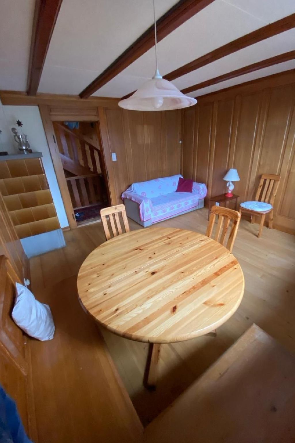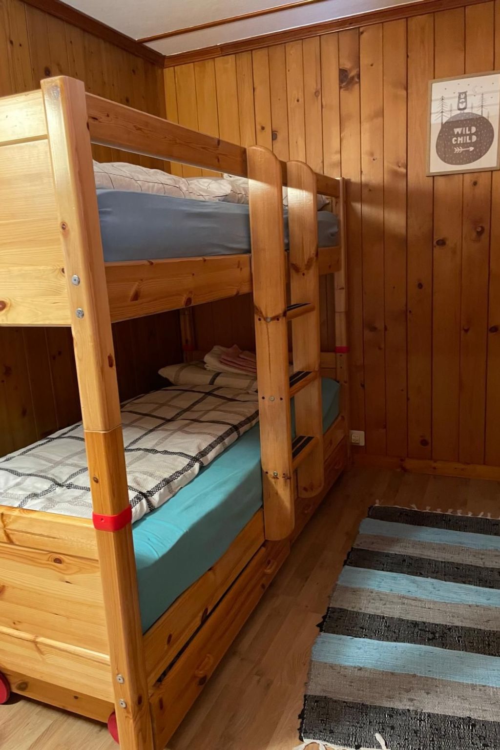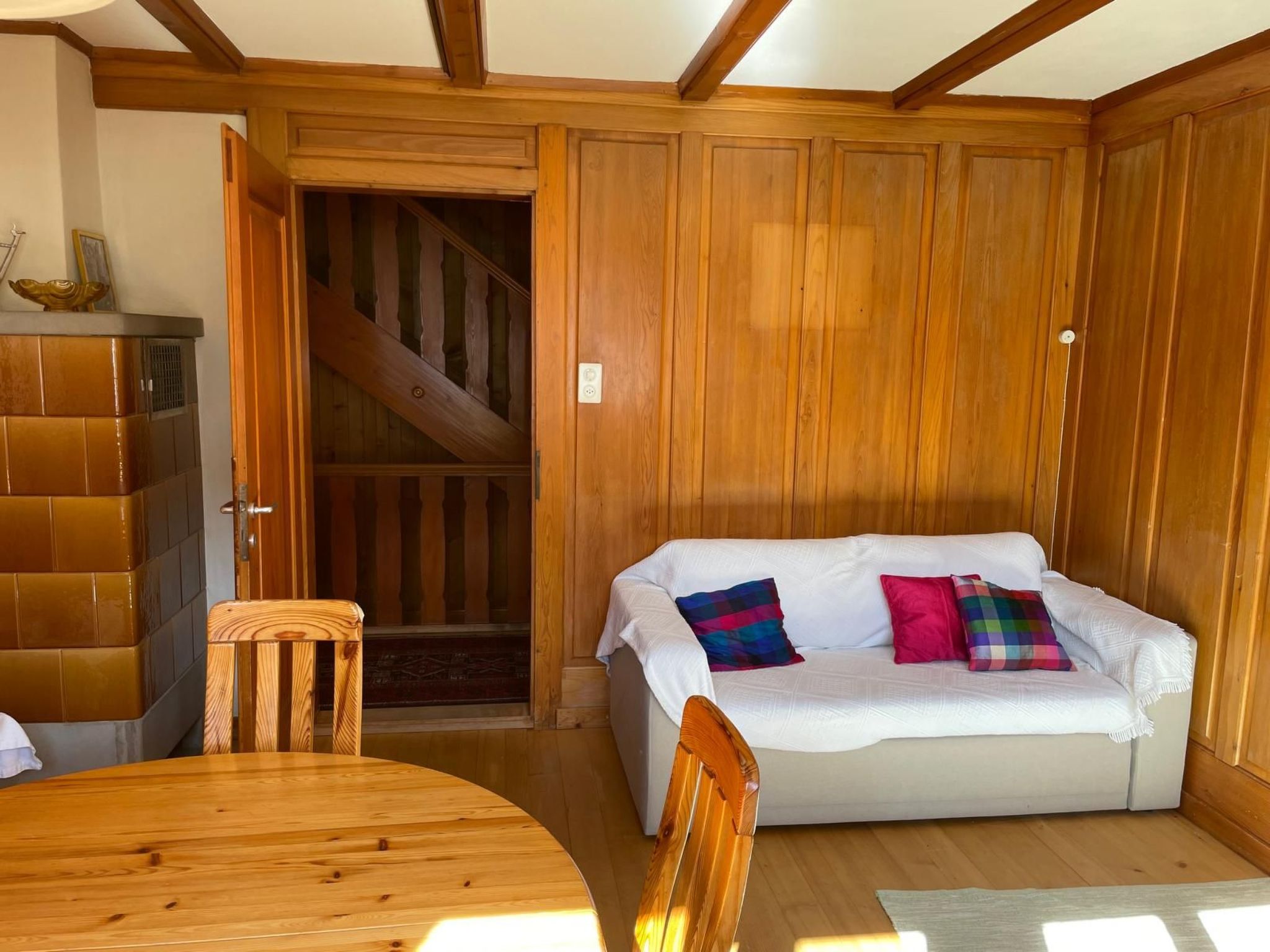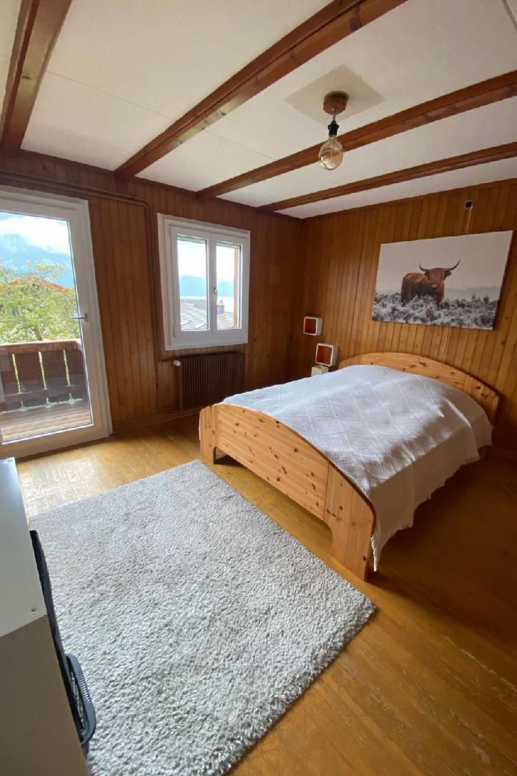 Wer das Einfache, Urige mag und Natur, Ruhe und eine Traumsicht über luxuriöse Ausstattung stellt, ist hier genau richtig. 2 Schlafzimmer (1x Doppelbett, 1x Kajütenbett) sowie ein 3. Schlafzimmer im Dachstock mit 2 Einzelbetten nur auf Anfrage gegen Aufpreis. Stube, Bad/WC, Küche mit Kaffeemaschine, Kühlschrank, Standard-Gewürzen, grosser überdachter Balkon, Garten zur Nutzung. Im Kinderzimmer hat es diverse Spiele und Bücher und div. Spielsachen zum Nutzen.