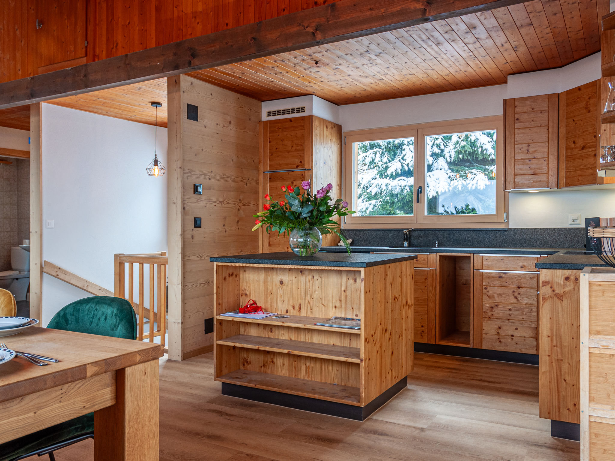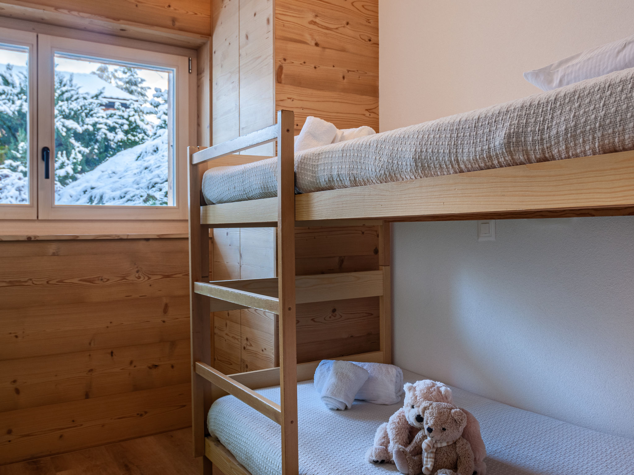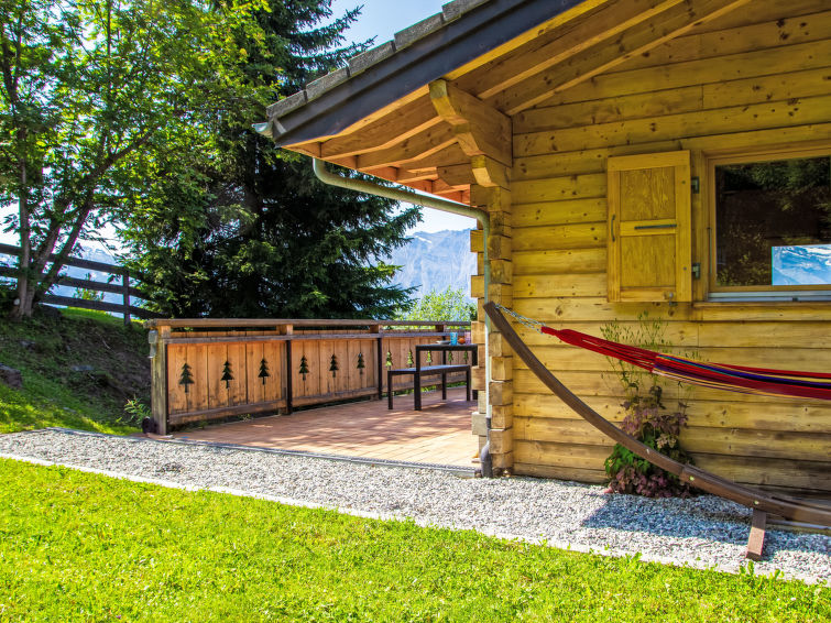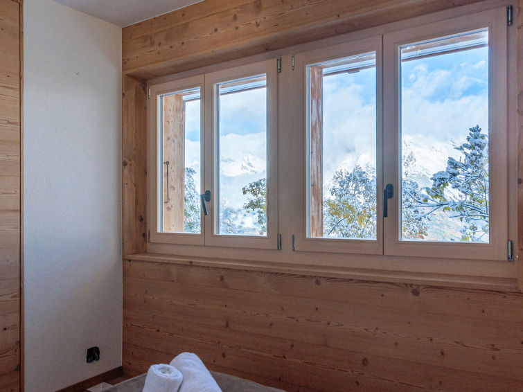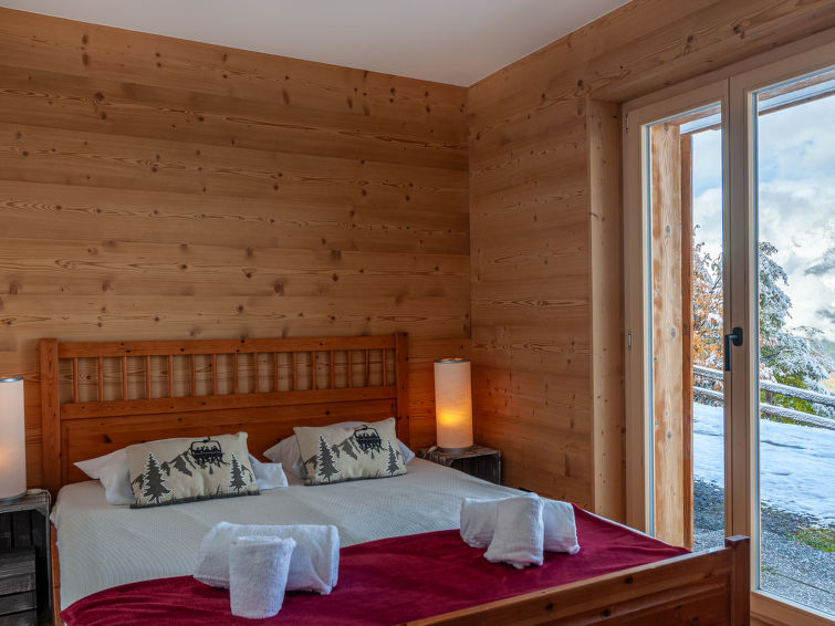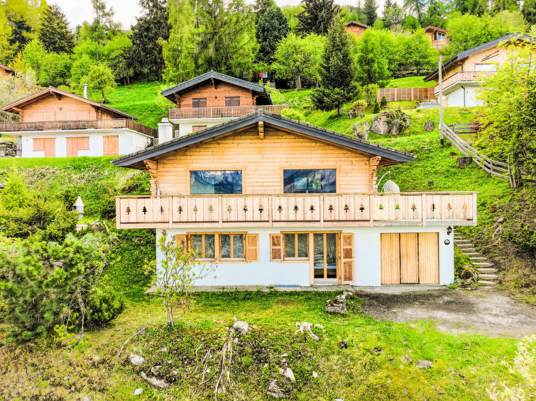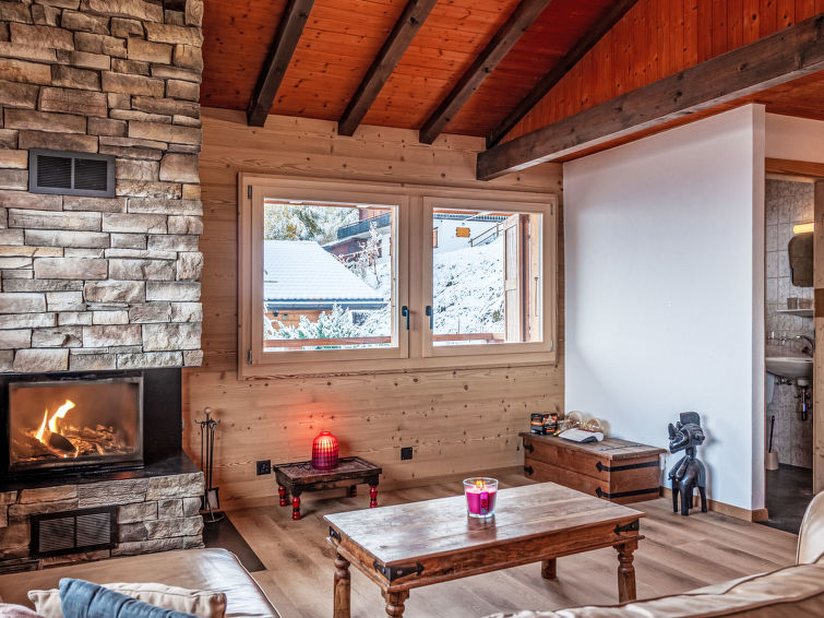 "Le Loup, le Renard et la Belette", 4-Zimmer-Chalet 96 m2 auf 2 Stockwerken. Renoviert im Jahre 2023, komfortabel und schön eingerichtet: grosses Wohn-/Esszimmer mit offenem Kamin. Ausgang zum Balkon, zur Terrasse, Richtung Norden. Offene Küche (Backofen, Geschirrspüler, 4 Glaskeramikplatten, Toaster, Wasserkocher, elektrische Kaffeemaschine, Kapseln für die Kaffeemaschine (nespresso) extra, Racletteofen, Fondue Set (Chinoise, Käse)). Sep. WC. Unteres Geschoss: 1 Zimmer mit 1 franz. Bett (140 cm, Länge 190 cm). 1 kleines Kinderzimmer mit 1 x 2 Etagenbetten (90 cm, Länge 190 cm). 1 Zimmer mit 1 franz. Bett (160 cm, Länge 200 cm). Ausgang zur Terrasse. Dusche/WC. Fussbodenheizung. Schöne Sicht auf die Berge und das Tal. Zur Verfügung: Waschmaschine. Internet (Wireless LAN, gratis). Parkplatz (2 Autos). Bitte beachten: Nichtraucher-Unterkunft.