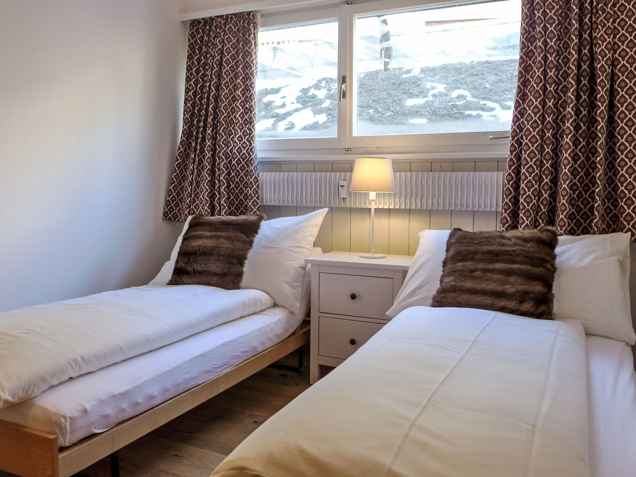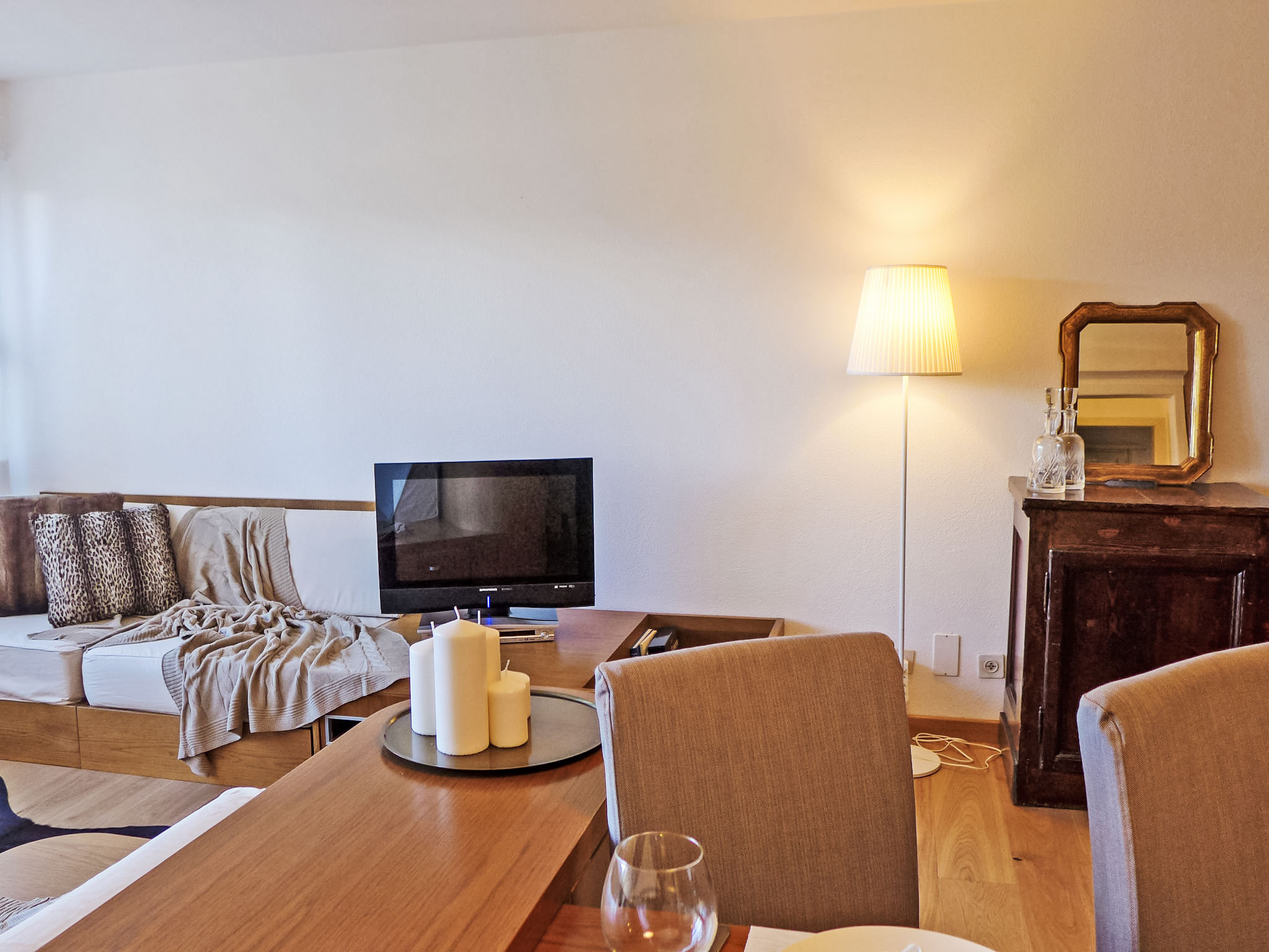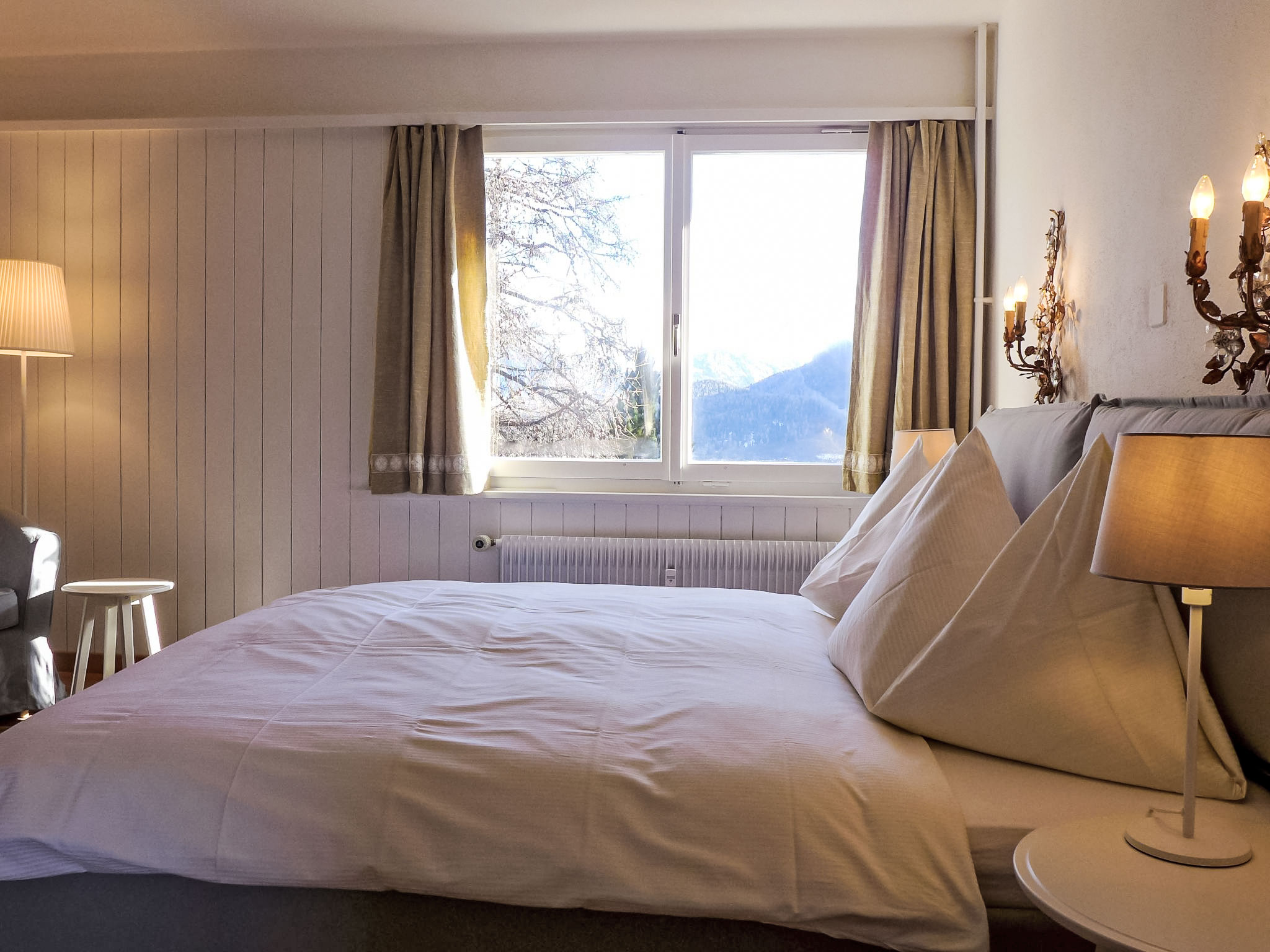 "Chesa Cripels I", 3-Zimmer-Wohnung 75 m2 im 2. Stock, Ostlage. Geräumig und hell, teilweise renoviert im Jahre 2016, modern und gemütlich eingerichtet: Wohn-/Esszimmer mit Sat-TV (Flachbildschirm), DVD. 1 grosses Zimmer mit 2 Betten (90 cm, Länge 200 cm), Dusche/Bidet/WC. 1 kleines Zimmer mit 2 Betten (90 cm, Länge 200 cm). Kleine Küche (4 Kochplatten, Backofen, Geschirrspüler, Toaster, Wasserkocher, elektrische Kaffeemaschine, Kapseln für die Kaffeemaschine (Nespresso) extra). Dusche/WC. Parkettboden. Herrliche Panoramasicht auf den See und die Berge. Zur Verfügung: Haartrockner. Internet (Wireless LAN, gratis). Garage Nr. 4 auf dem Grundstück, Höhe 205 cm, Breite 240 cm. Bitte beachten: geeignet für Familien. Nichtraucher-Unterkunft. Maximal 1 Haustier/Hund erlaubt. Kein Fahrstuhl.