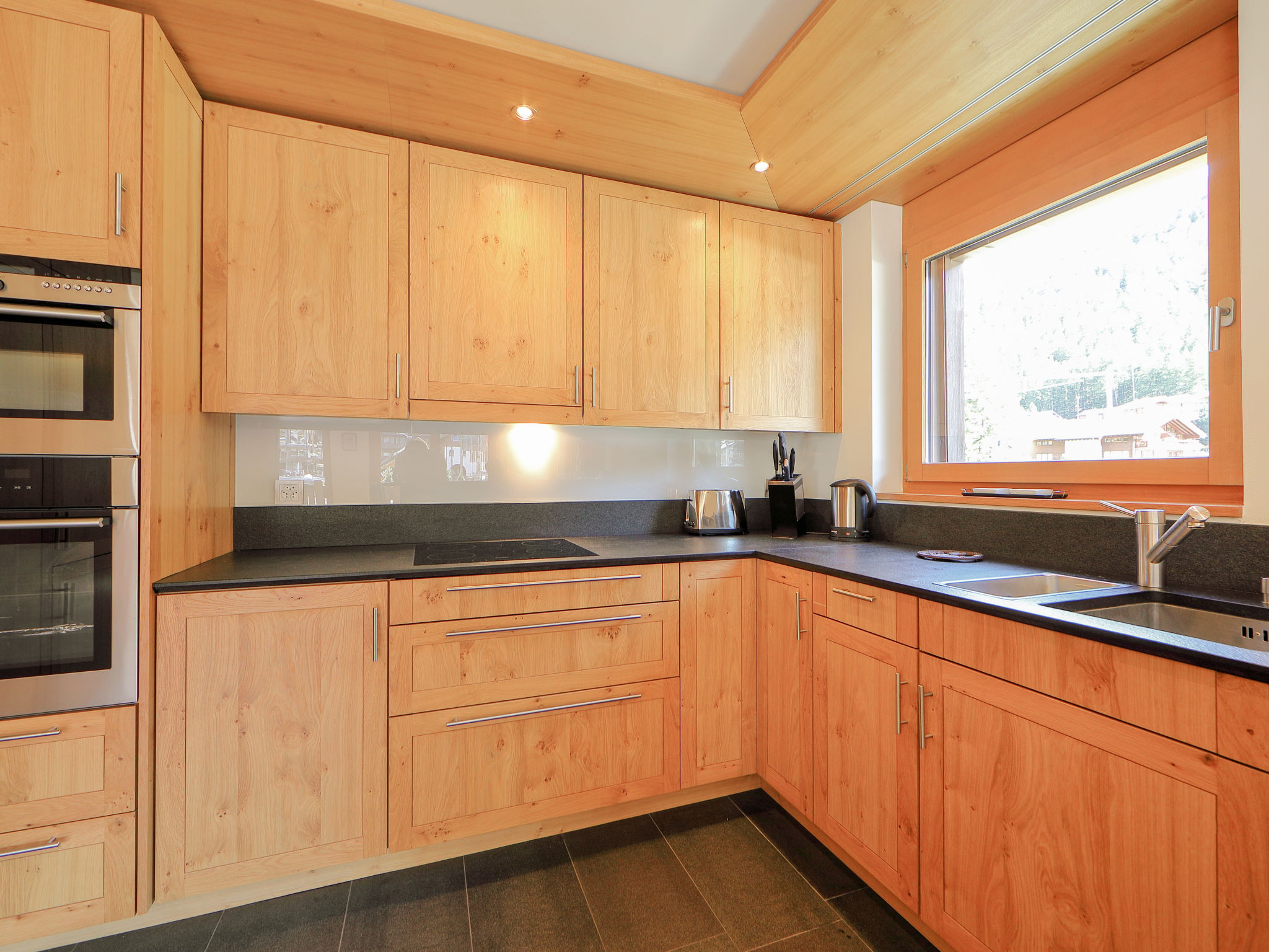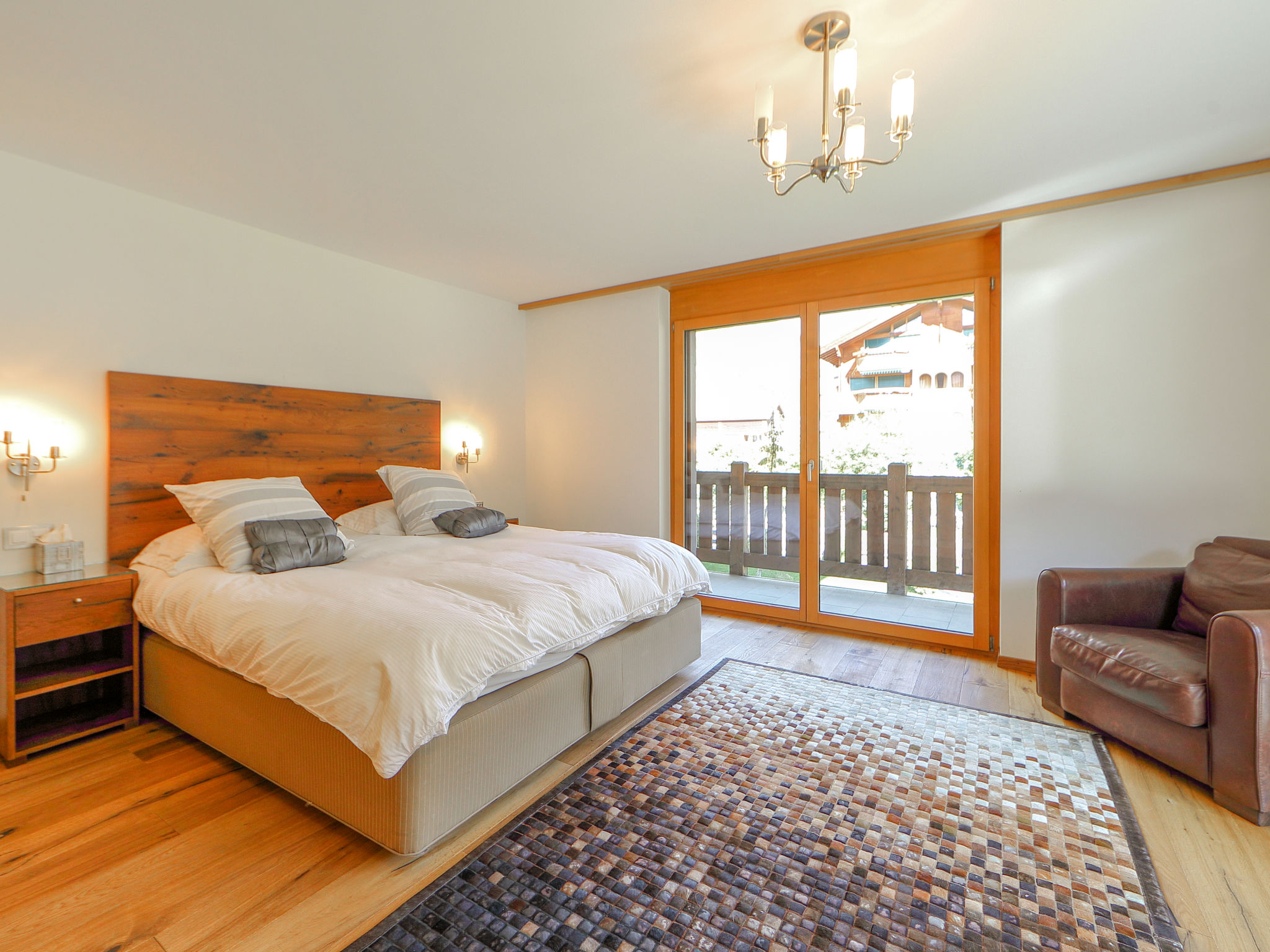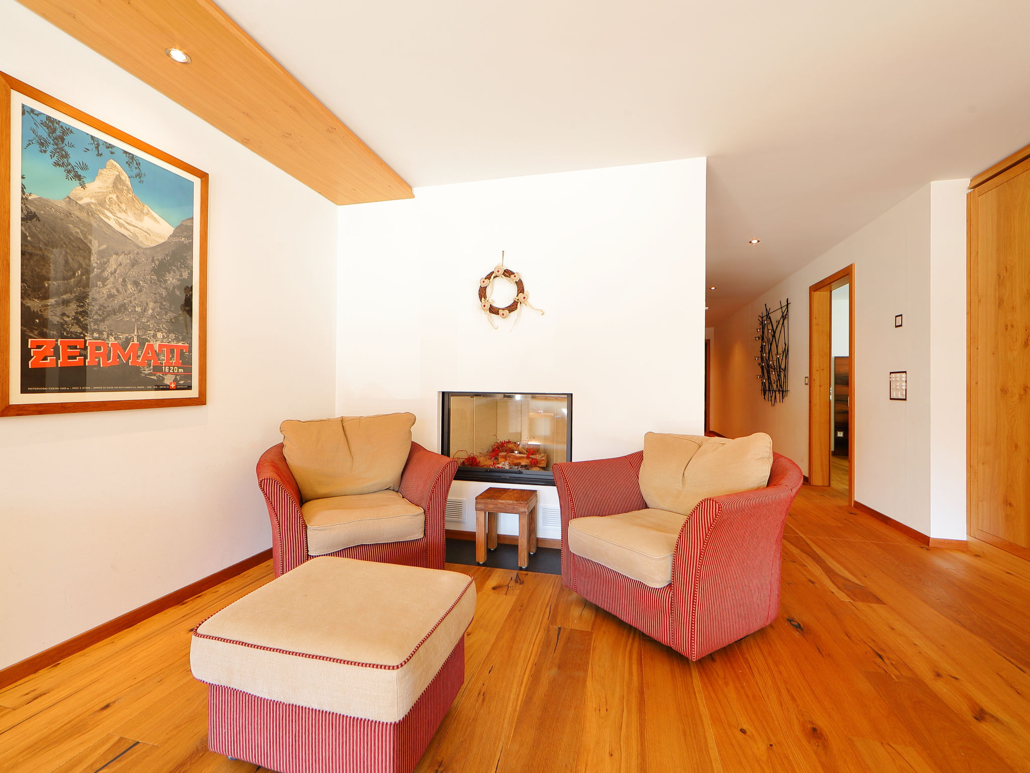 4-Zimmer-Wohnung 200 m2 im 1. Stock, Südostlage. Geräumig und hell, schön und modern eingerichtet: Wohn-/Esszimmer mit offenem Kamin (nur Deko), Esstisch und TV. Ausgang zum Balkon, Richtung Süden und Richtung Osten. 1 Doppelzimmer mit 1 Doppelbett (1 x 160 cm, Länge 200 cm), Dusche/WC. 1 Doppelzimmer mit 1 Doppelbett (1 x 180 cm, Länge 200 cm), Bad/Dusche/WC und TV. Ausgang zum Balkon, Richtung Osten und Richtung Norden. 1 Doppelzimmer mit 1 Doppelbett (1 x 140 cm, Länge 200 cm). Ausgang zum Balkon, Richtung Norden. Grosse, offene Küche (Backofen, Geschirrspüler, 4 Glaskeramikplatten, Toaster, Wasserkocher, Mikrowelle, Tiefkühler, elektrische Kaffeemaschine, Racletteofen, Fondue Set (Chinoise, Käse)). Bad/WC. Fussbodenheizung. Balkon, Südlage und Ostlage Balkon, Nordlage und Ostlage. Balkonmöbel. Schöne Sicht auf das Matterhorn. Zur Verfügung: Waschmaschine, Wäschetrockner, Haartrockner. Internet (Wireless LAN, gratis). Bitte beachten: Nichtraucher-Unterkunft.