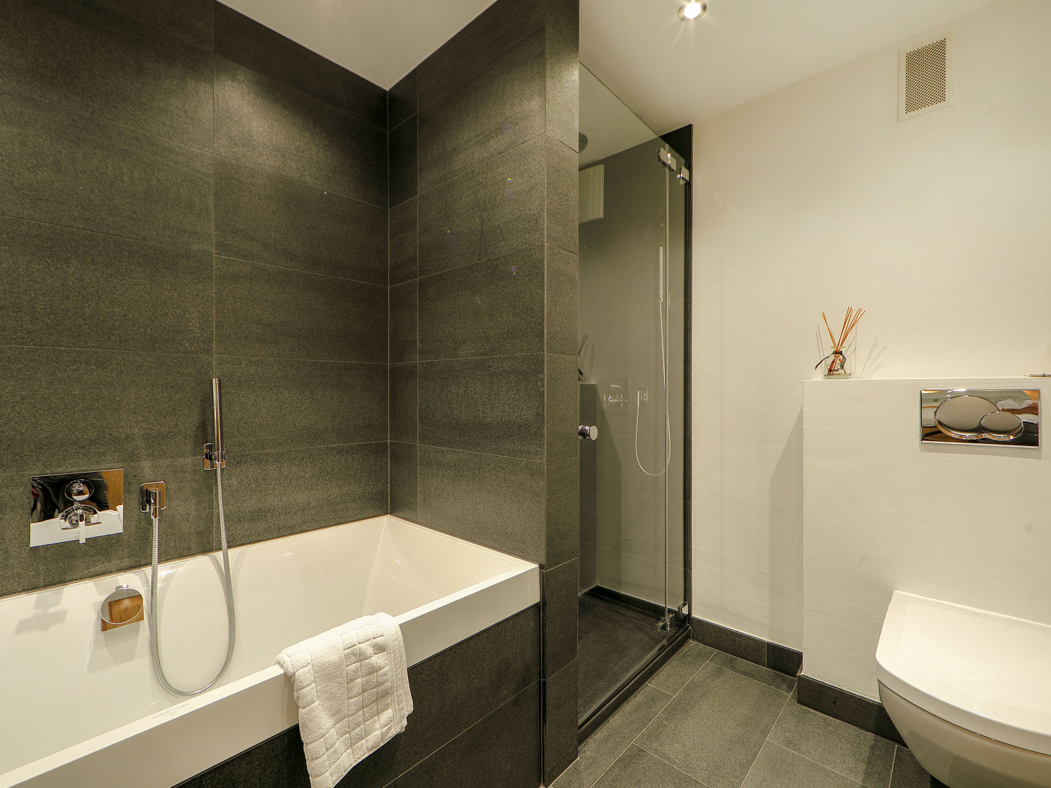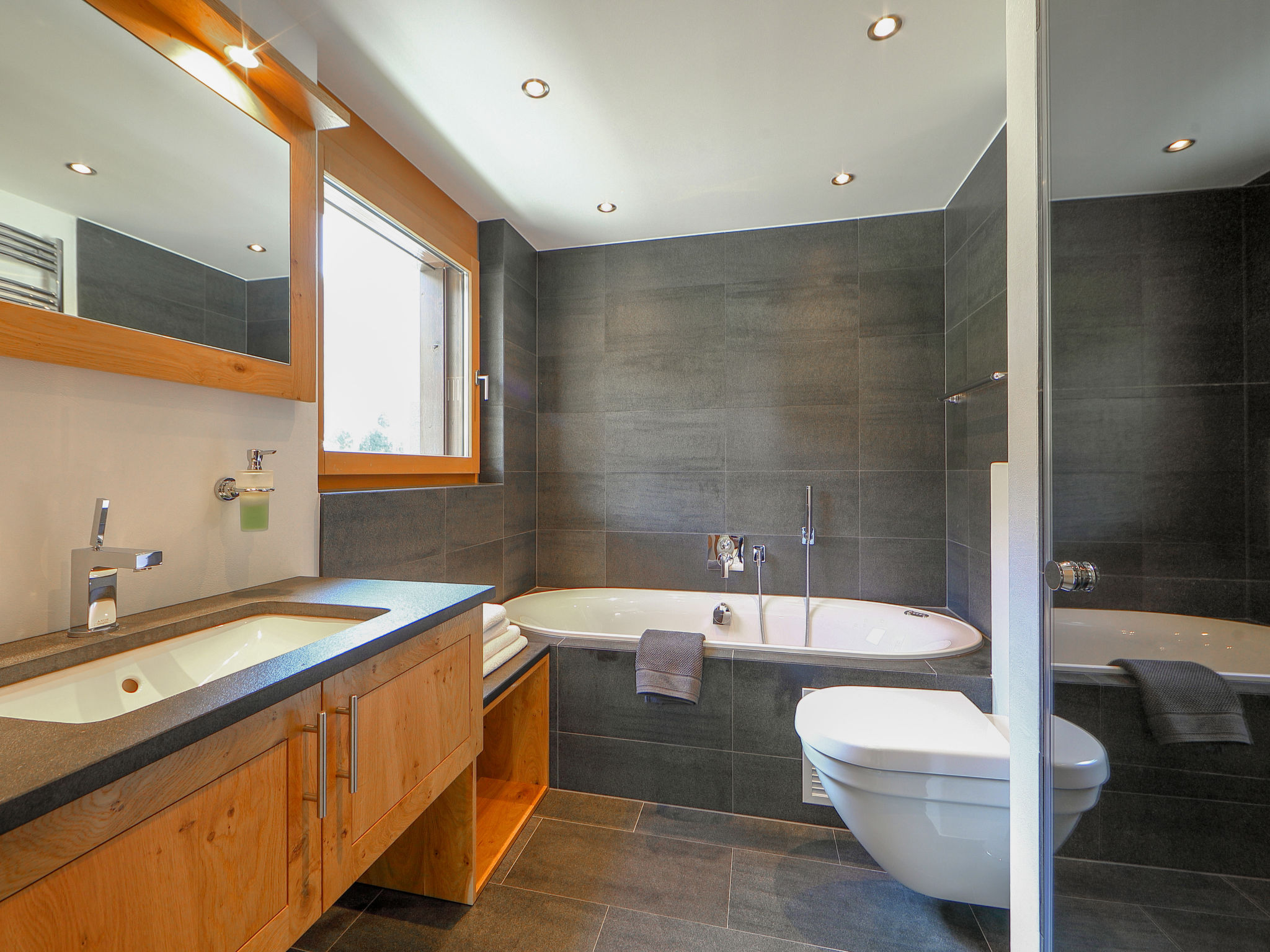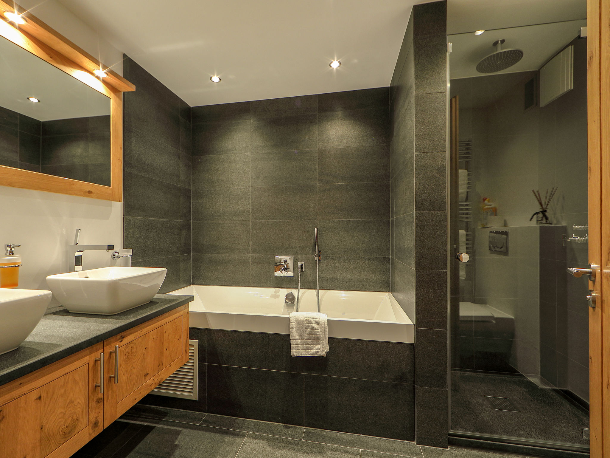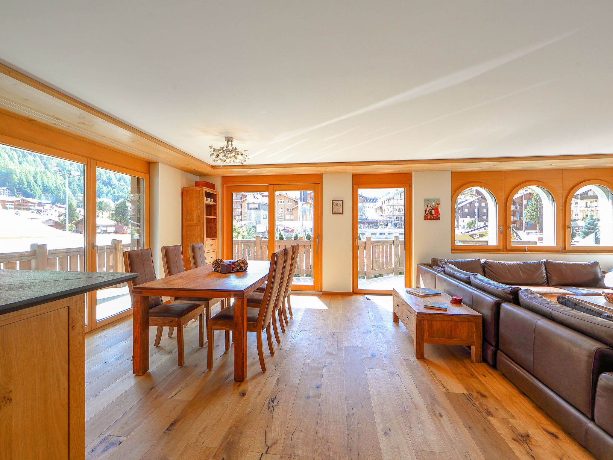4-Zimmer-Wohnung 200 m2 im 1. Stock, Südostlage. Geräumig und hell, schön und modern eingerichtet: Wohn-/Esszimmer mit offenem Kamin (nur Deko), Esstisch und TV. Ausgang zum Balkon, Richtung Süden und Richtung Osten. 1 Doppelzimmer mit 1 Doppelbett (1 x 160 cm, Länge 200 cm), Dusche/WC. 1 Doppelzimmer mit 1 Doppelbett (1 x 180 cm, Länge 200 cm), Bad/Dusche/WC und TV. Ausgang zum Balkon, Richtung Osten und Richtung Norden. 1 Doppelzimmer mit 1 Doppelbett (1 x 140 cm, Länge 200 cm). Ausgang zum Balkon, Richtung Norden. Grosse, offene Küche (Backofen, Geschirrspüler, 4 Glaskeramikplatten, Toaster, Wasserkocher, Mikrowelle, Tiefkühler, elektrische Kaffeemaschine, Racletteofen, Fondue Set (Chinoise, Käse)). Bad/WC. Fussbodenheizung. Balkon, Südlage und Ostlage Balkon, Nordlage und Ostlage. Balkonmöbel. Schöne Sicht auf das Matterhorn. Zur Verfügung: Waschmaschine, Wäschetrockner, Haartrockner. Internet (Wireless LAN, gratis). Bitte beachten: Nichtraucher-Unterkunft.
