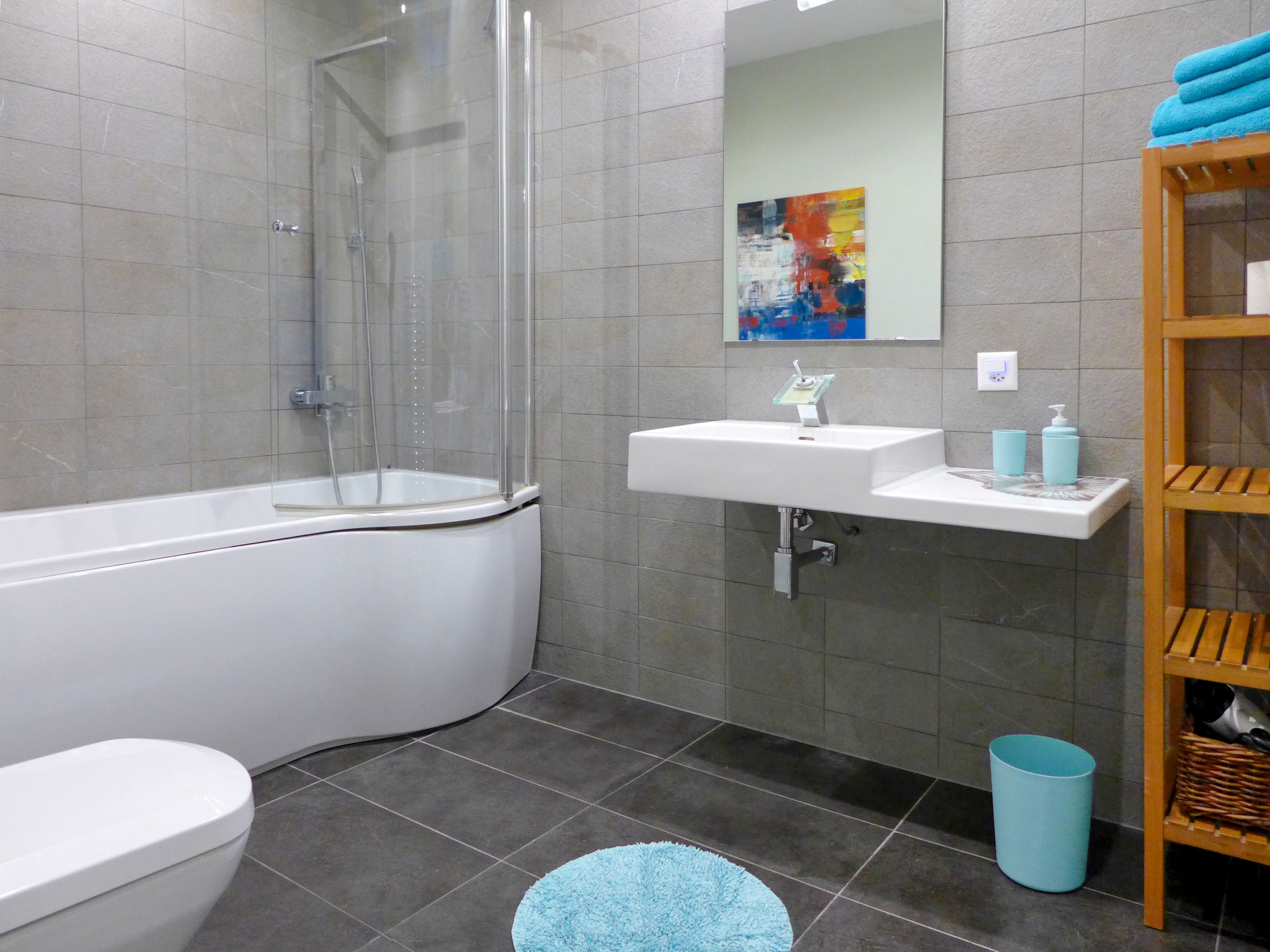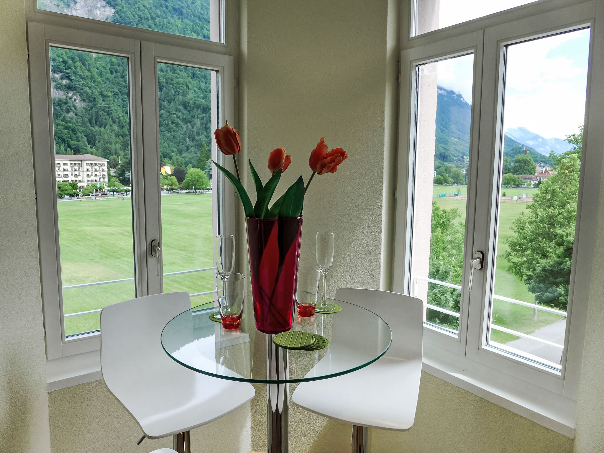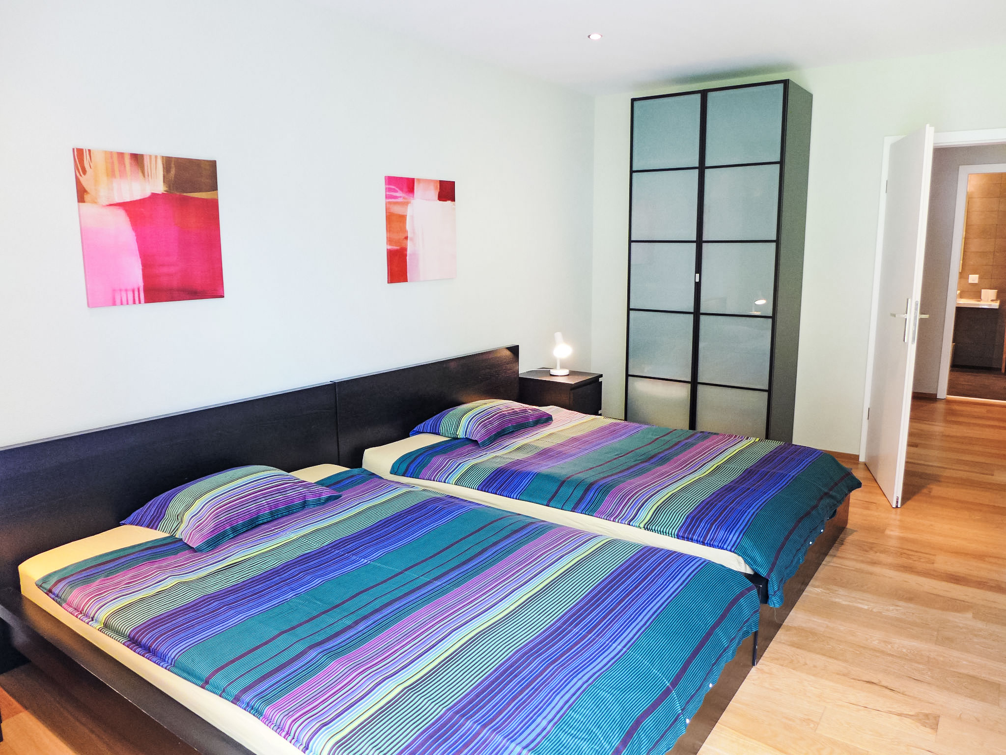 "Elegance", 3-Zimmer-Wohnung 100 m2 im 3. Stock. Geräumig und hell, sehr komfortabel und modern eingerichtet: offenes grosses Wohn-/Esszimmer 30 m2 mit Esstisch, Kabel-TV, Flachbildschirm, Radio, CD und DVD. Ausgang zum Balkon. 1 Zimmer 14 m2 mit 1 Doppelbett (160 cm, Länge 200 cm). Ausgang zum Balkon. 1 Zimmer 15 m2 mit 2 franz. Betten (140 cm, Länge 200 cm). Ausgang zum Balkon. Grosse Küche 10 m2 (Backofen, Geschirrspüler, 4 Glaskeramikplatten, Toaster, Wasserkocher, Mikrowelle, Tiefkühler, Grill, elektrische Kaffeemaschine, Kapseln für die Kaffeemaschine (Tchibo) extra, Fondue Set (Käse)). Bad/WC, Dusche/WC. Fussbodenheizung. 2 kleine Balkone. Sehr schöne Panoramasicht auf die Berge, die Landschaft und die Ortschaft. Zur Verfügung: Waschmaschine, Wäschetrockner, Haartrockner. Internet (Wireless LAN, gratis). Parkplatz (überdacht, 1 Auto). Bitte beachten: Nichtraucher-Unterkunft.