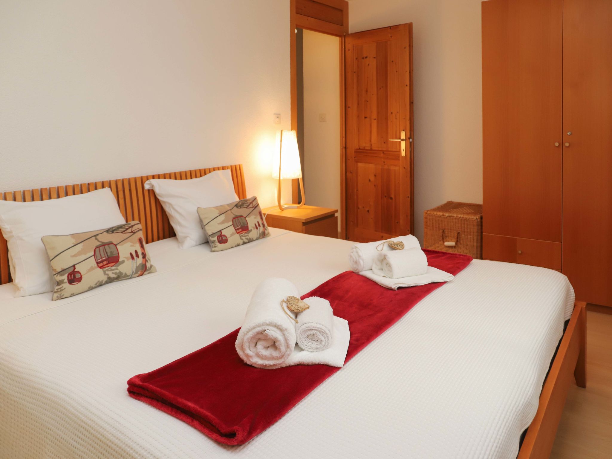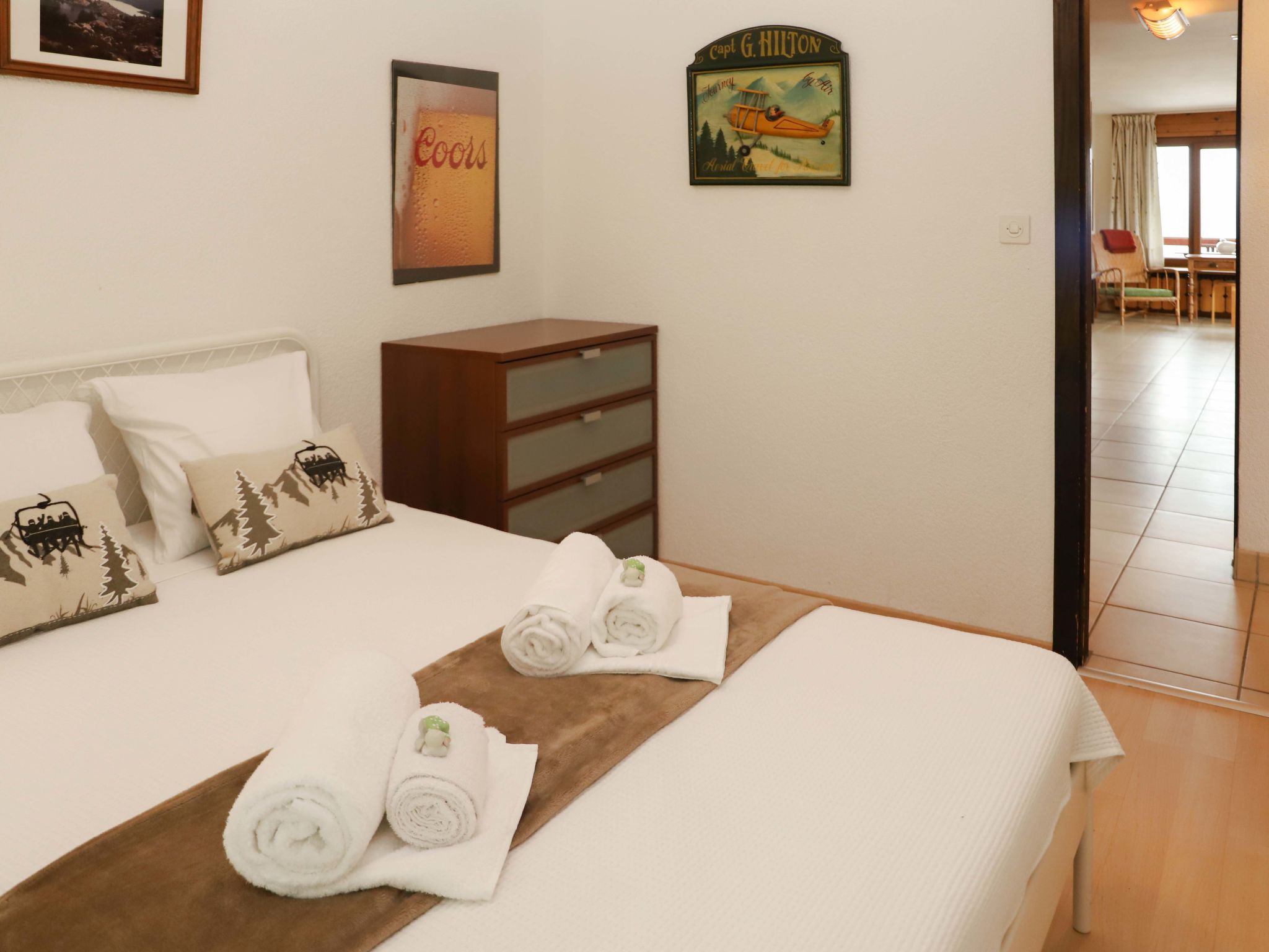 "Quille du diable 19", 3-Zimmer-Wohnung 80 m2 im 3. Stock. Schön eingerichtet: Wohn-/Esszimmer mit Panoramafenster mit 2 Wandklappbetten (90 cm, Länge 200 cm), Kabel-TV. Ausgang zum Balkon, Richtung Norden und Richtung Osten. 1 Zimmer mit 1 Doppelbett (2 x 90 cm, Länge 200 cm). Ausgang zum Balkon, Richtung Süden. 1 kleines Zimmer mit 1 franz. Bett (140 cm, Länge 200 cm). Ausgang zum Balkon, Richtung Süden. Offene Küche (Geschirrspüler, 2 Glaskeramikplatten, Racletteofen, Kombinationsmikrowelle, Fondue Set (Käse)). Bad/WC, Dusche/WC. Balkonmöbel. Sehr schöne Sicht auf die Berge und das Tal. Zur Verfügung: Internet (Wireless LAN, gratis). Bitte beachten: Nichtraucher-Unterkunft. 3313.313408.2200