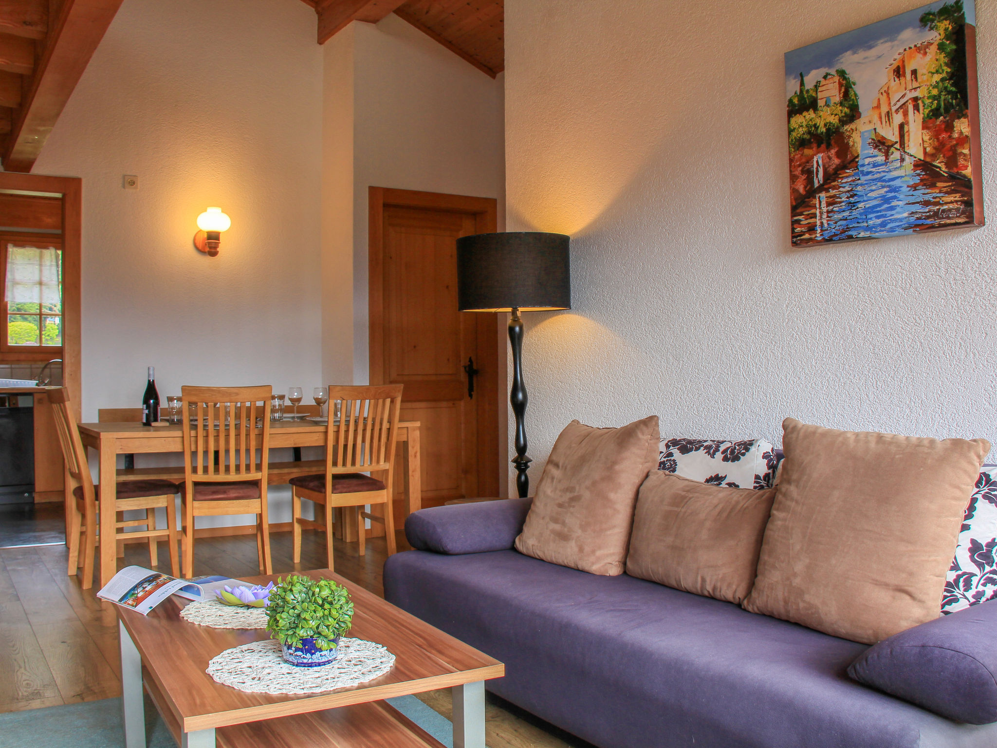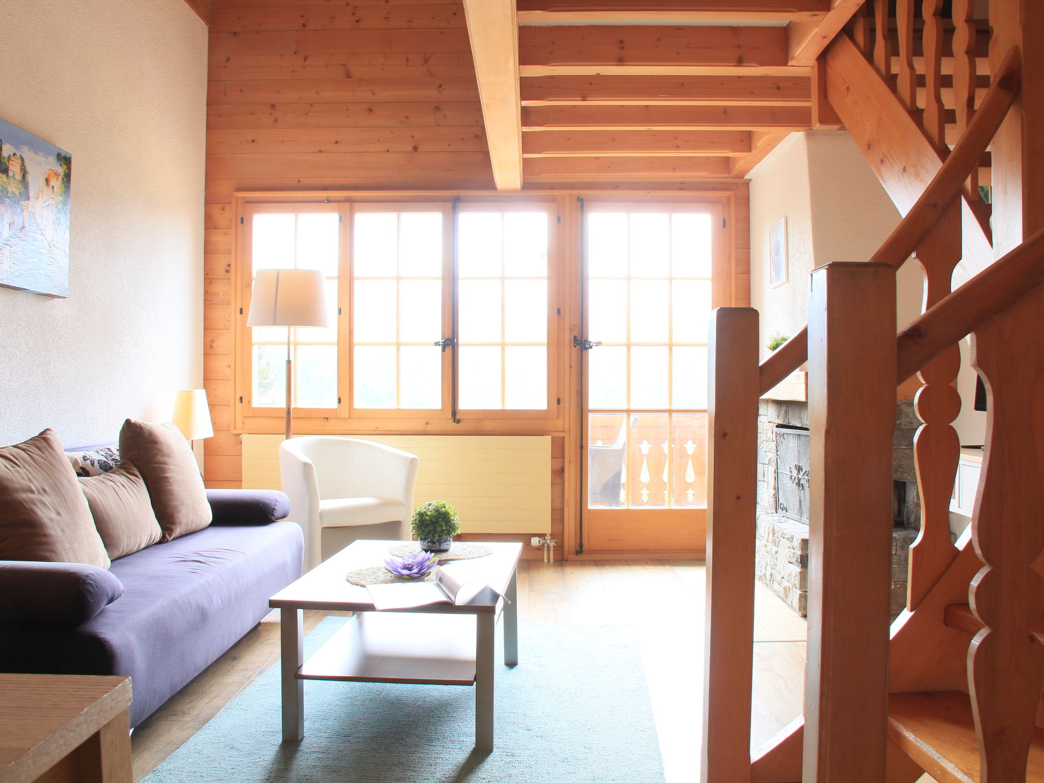 "Le Geteillon 4", 3-Zimmer-Wohnung 65 m2 im 1. Stock, Südlage. Schön eingerichtet: Wohn-/Esszimmer mit offenem Kamin und TV (Flachbildschirm). Ausgang zum Balkon. Offene Galerie mit 1 Bett. 1 Zimmer mit 2 Betten. 1 Doppelzimmer mit 2 Betten. Küche (Backofen, Geschirrspüler, 4 Glaskeramikplatten, Toaster, Wasserkocher, Mikrowelle, Tiefkühler, elektrische Kaffeemaschine, Kapseln für die Kaffeemaschine (Nespresso) extra). Bad/WC. Balkon 12 m2, Südostlage. Terrassenmöbel. Schöne Sicht auf die Berge. Zur Verfügung: Kinderhochstuhl, Haartrockner. Internet (Wireless LAN, gratis). Anstelle eines abgeschlossenen Schlafzimmers befinden sich manche Schlafplätze in einem offenen Bereich (Galerie, Nische etc.).