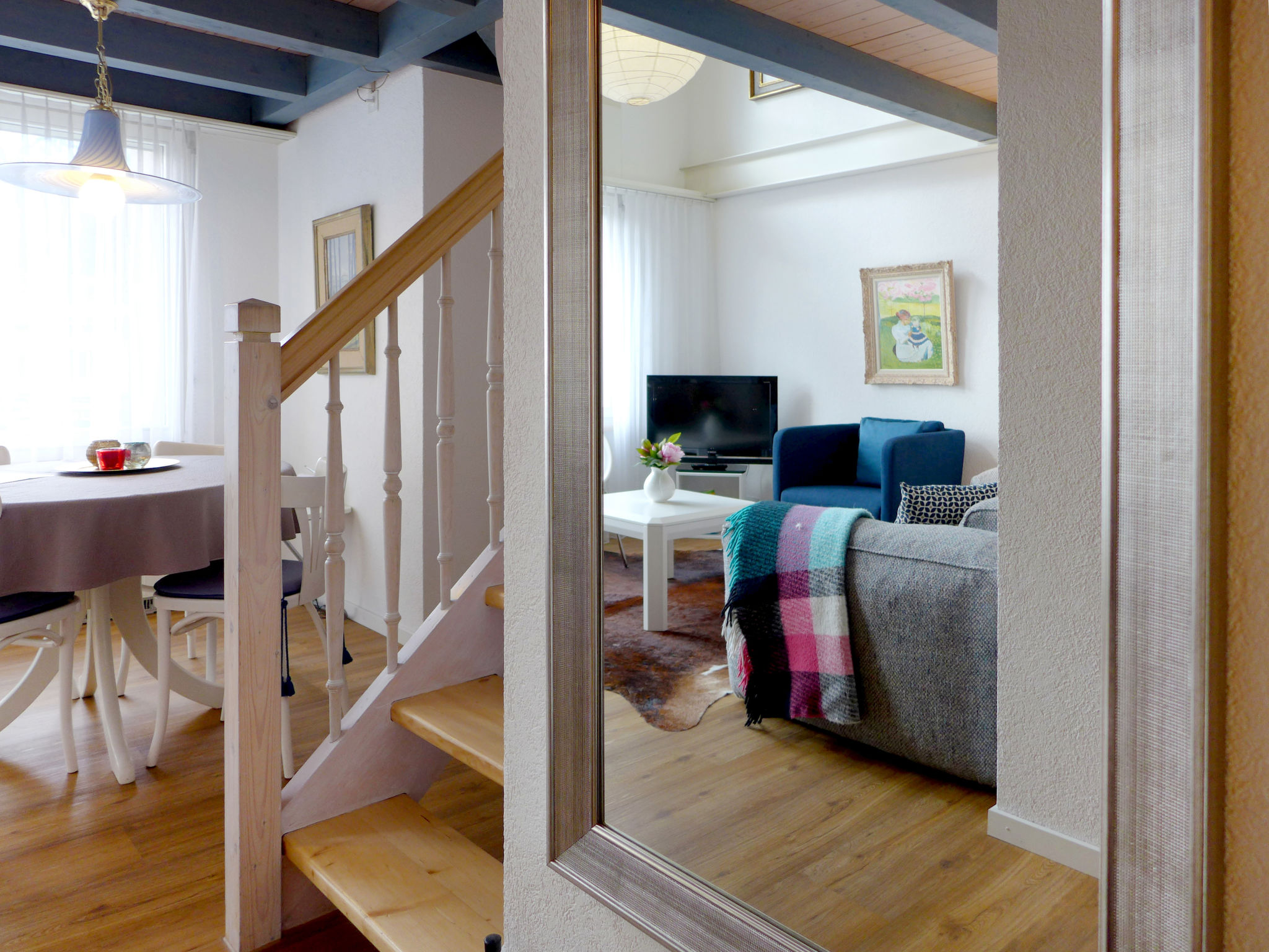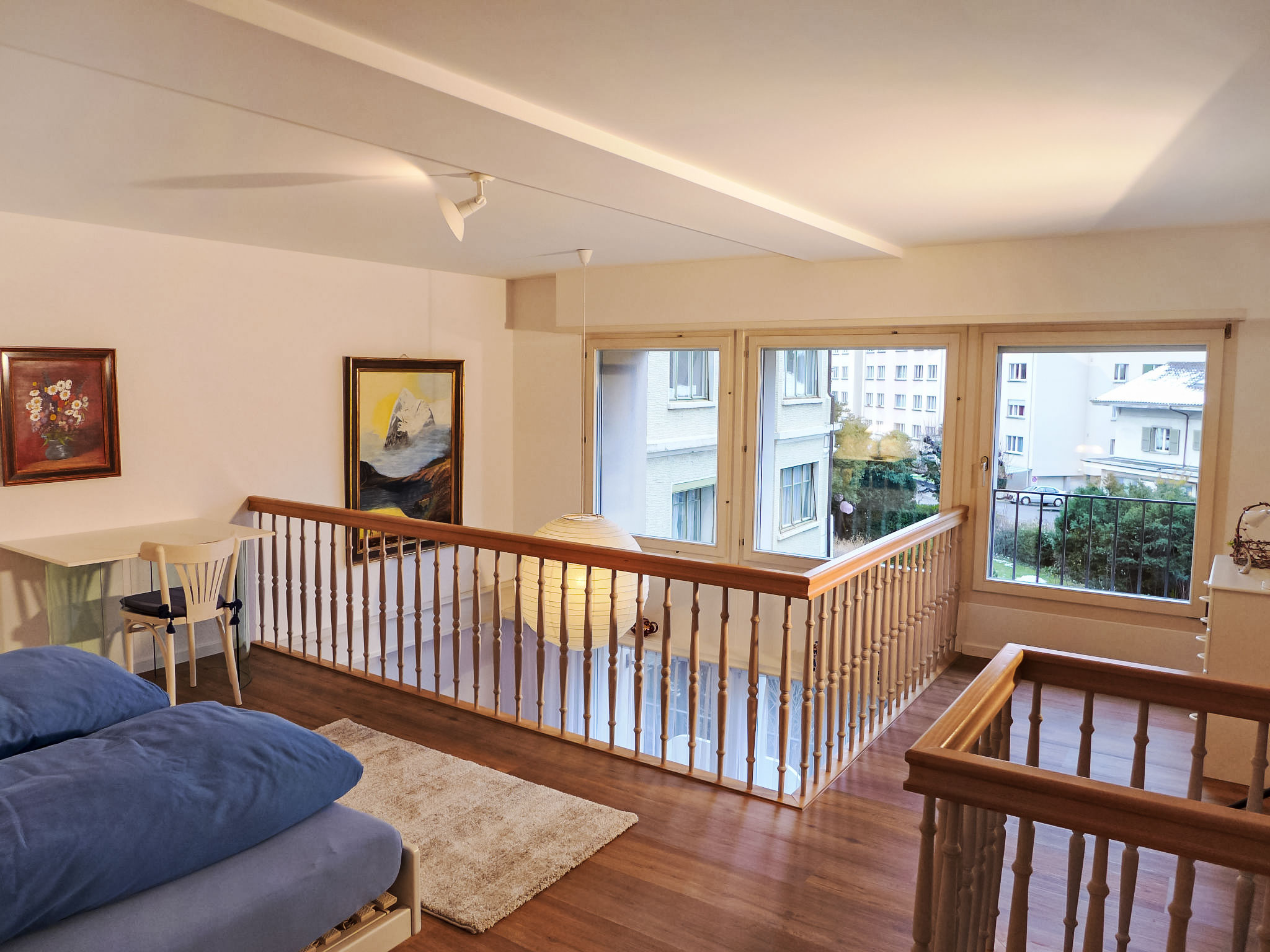 "Galeriestudio Jungfraublick", 1-Zimmer-Studio 58 m2 auf 2 Stockwerken im 1. Stock, Südlage. Geräumig und hell, sehr komfortabel und geschmackvoll eingerichtet: offenes Wohn-/Esszimmer 17 m2 mit Panoramafenster mit Kabel-TV, Flachbildschirm, Radio, E-Heizung und elektrischem Rollladen. Ausgang zum Balkon. Küche 5 m2 (3 Kochplatten, Backofen, Geschirrspüler, Toaster, Wasserkocher, Mikrowelle, elektrische Kaffeemaschine, Kapseln für die Kaffeemaschine (Nespresso) extra). Bad/WC. Obergeschoss: (steile Treppe) grosse Galerie 23 m2 mit Panoramafenster mit 1 Doppelbett (2 x 90 cm, Länge 200 cm), TV, Kabel-TV und elektrischem Rollladen. Balkon 7 m2, Südlage. Balkonmöbel. Herrliche Sicht auf die Berge, die Ortschaft und auf die Jungfrau. Zur Verfügung: Bügeleisen, Haartrockner. Internet (Wireless LAN, gratis). Bitte beachten: für Kleinkinder nicht geeignet. Nichtraucher-Unterkunft, kein Parkplatz. Rauchmelder.