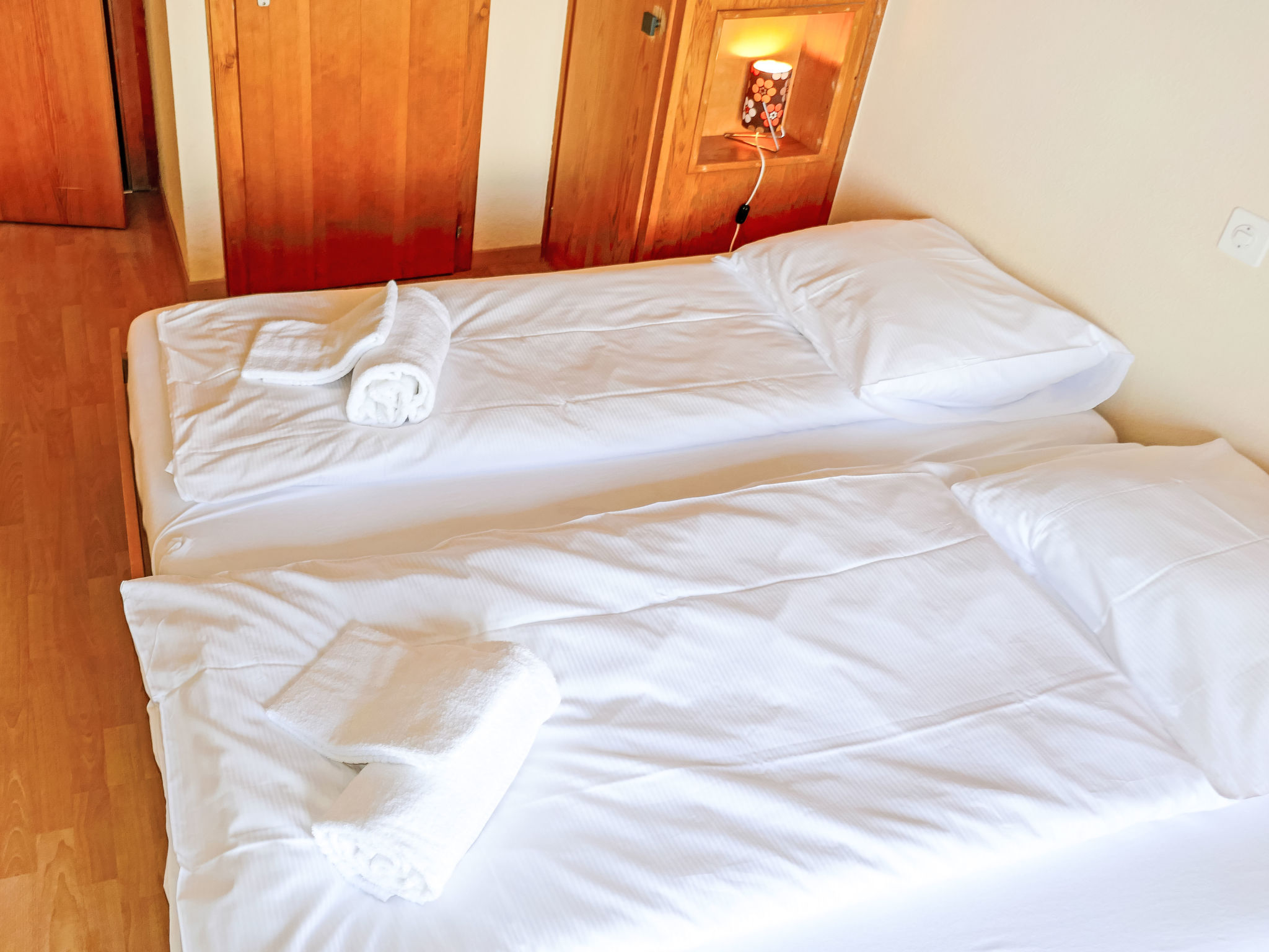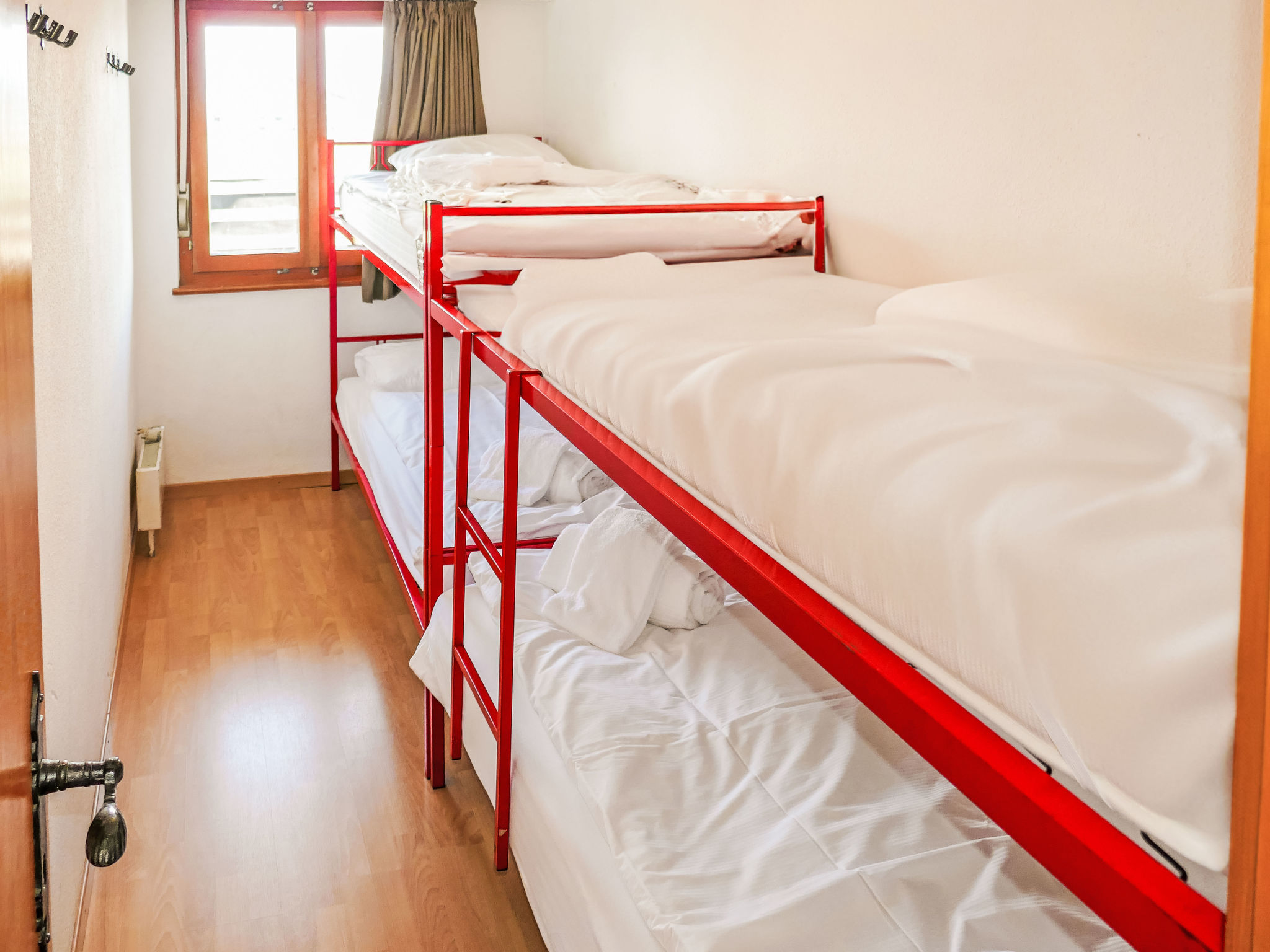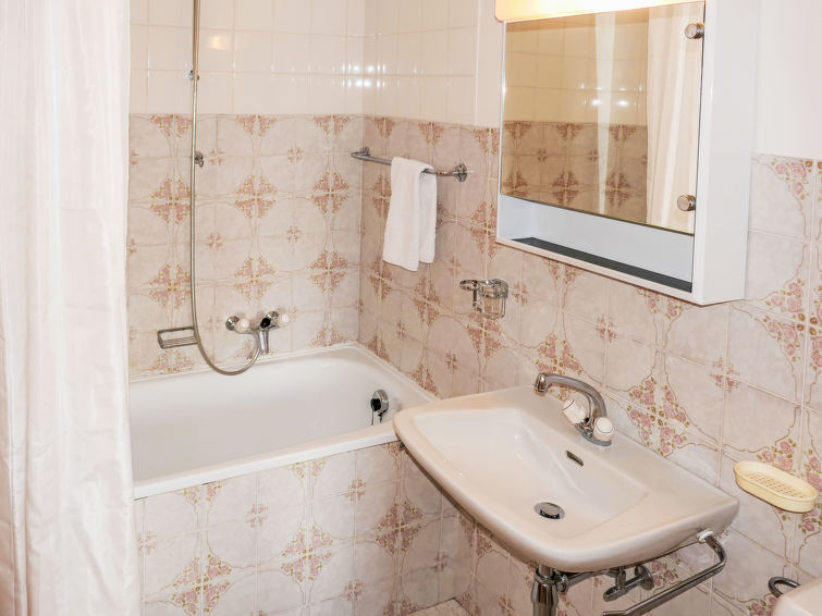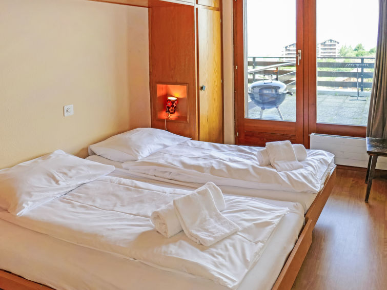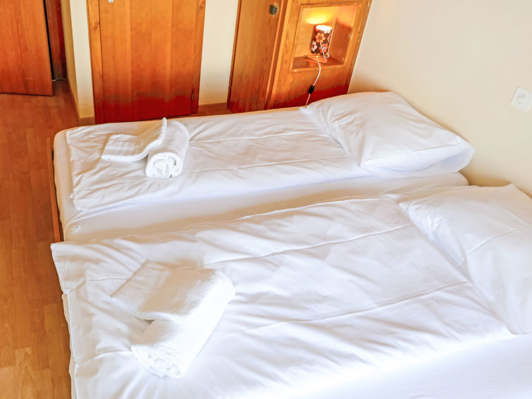"Christiania I F4", 3-Zimmer-Wohnung 66 m2 im 4. Stock. Wohn-/Esszimmer mit Kabel-TV. 1 Zimmer mit 1 Doppelbett (2 x 90 cm, Länge 190 cm). 1 kleines Zimmer mit 2 x 2 Etagenbetten (90 cm, Länge 190 cm). Küche (3 Kochplatten, Backofen, Wasserkocher, Mikrowelle, elektrische Kaffeemaschine, Fondue Set (Käse)). Bad/WC, sep. WC. Balkon, Ostlage, grosse Terrasse 50 m2, Nordlage. Sicht auf die Berge und die Ortschaft. Zur Verfügung: Internet (Wireless LAN). Parkplatz Nr. 13C (überdacht), Höhe 190 cm. Bitte beachten: Nichtraucher-Unterkunft.