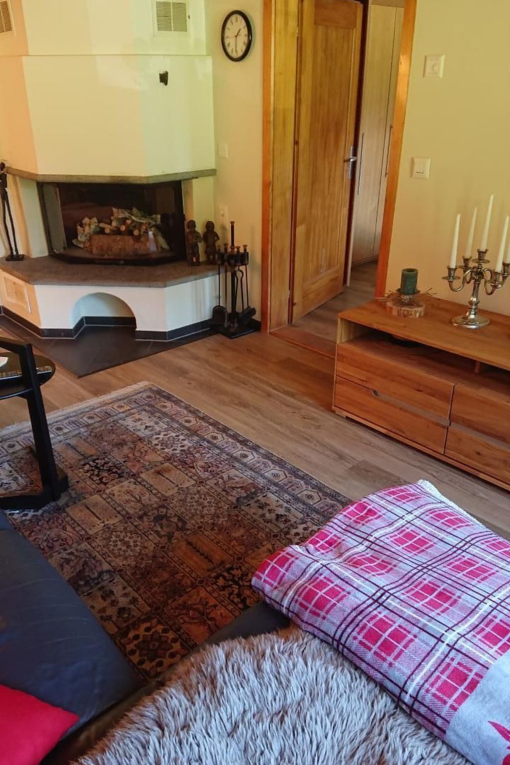 Wohnzimmer mit Cheminée. TV, Radio, Relax-Sessel, Sofa mit Long-Chair.