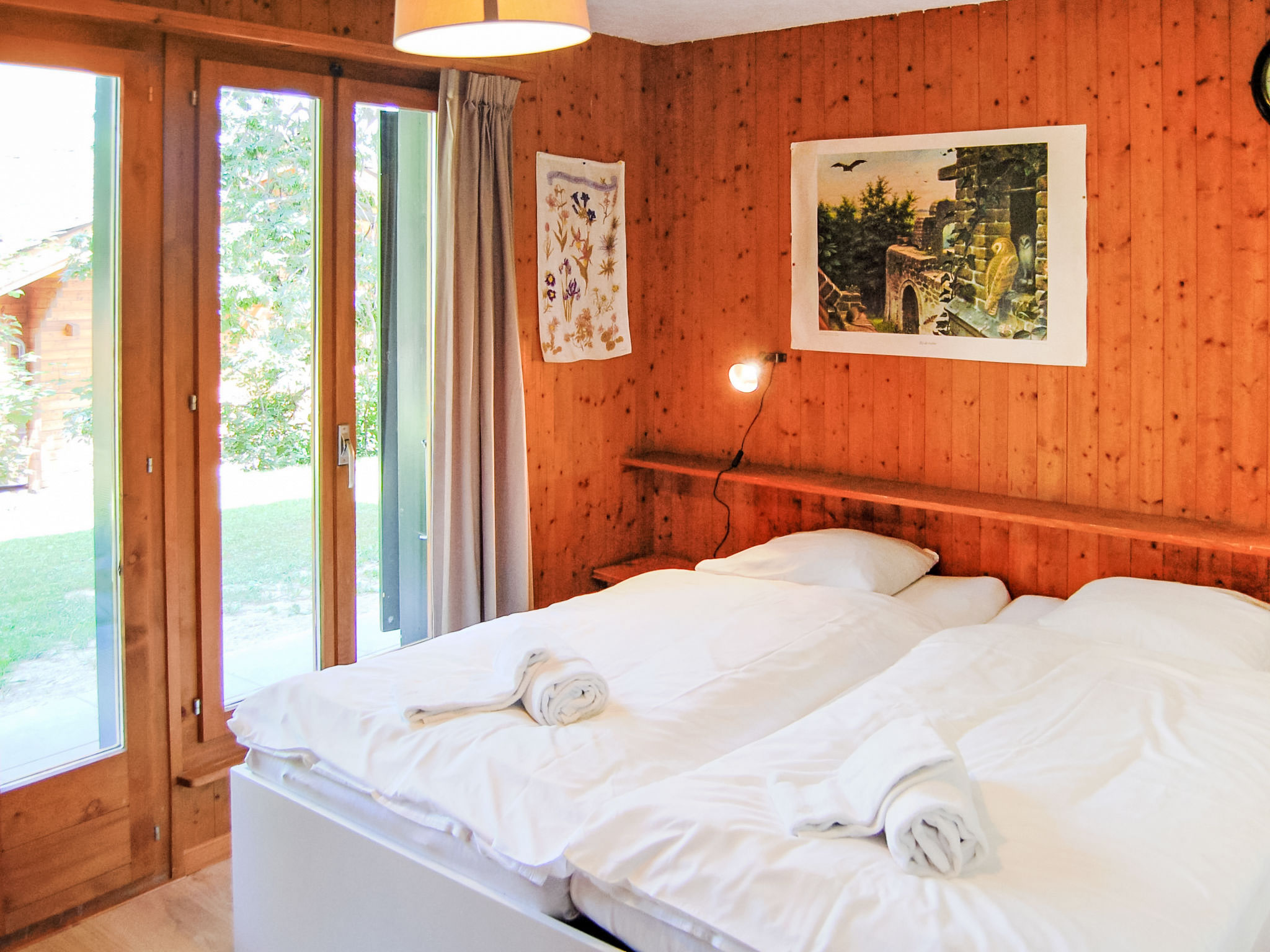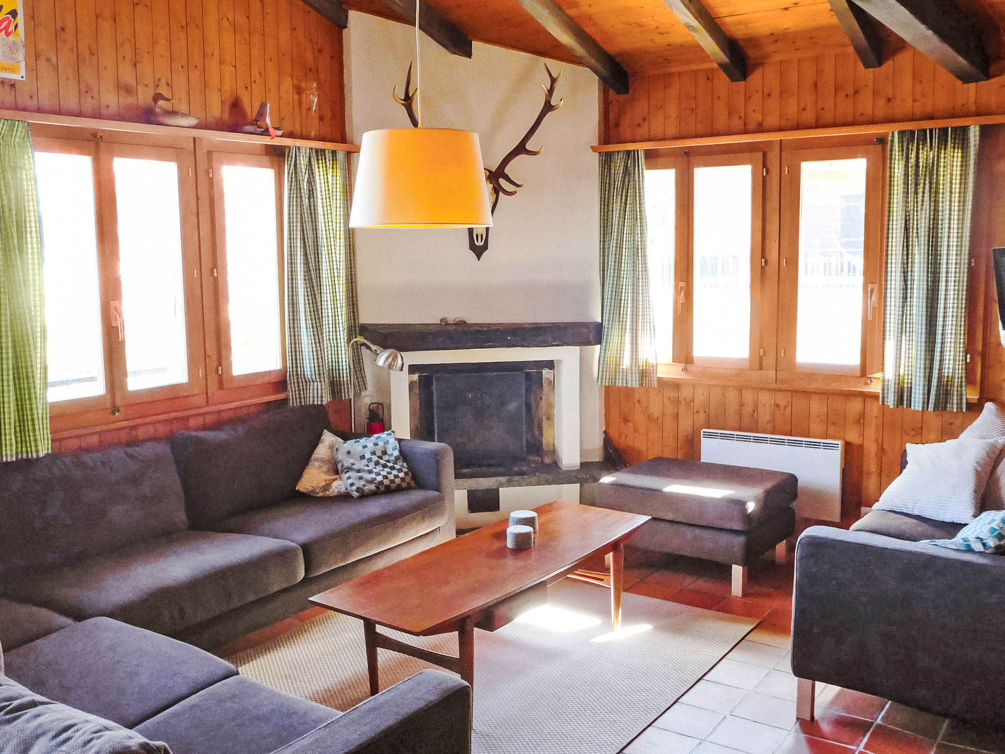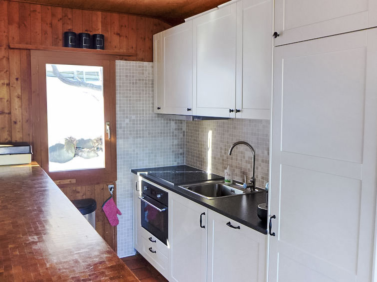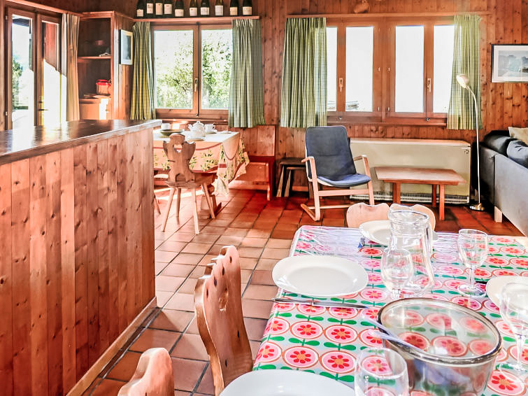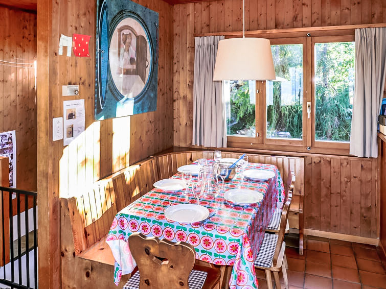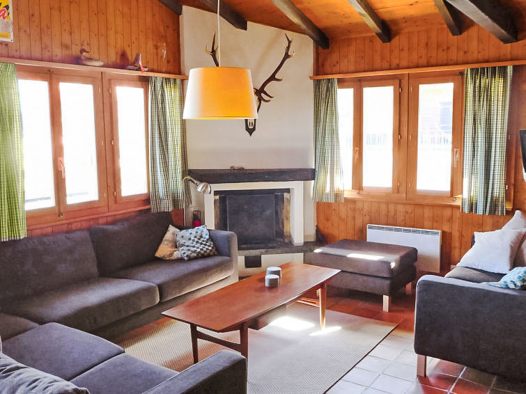 "Sven Heul", 5-Zimmer-Chalet 105 m2 auf 2 Stockwerken. Teilweise renoviert im Jahre 2015, komfortabel eingerichtet: grosses Wohn-/Esszimmer mit offenem Kamin, Kabel-TV, Radio und DVD. Ausgang zum Balkon, Richtung Nordosten. Offene Küche (Geschirrspüler, 4 Induktionskochplatten, Toaster, Wasserkocher, Mikrowelle, elektrische Kaffeemaschine, Kapseln für die Kaffeemaschine (Nespresso) extra, Racletteofen, Fondue Set (Chinoise, Käse)). Ausgang zur Terrasse. Sep. WC. E-Heizung. Unteres Geschoss: 2 Zimmer, jedes Zimmer mit 1 Doppelbett (2 x 90 cm, Länge 200 cm). 1 Zimmer mit 1 x 2 Etagenbetten (90 cm, Länge 190 cm). 1 Zimmer mit 1 Doppelbett (90 cm, Länge 190 cm), Waschbecken. Bad/WC, Dusche, sep. WC. Terrasse 24 m2, Nordwestlage. Balkonmöbel, Gartengrill. Sicht auf das Tal. Zur Verfügung: Waschmaschine, Babybett, Haartrockner. Internet (WLAN, gratis). Parkplatz (3 Autos). Bitte beachten: Nichtraucher-Unterkunft. Maximal 1 Haustier/Hund erlaubt.