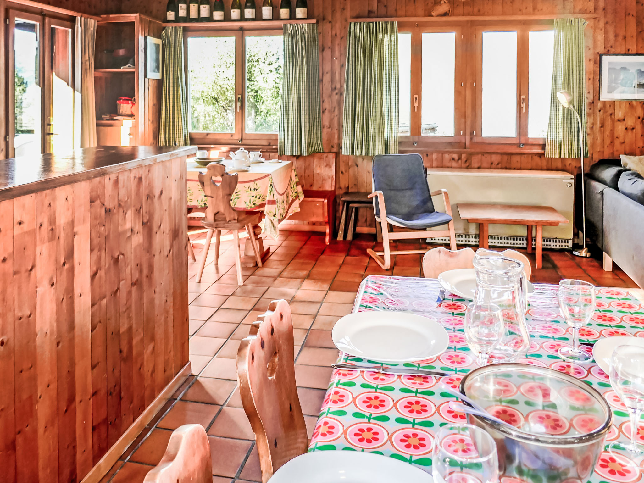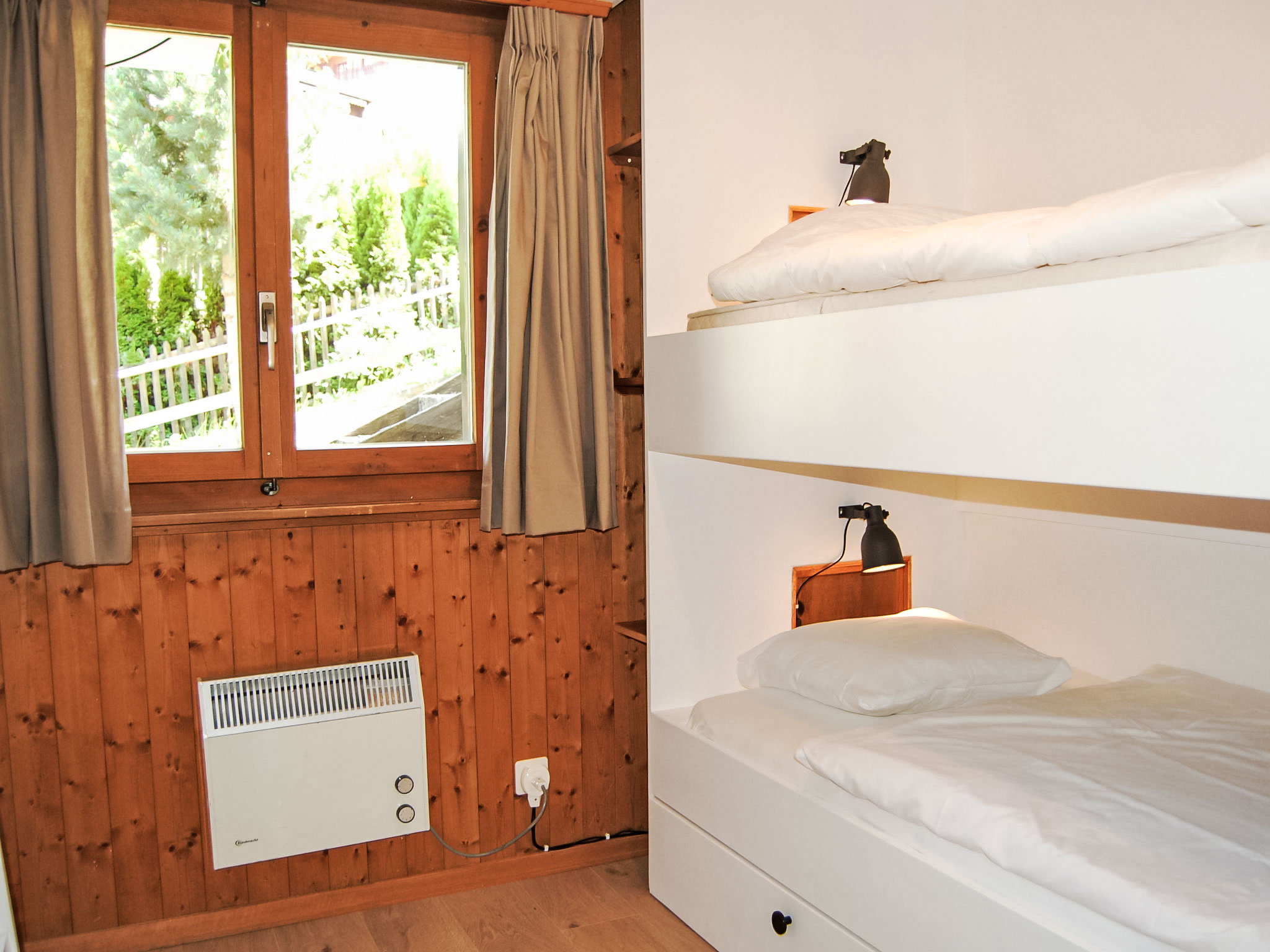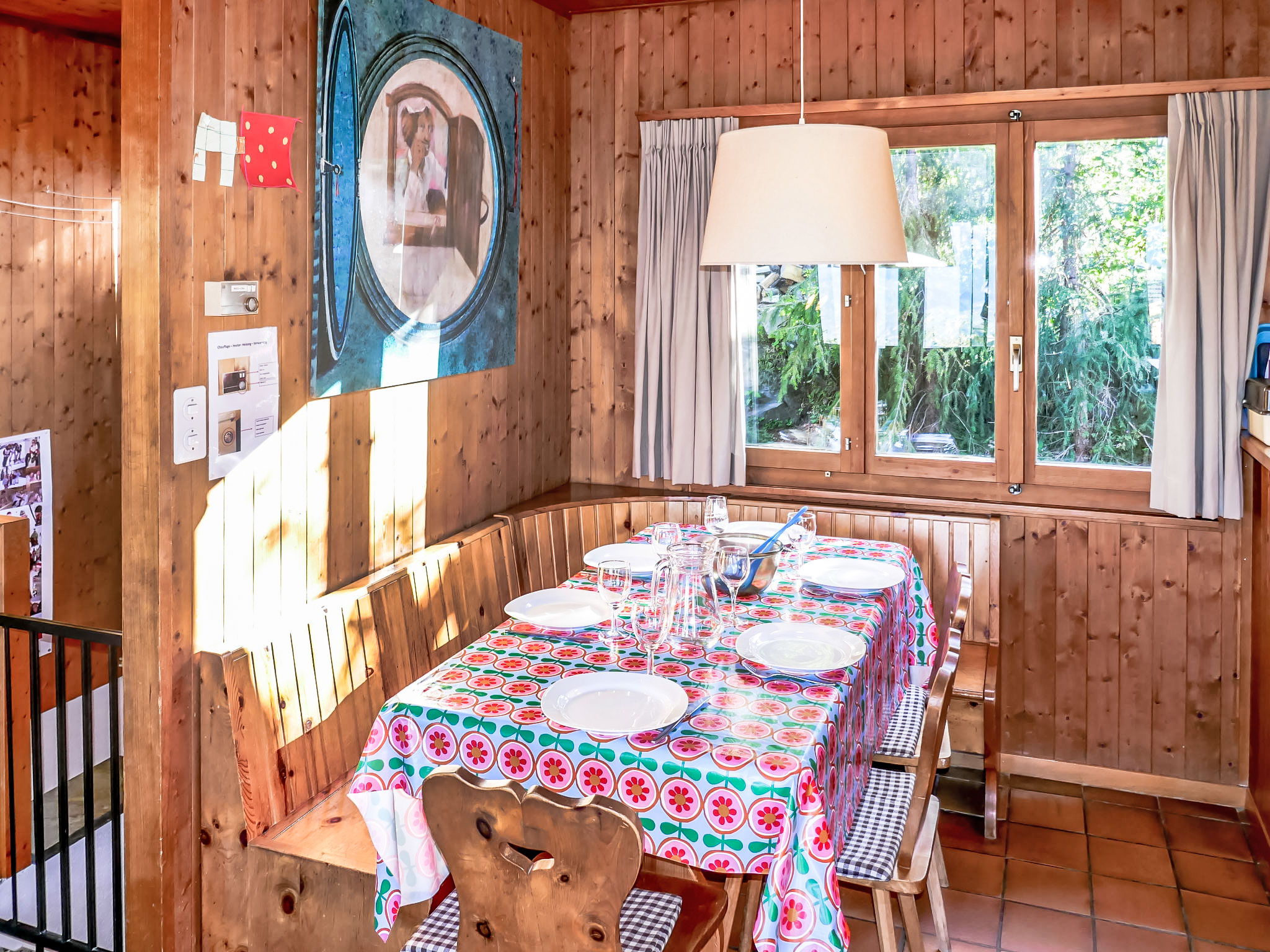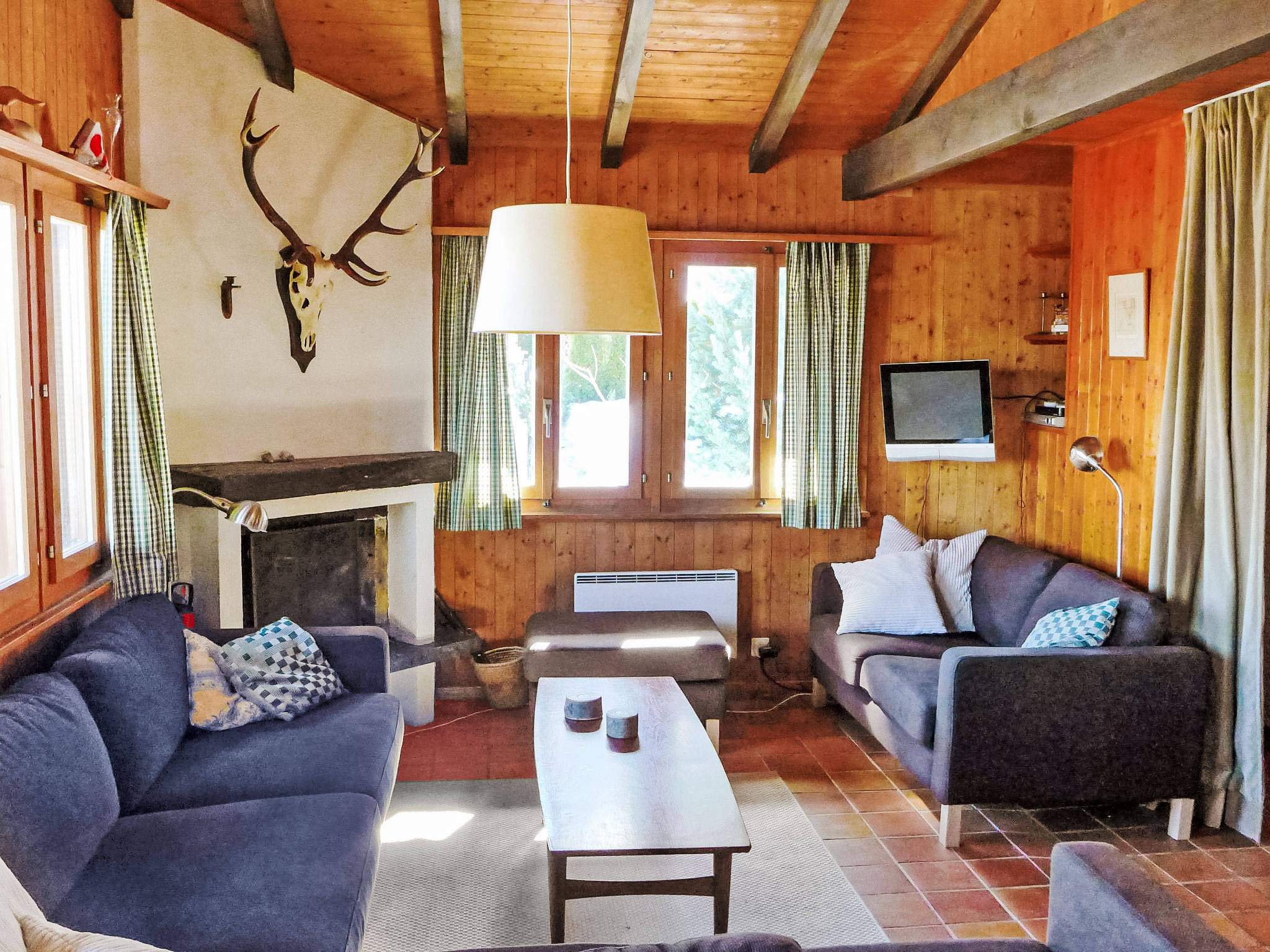 "Sven Heul", 5-Zimmer-Chalet 105 m2 auf 2 Stockwerken. Teilweise renoviert im Jahre 2015, komfortabel eingerichtet: grosses Wohn-/Esszimmer mit offenem Kamin, Kabel-TV, Radio und DVD. Ausgang zum Balkon, Richtung Nordosten. Offene Küche (Geschirrspüler, 4 Induktionskochplatten, Toaster, Wasserkocher, Mikrowelle, elektrische Kaffeemaschine, Kapseln für die Kaffeemaschine (Nespresso) extra, Racletteofen, Fondue Set (Chinoise, Käse)). Ausgang zur Terrasse. Sep. WC. E-Heizung. Unteres Geschoss: 2 Zimmer, jedes Zimmer mit 1 Doppelbett (2 x 90 cm, Länge 200 cm). 1 Zimmer mit 1 x 2 Etagenbetten (90 cm, Länge 190 cm). 1 Zimmer mit 1 Doppelbett (90 cm, Länge 190 cm), Waschbecken. Bad/WC, Dusche, sep. WC. Terrasse 24 m2, Nordwestlage. Balkonmöbel, Gartengrill. Sicht auf das Tal. Zur Verfügung: Waschmaschine, Babybett, Haartrockner. Internet (WLAN, gratis). Parkplatz (3 Autos). Bitte beachten: Nichtraucher-Unterkunft. Maximal 1 Haustier/Hund erlaubt.