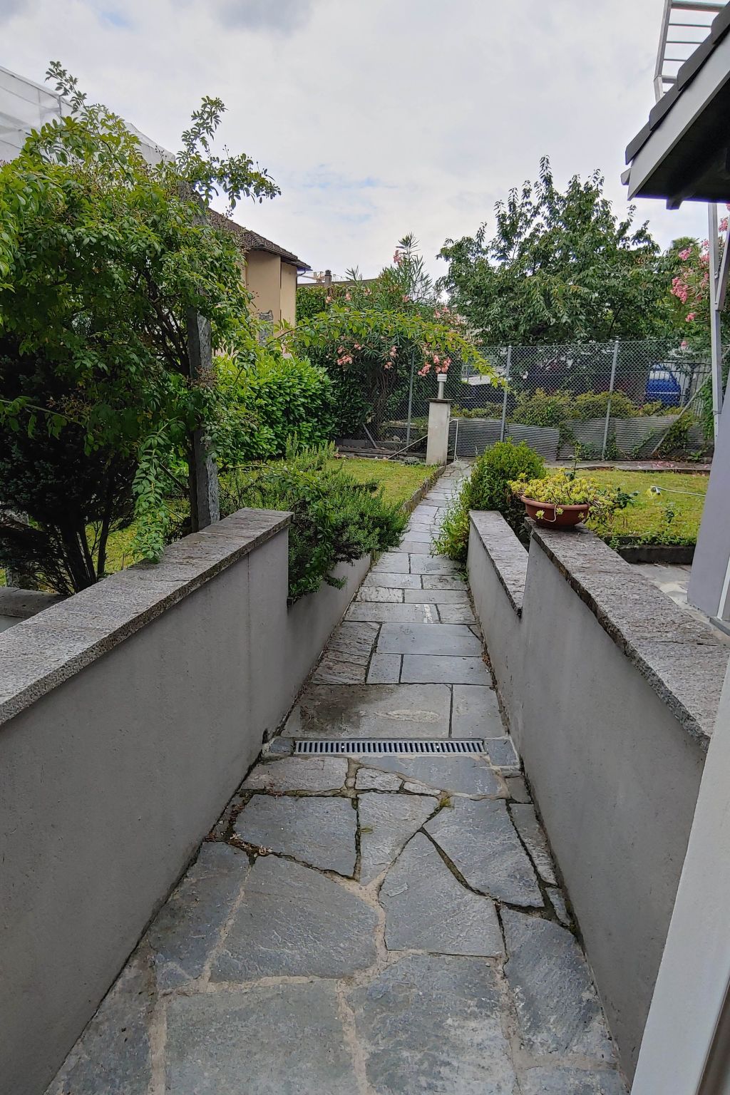 Kleiner Garten mit 2 Steintischen. Zugang von der Straße über 10 Stufen.