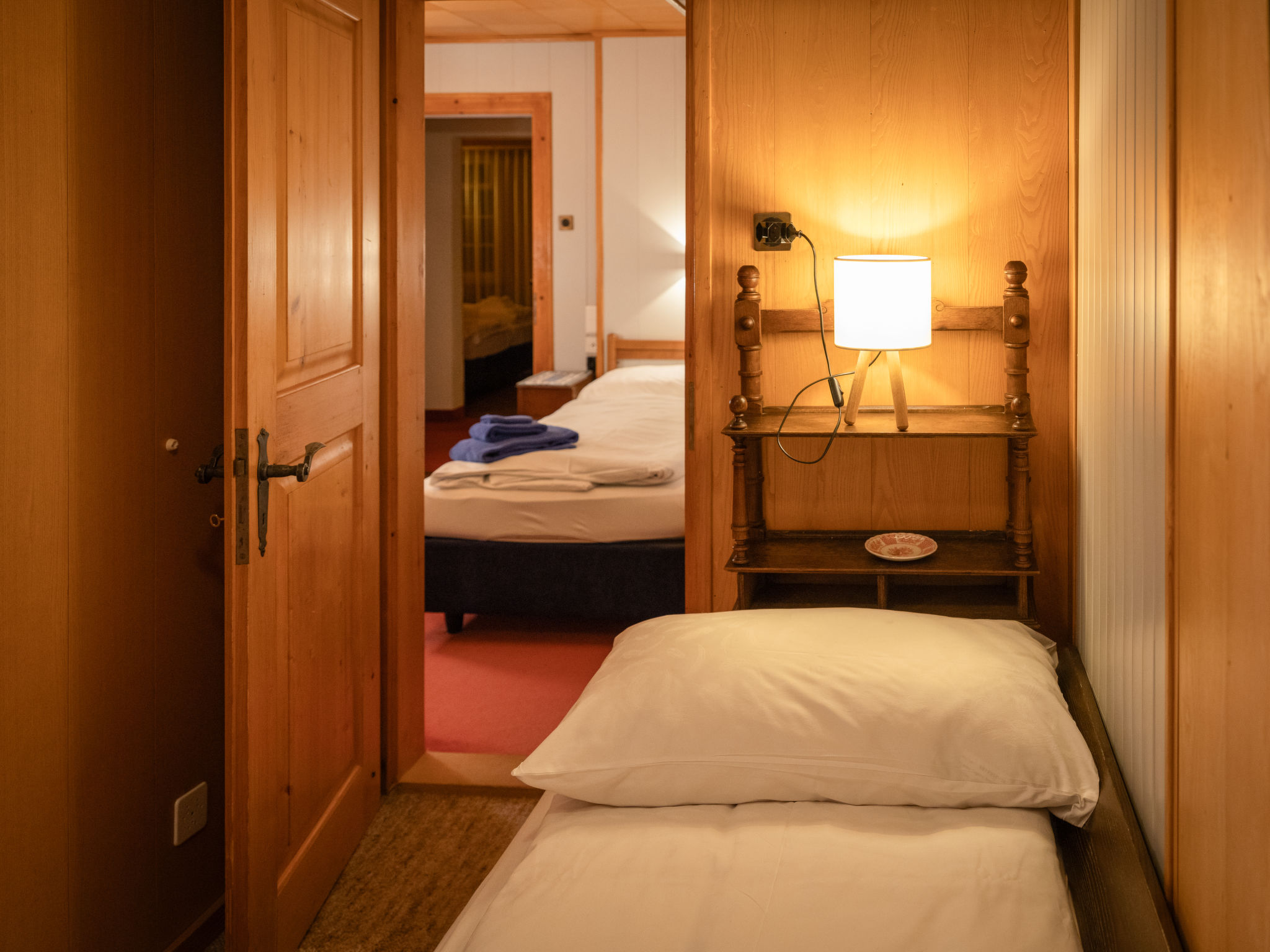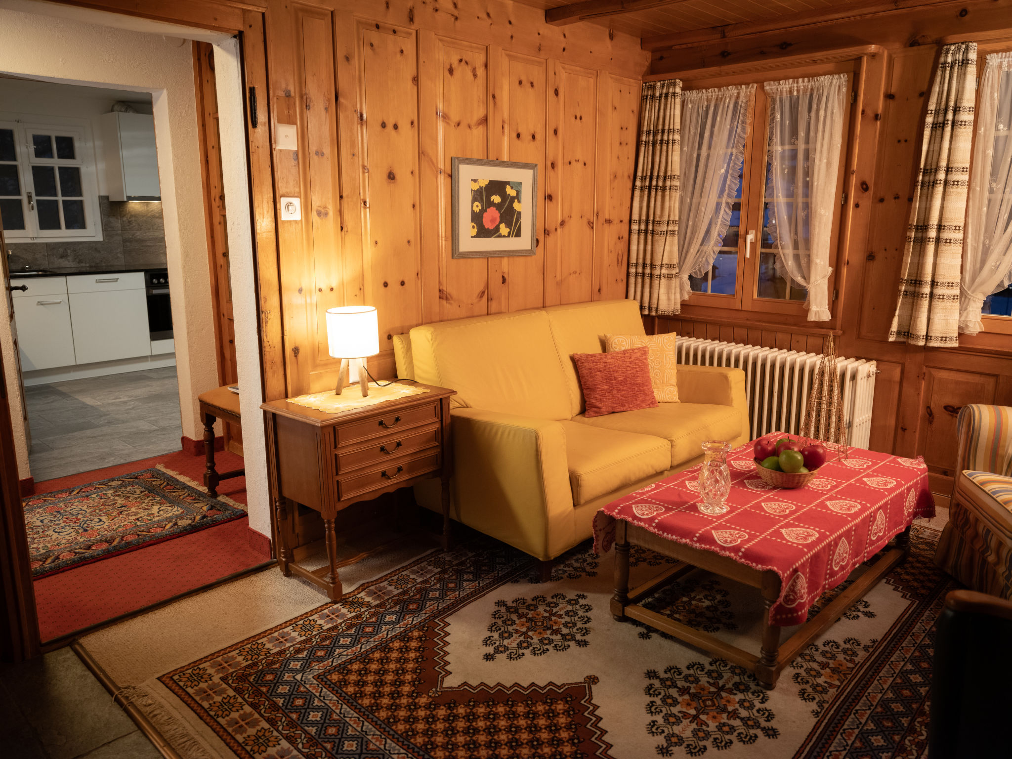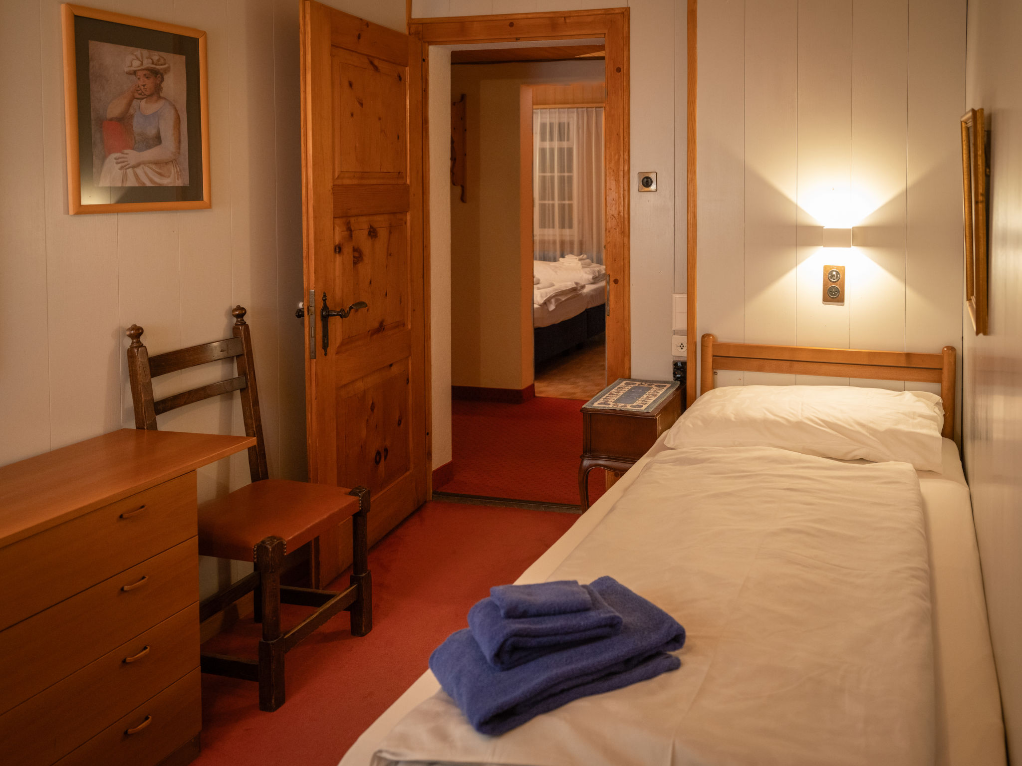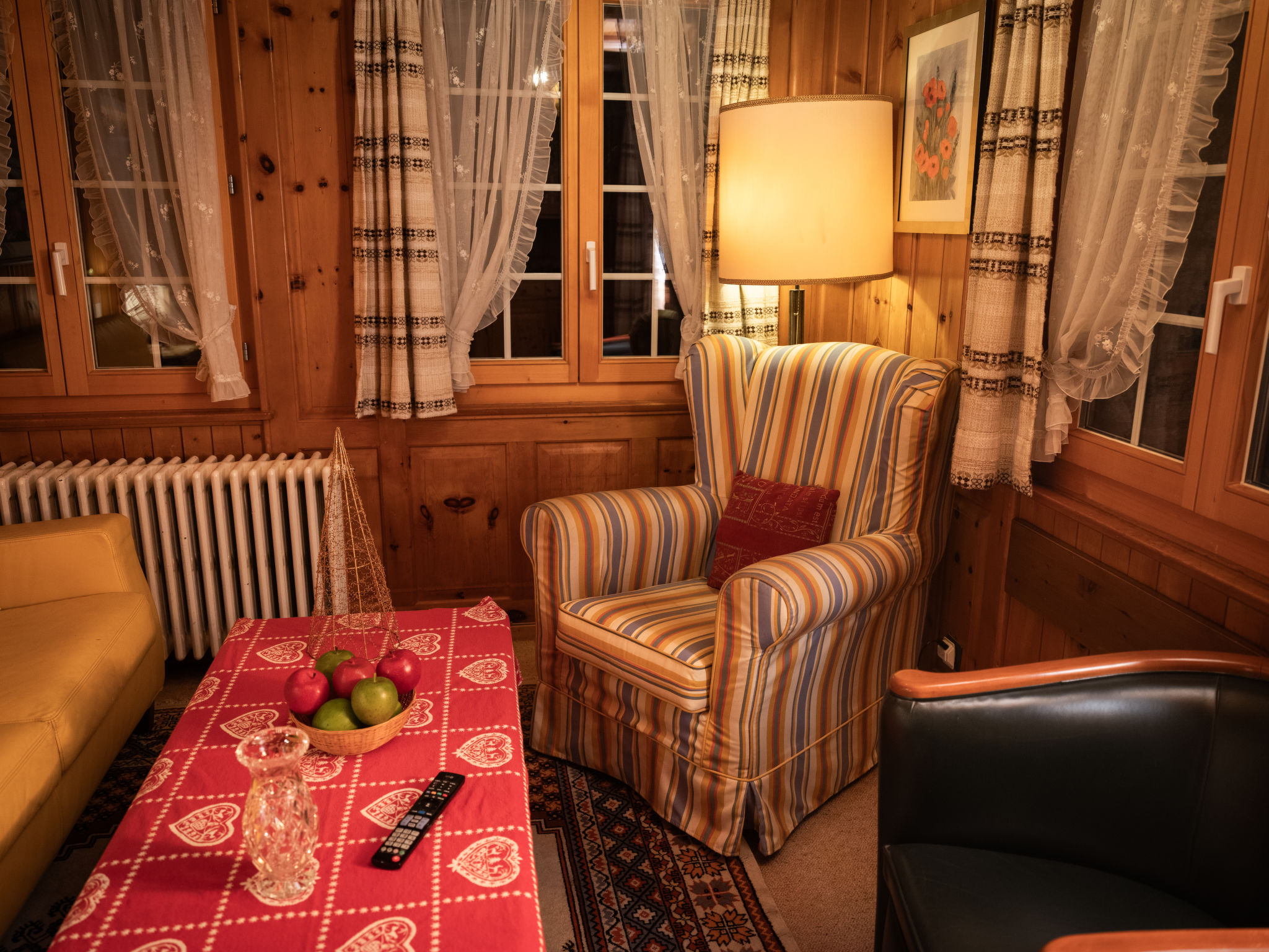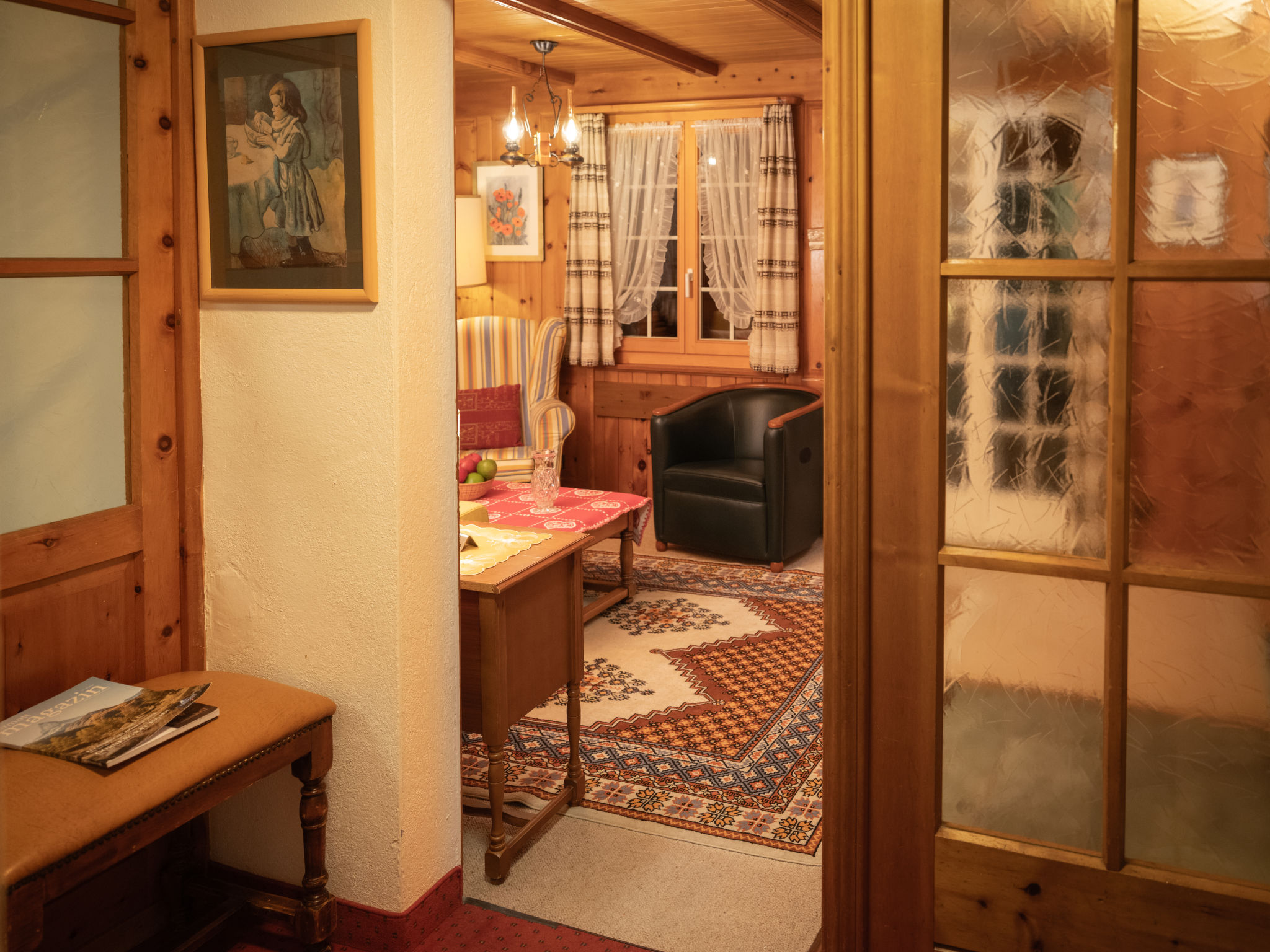 "Chalet Turquino / Apartment Marmotte", 4-Zimmer-Wohnung 90 m2, im Erdgeschoss, Südostlage. Objekt geeignet für 4 Erwachsene + 1 Kind. Einfach und gemütlich eingerichtet: Wohnzimmer mit offenem Kamin (nur Deko), TV. Ausgang zum Balkon, Richtung Osten und Richtung Süden. 1 Zimmer mit 2 Betten (90 cm, Länge 200 cm), Waschbecken. Durchgangszimmer mit 1 Bett (90 cm, Länge 200 cm), Bad/WC. 1 Zimmer mit 1 Bett (90 cm, Länge 200 cm). 1 Zimmer mit 1 Bett (90 cm, Länge 200 cm). Küche (Backofen, Geschirrspüler, 4 Glaskeramikplatten, Mikrowelle, Tiefkühler, elektrische Kaffeemaschine). Bad/WC, sep. WC. Heizung. Balkon, Ostlage und Südlage. Seitliche Sicht auf die Berge. Zur Verfügung: Internet (Wireless LAN). Bitte beachten: Nichtraucher-Unterkunft.