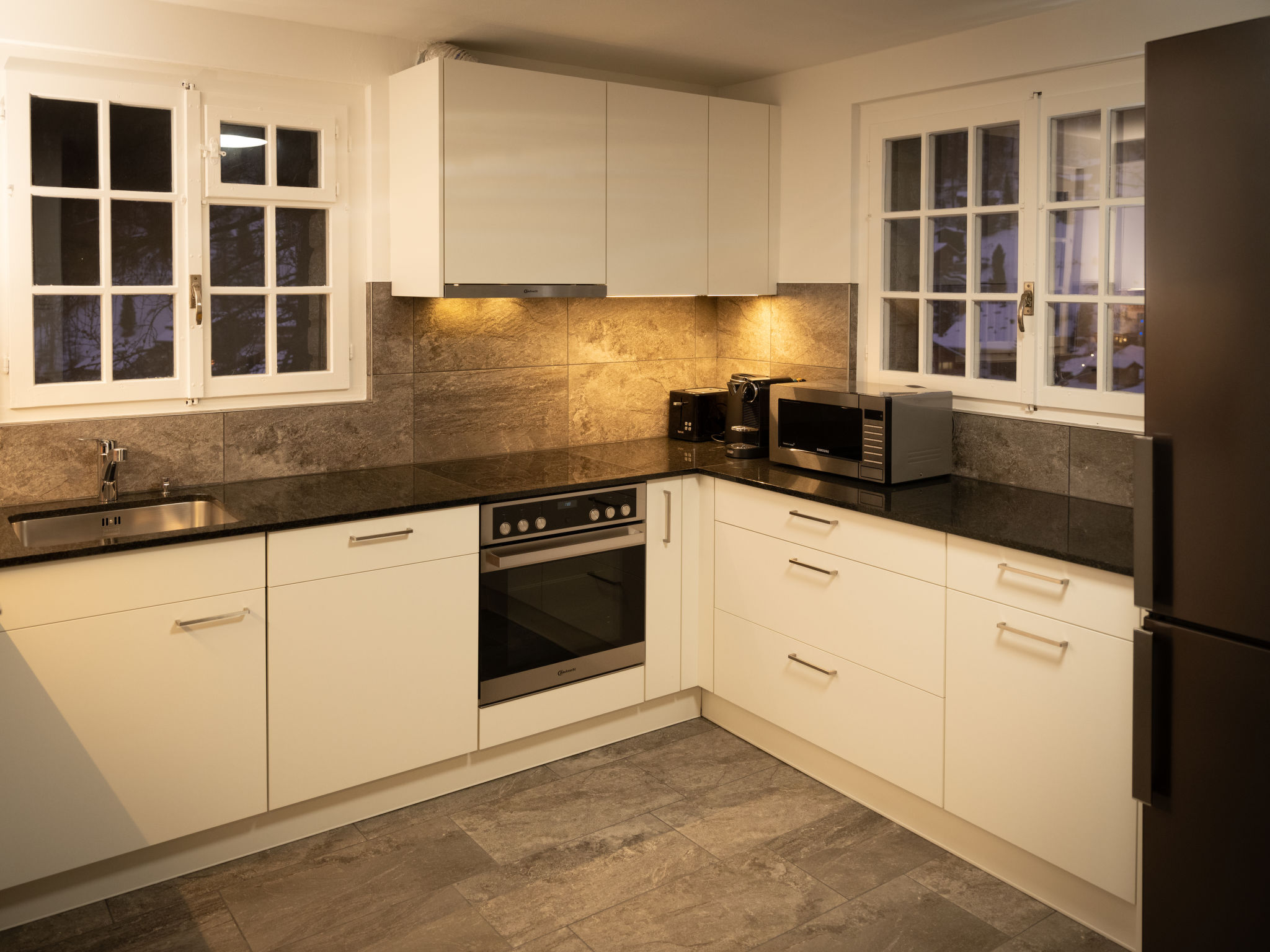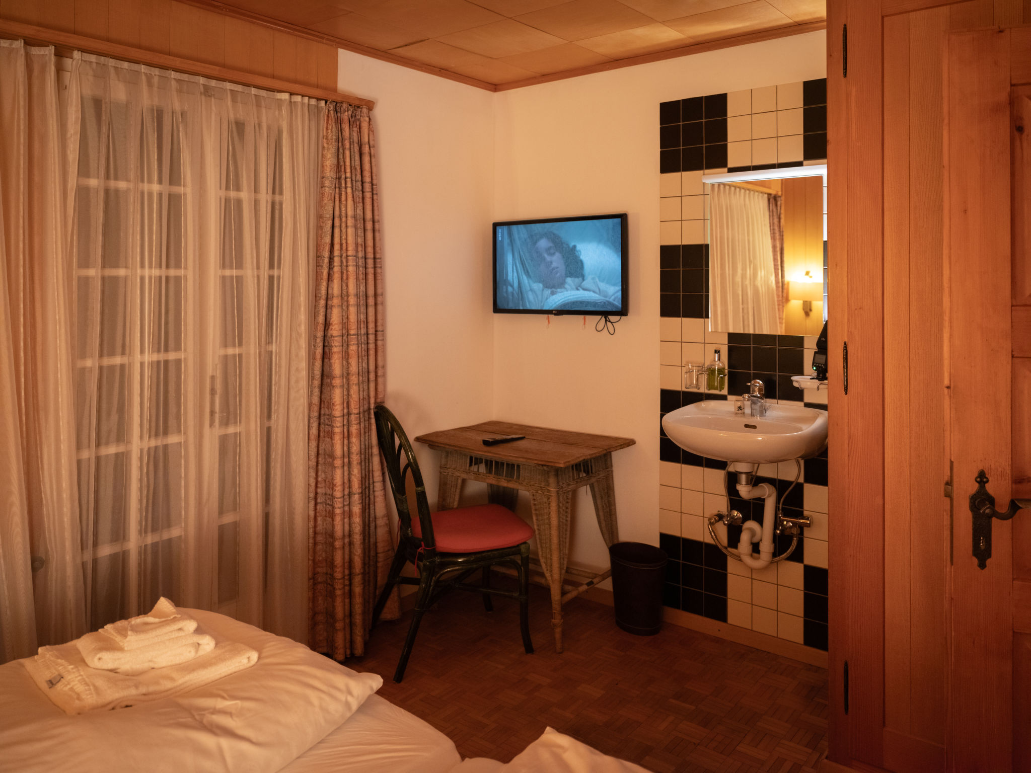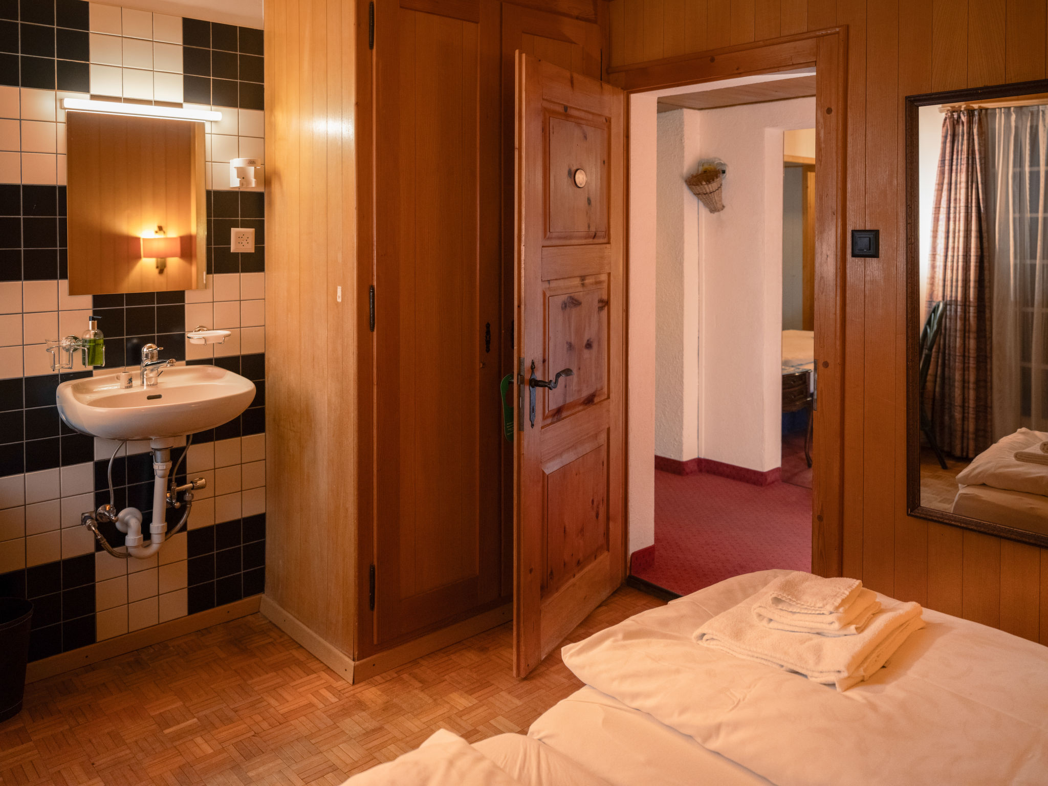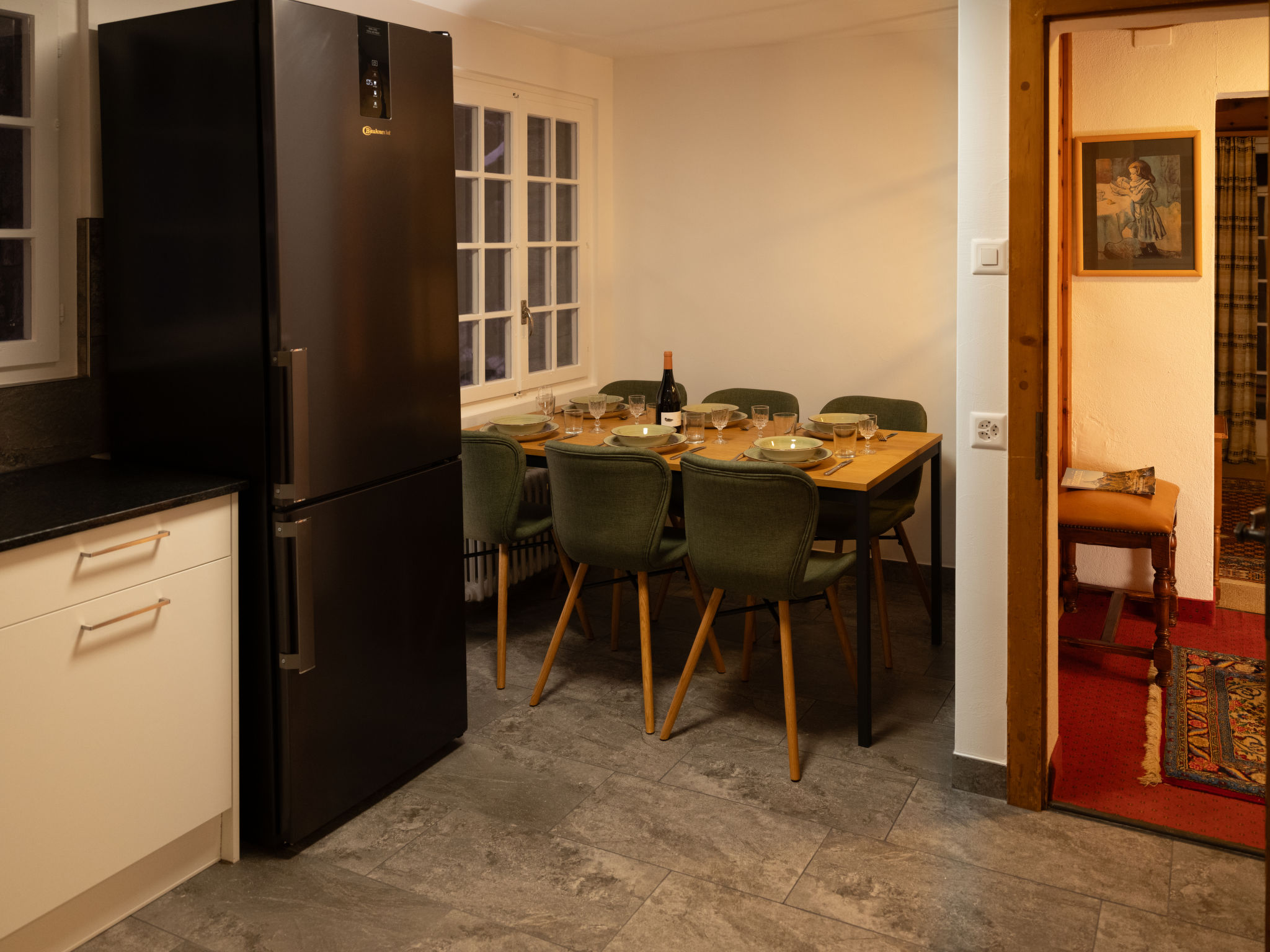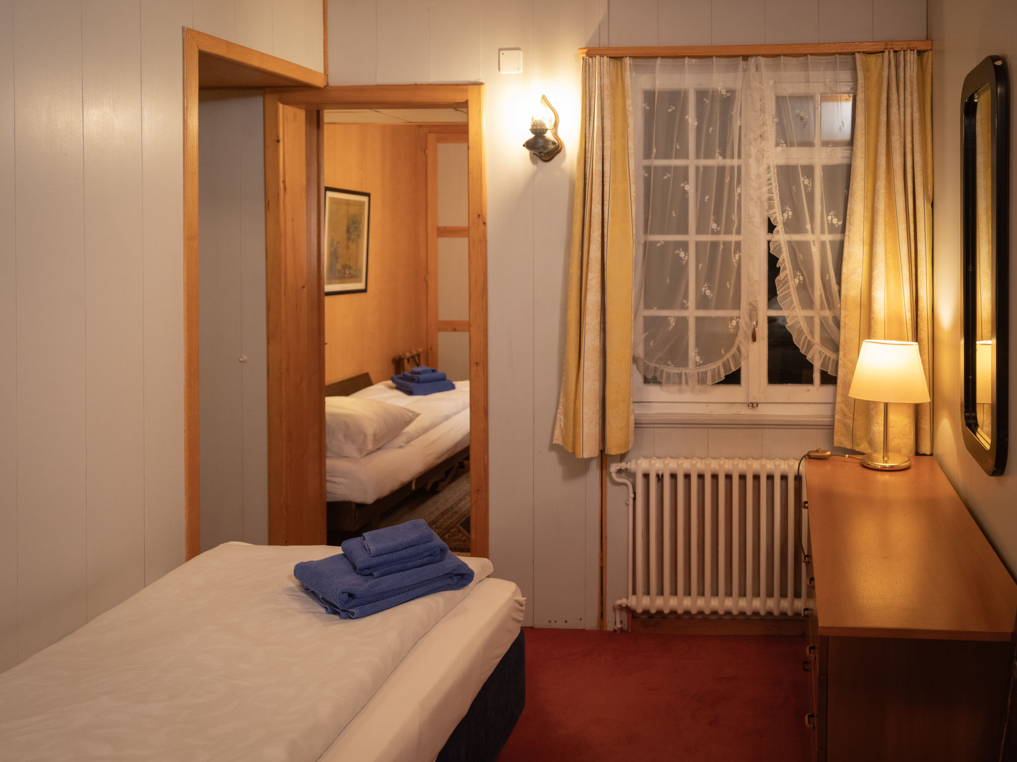 "Chalet Turquino / Apartment Marmotte", 4-Zimmer-Wohnung 90 m2, im Erdgeschoss, Südostlage. Objekt geeignet für 4 Erwachsene + 1 Kind. Einfach und gemütlich eingerichtet: Wohnzimmer mit offenem Kamin (nur Deko), TV. Ausgang zum Balkon, Richtung Osten und Richtung Süden. 1 Zimmer mit 2 Betten (90 cm, Länge 200 cm), Waschbecken. Durchgangszimmer mit 1 Bett (90 cm, Länge 200 cm), Bad/WC. 1 Zimmer mit 1 Bett (90 cm, Länge 200 cm). 1 Zimmer mit 1 Bett (90 cm, Länge 200 cm). Küche (Backofen, Geschirrspüler, 4 Glaskeramikplatten, Mikrowelle, Tiefkühler, elektrische Kaffeemaschine). Bad/WC, sep. WC. Heizung. Balkon, Ostlage und Südlage. Seitliche Sicht auf die Berge. Zur Verfügung: Internet (Wireless LAN). Bitte beachten: Nichtraucher-Unterkunft.