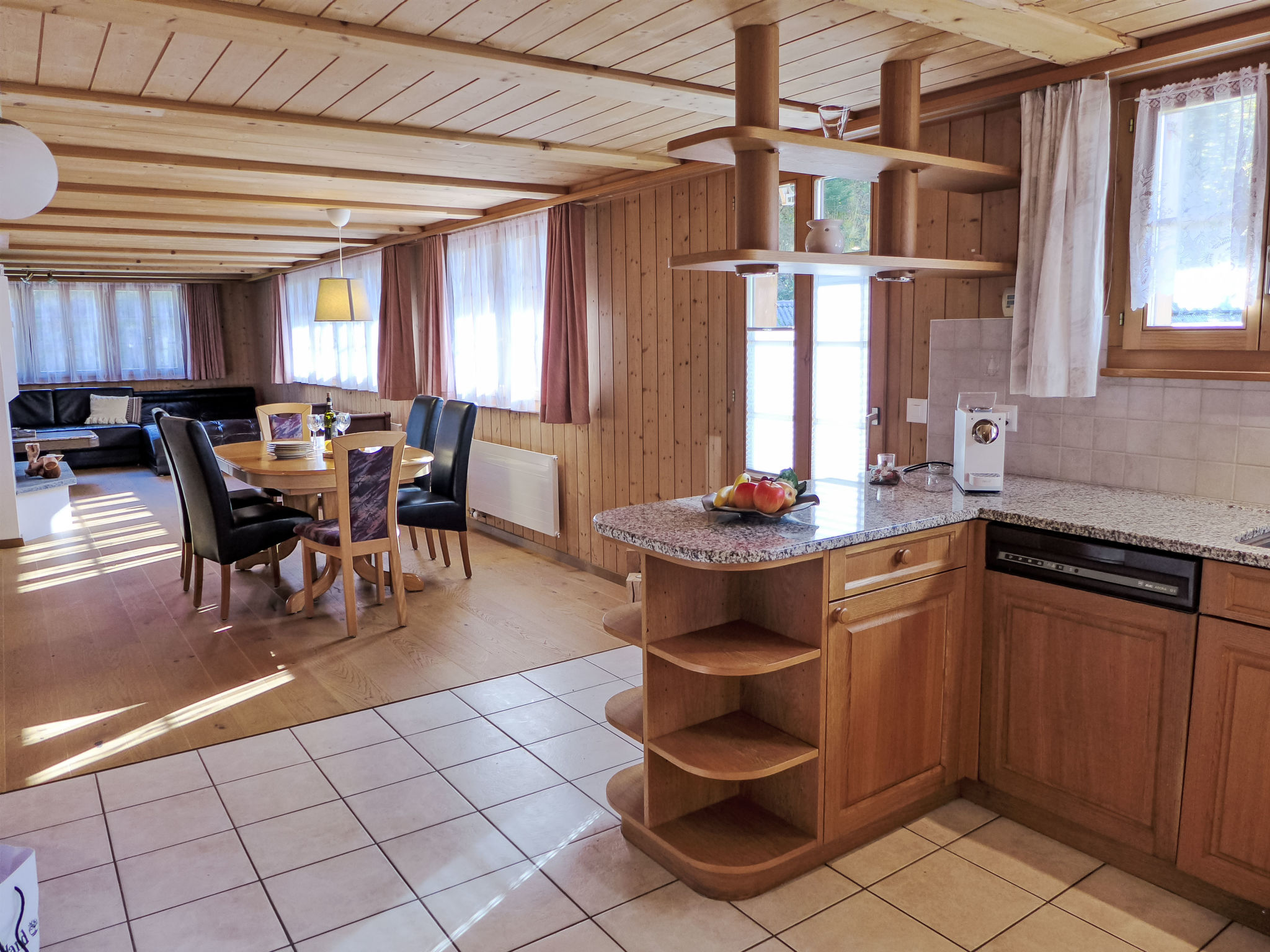 4-Zimmer-Wohnung 150 m2 im 1. Stock. Geräumig und hell, komfortabel und gemütlich eingerichtet: offenes grosses Wohn-/Esszimmer mit offenem Kamin, Esstisch, Sat-TV und Radio. Ausgang zur Terrasse. 1 grosses Zimmer mit 2 Betten (90 cm, Länge 200 cm). 1 Zimmer mit 1 franz. Bett (120 cm, Länge 200 cm). 1 kleines Zimmer mit 1 franz. Bett (140 cm, Länge 200 cm). Offene Küche (Backofen, Geschirrspüler, 4 Glaskeramikplatten, Toaster, Wasserkocher, Mikrowelle, elektrische Kaffeemaschine, Kapseln für die Kaffeemaschine (Delizio) extra, Fondue Set (Käse)). Bad/Dusche/WC mit Eckbadewanne. Holzdielenboden. Grosser Gartensitzplatz. Terrassenmöbel. Herrliche Panoramasicht auf die Berge und die Landschaft. Zur Verfügung: Babybett bis 2 Jahre, Haartrockner. Internet (WLAN, gratis). Bitte beachten: Nichtraucher-Unterkunft. Maximal 1 Haustier/Hund erlaubt. Rauchmelder, Feuerlöscher.