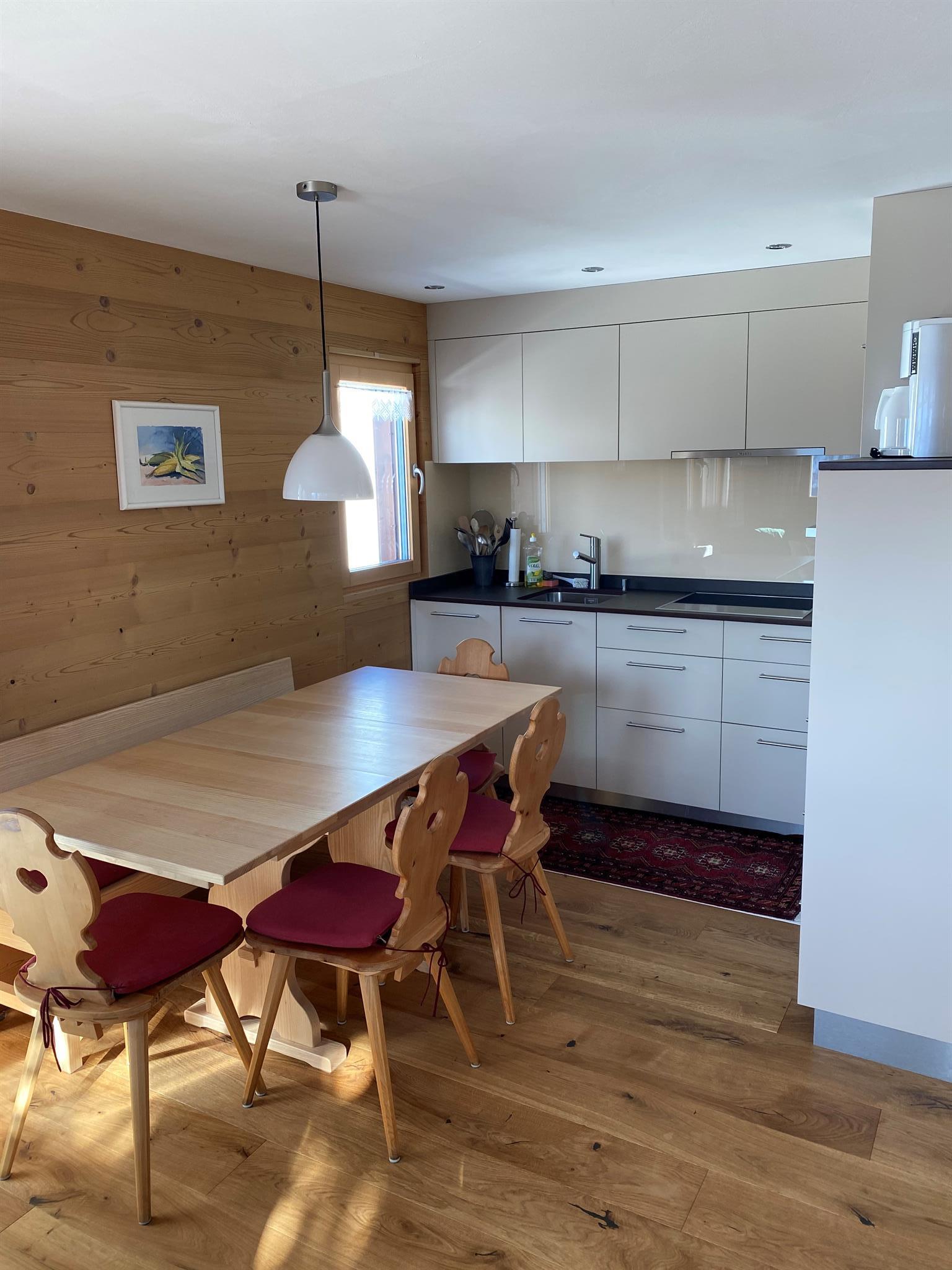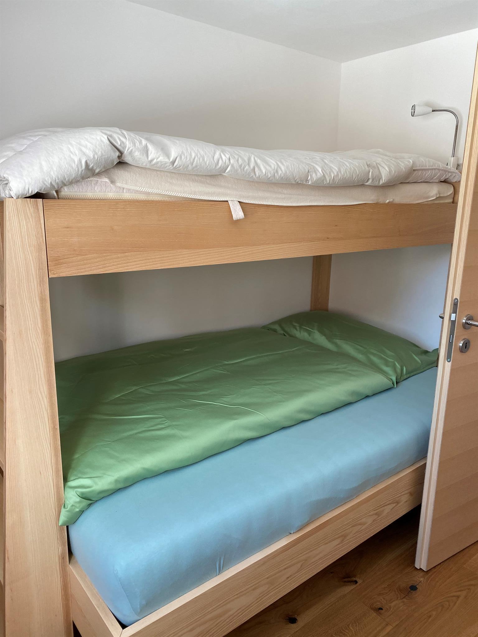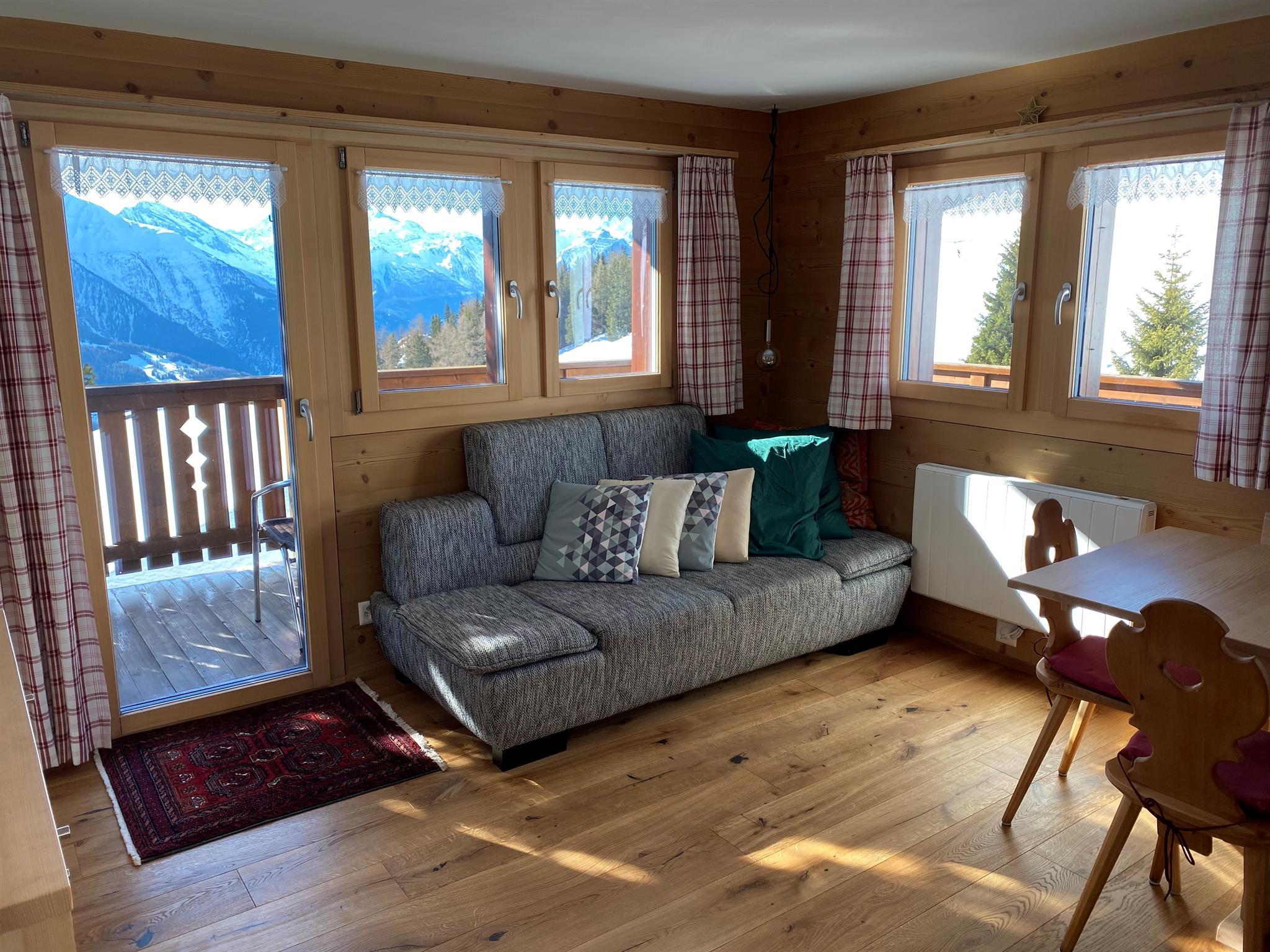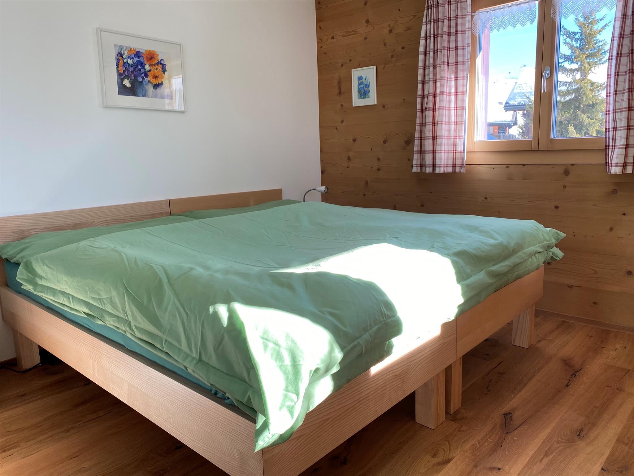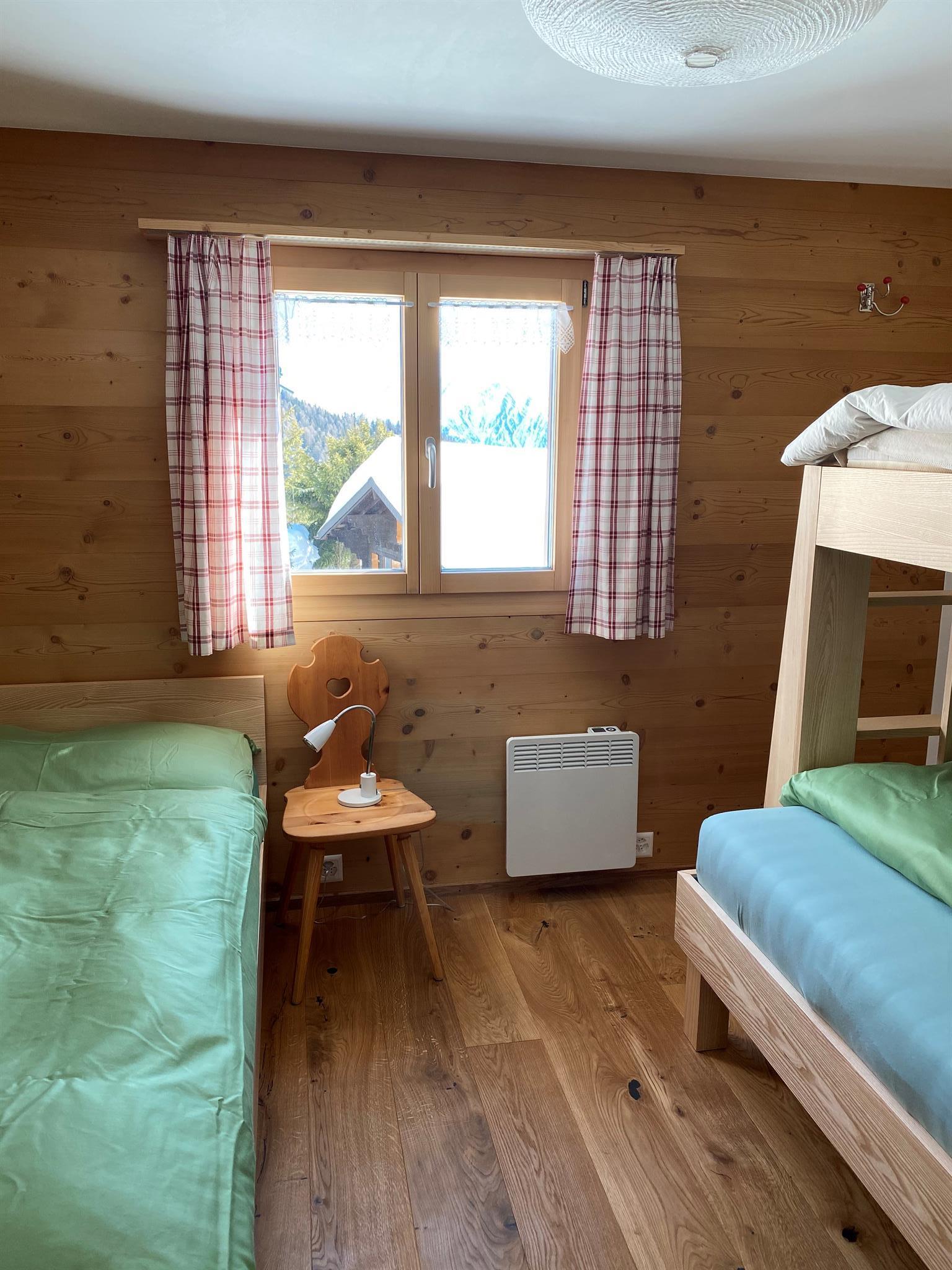 Das Chalet ist mit Arvenmöbel ausgestattet. Zwei Zimmer (1 Zimmer mit Doppelbett und 1 Zimmer mit Etagenbett und Einzelbett - max. 5 Personen) warten auf Sie!