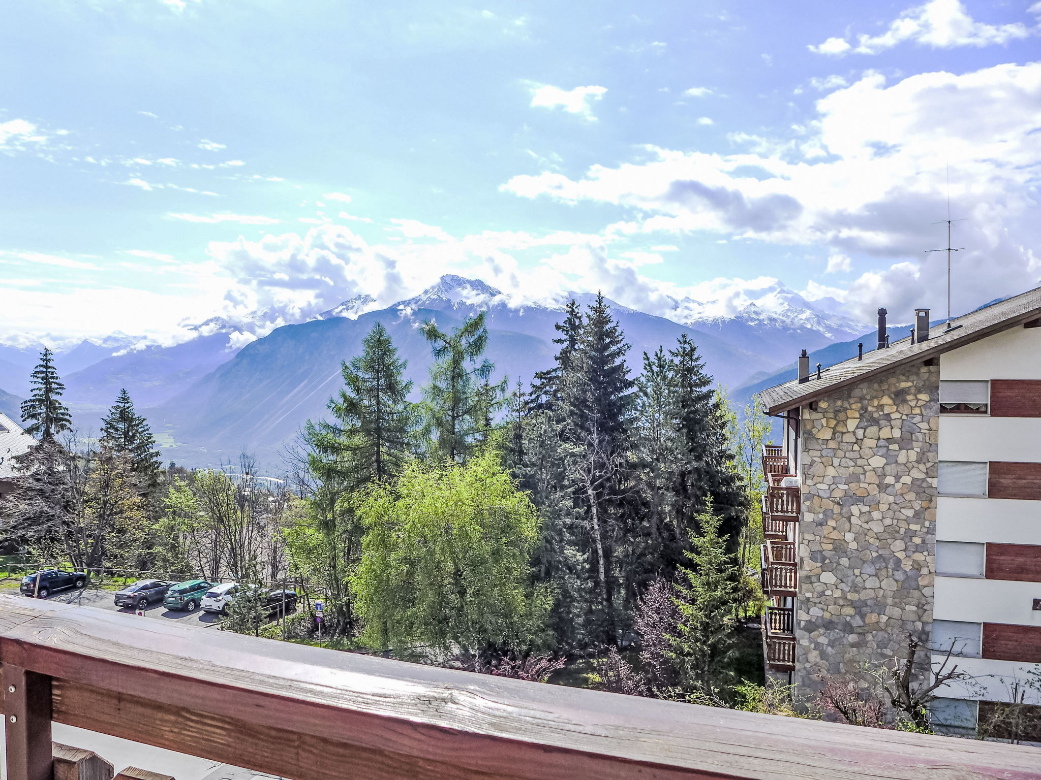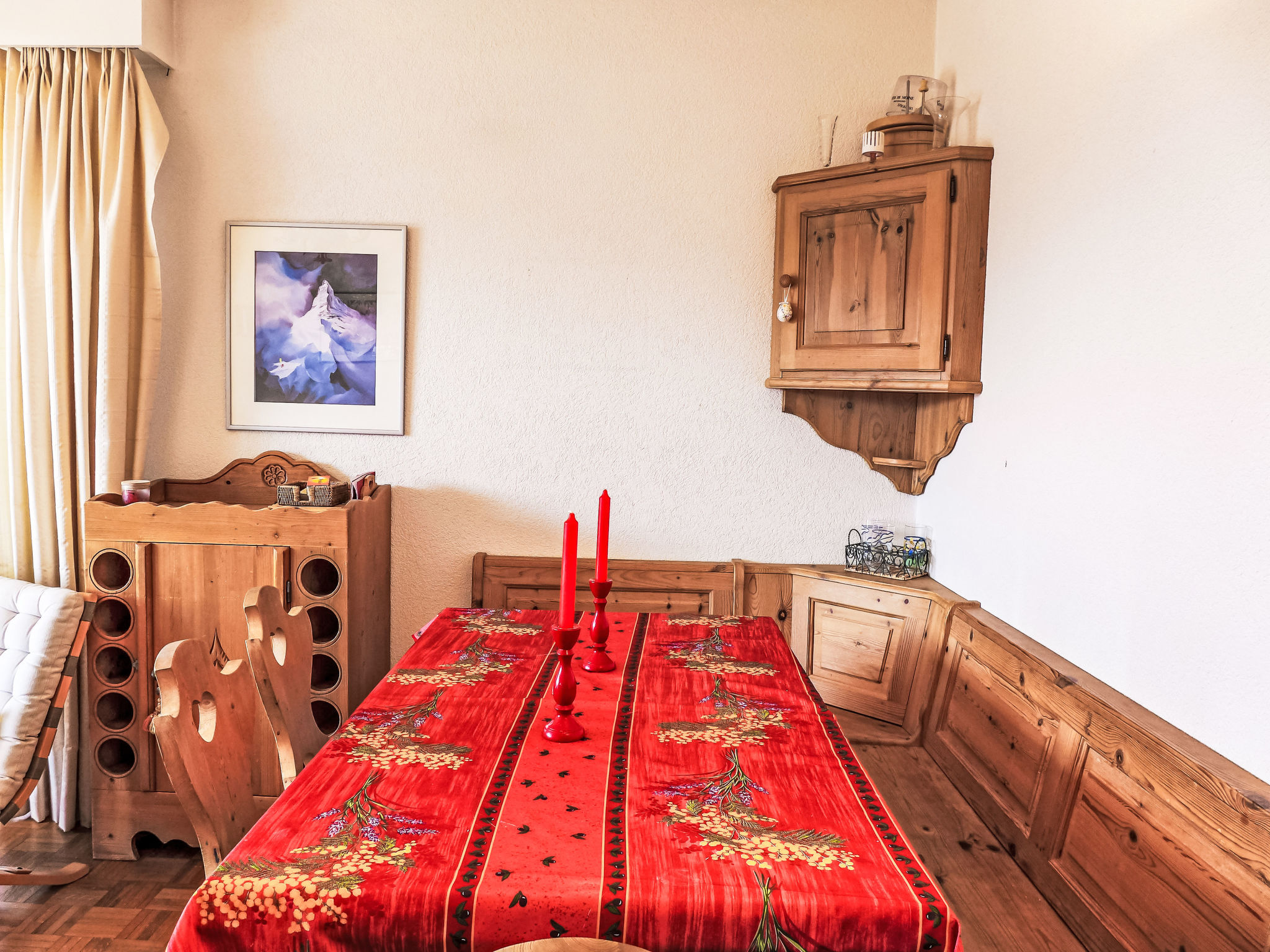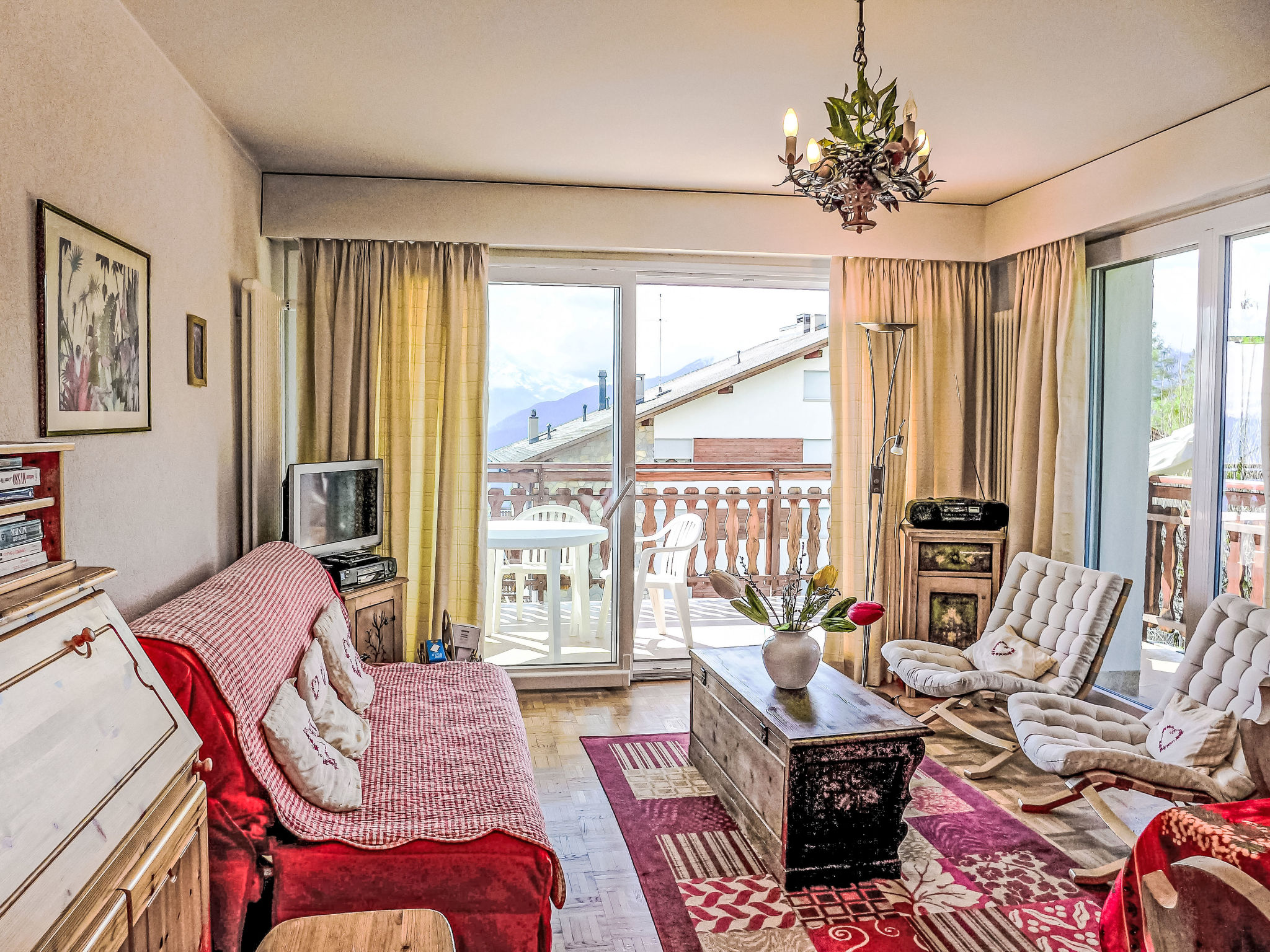 Residenz "Marigny Cervin". Im Ortsteil Marigny, am Ortsrand, 1.5 km vom Zentrum von Montana, ruhige, sonnige Lage, 150 m vom Waldrand, 1.3 km vom See, Richtung Süden. In der Anlage: Fahrstuhl, Skiraum, Zentralheizung, Waschmaschine, Wäschetrockner (zur Mitbenutzung, extra), Trockenraum. Parkplatz (beschränkte Anzahl). Einkaufsgeschäft 1.5 km, Supermarkt 1.6 km, Restaurant 1.5 km, Bäckerei 900 m, Bushaltestelle "Marigny" 160 m. Golfplatz (18 Loch) 3 km, Tennis 1.4 km, Tennishalle 1.4 km, Skisportanlagen 1.3 km, Skibushaltestelle 50 m, Eisfeld 2 km. Bekannte Seen in der Umgebung sind gut erreichbar: Etang Long 3 km, Lac Grenon 2.5 km. Bitte beachten: Gratis Skibus.