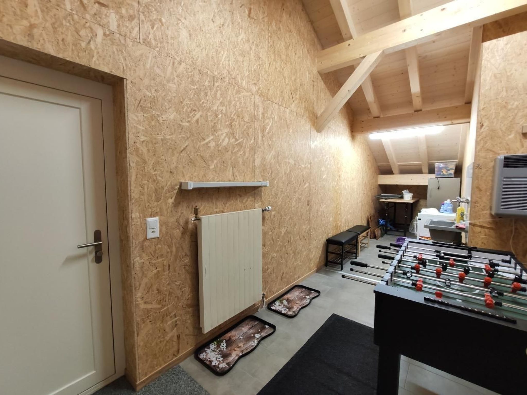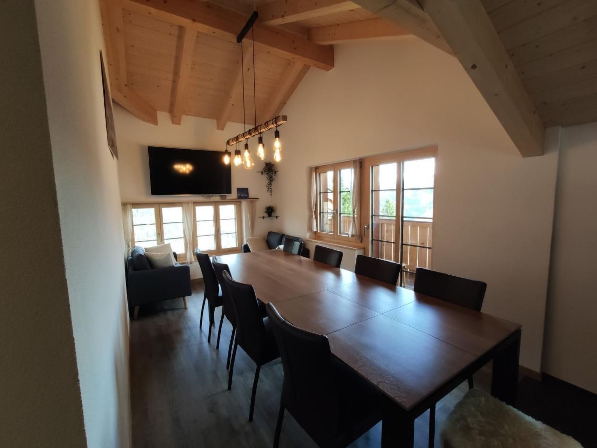Der Innenbereich der Wohnung im ersten Stock besticht durch seine Großzügigkeit und bietet Platz für bis zu 10 Personen. Nach der kompletten Sanierung im Sommer 2022 fehlt es Ihnen an nichts: Gratis WLAN, Swisscom TV, eine voll ausgestattete Küche mit Backofen, Kaffeemaschine, Geschirrspüler und sogar 2 Raclette-Öfen sowie 2 Fondue Caquelons für gemütliche Abende stehen bereit. Drei Schlafzimmer mit komfortablen Betten, ein großes Bad mit Dusche, ein separates WC, und nicht zuletzt eine großzügige Garderobe mit einer Waschmaschine und einem Töggelikasten (Tischfußball) ergänzen das Angebot.