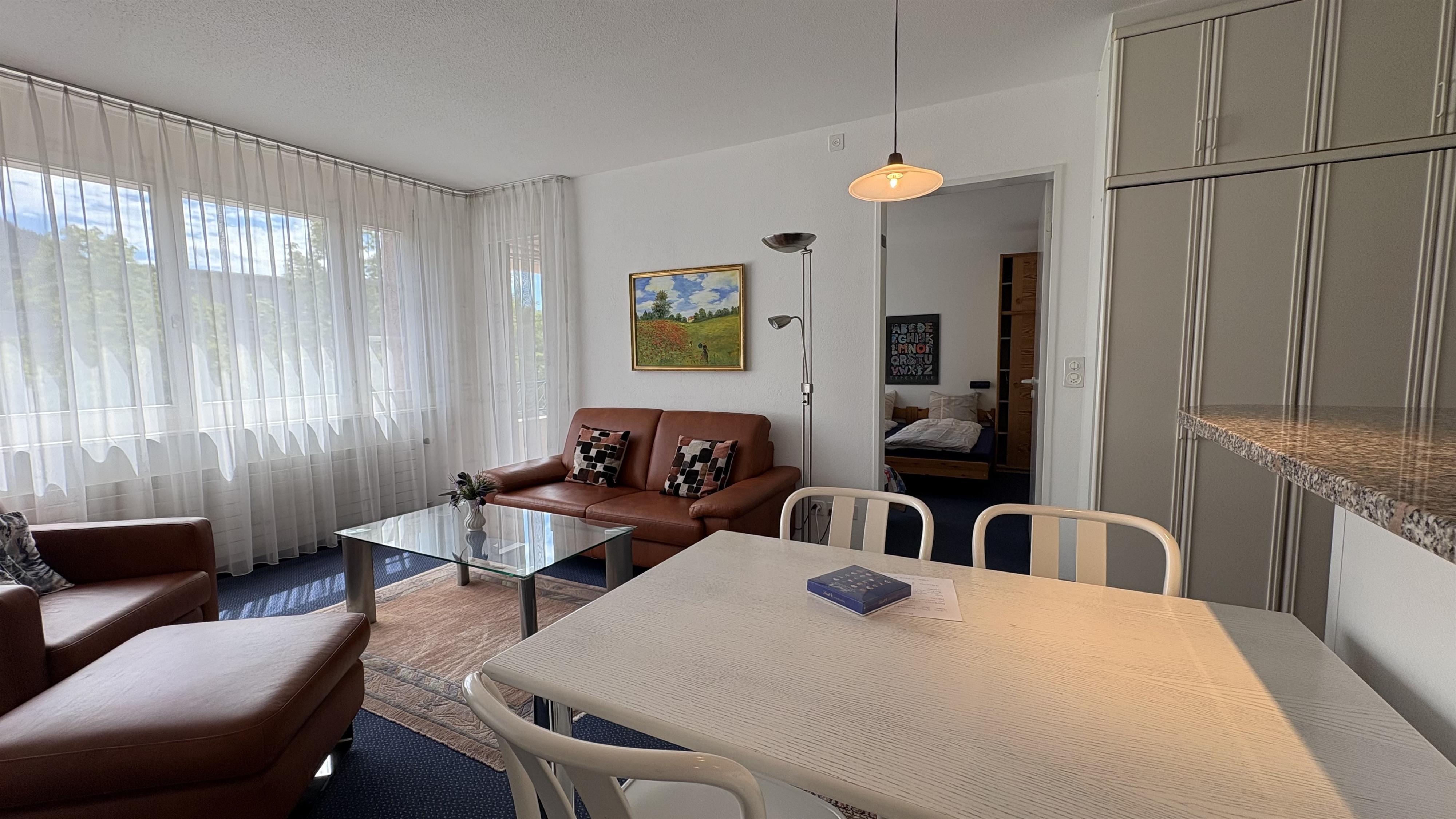 2 1/2 Zimmerwohnung im 1. Stock (50m2), Lift, Südbalkon, Autoabstellplatz in Garage, Mitbenützung des Gartens und des Kinderspielplatzes; Waschmaschine, Tumbler, Skiraum, Rollstuhl geeignet, Haustiere verboten. Küche im Wohnzimmer integriert, Backofen, Kühlschrank, Geschirrspülmaschine, Kaffeemaschine, Bad/WC, Schlafzimmer mit 2 Einzelbetten, Wohnzimmer, Bettwäsche, Frotteewäsche, Küchentücher, Duvet mit Daunen (nordisch), Wohnzimmer mit Esstisch, Sitzgruppe, Salontisch, Telefon, TV, WLAN, Radio, WC-Papier, Abfallsäcke blau.