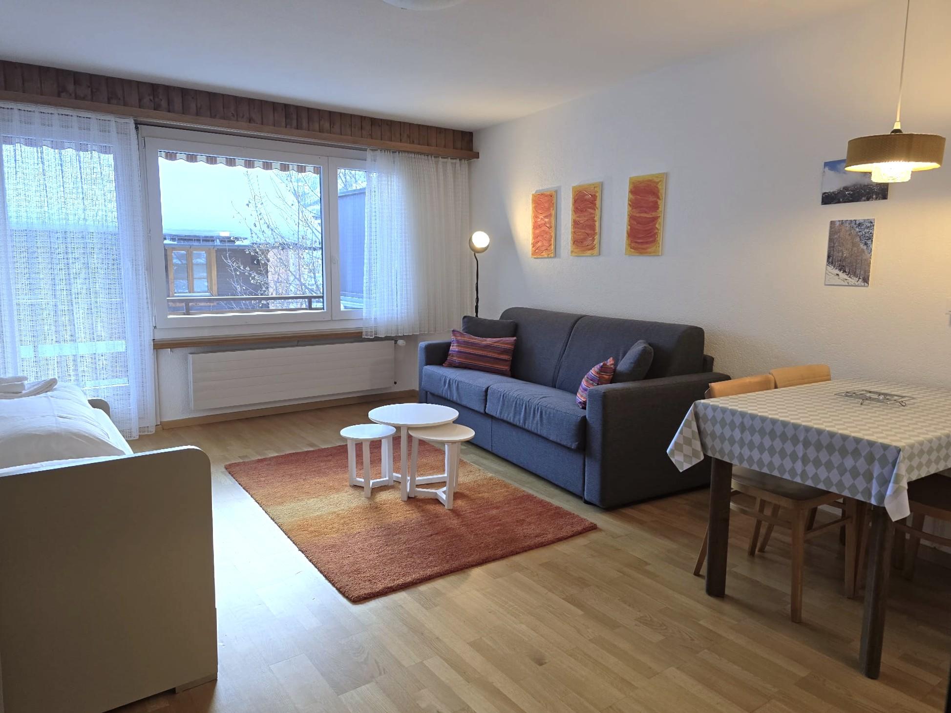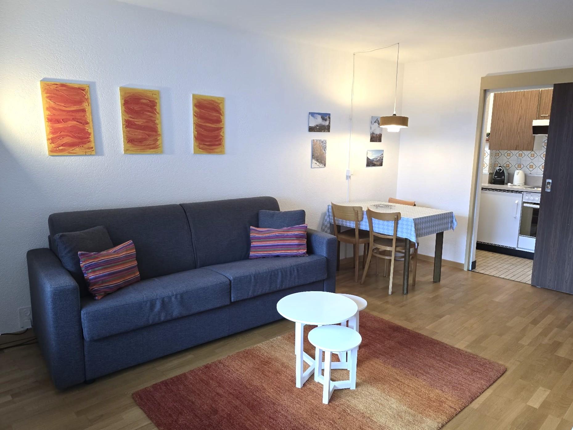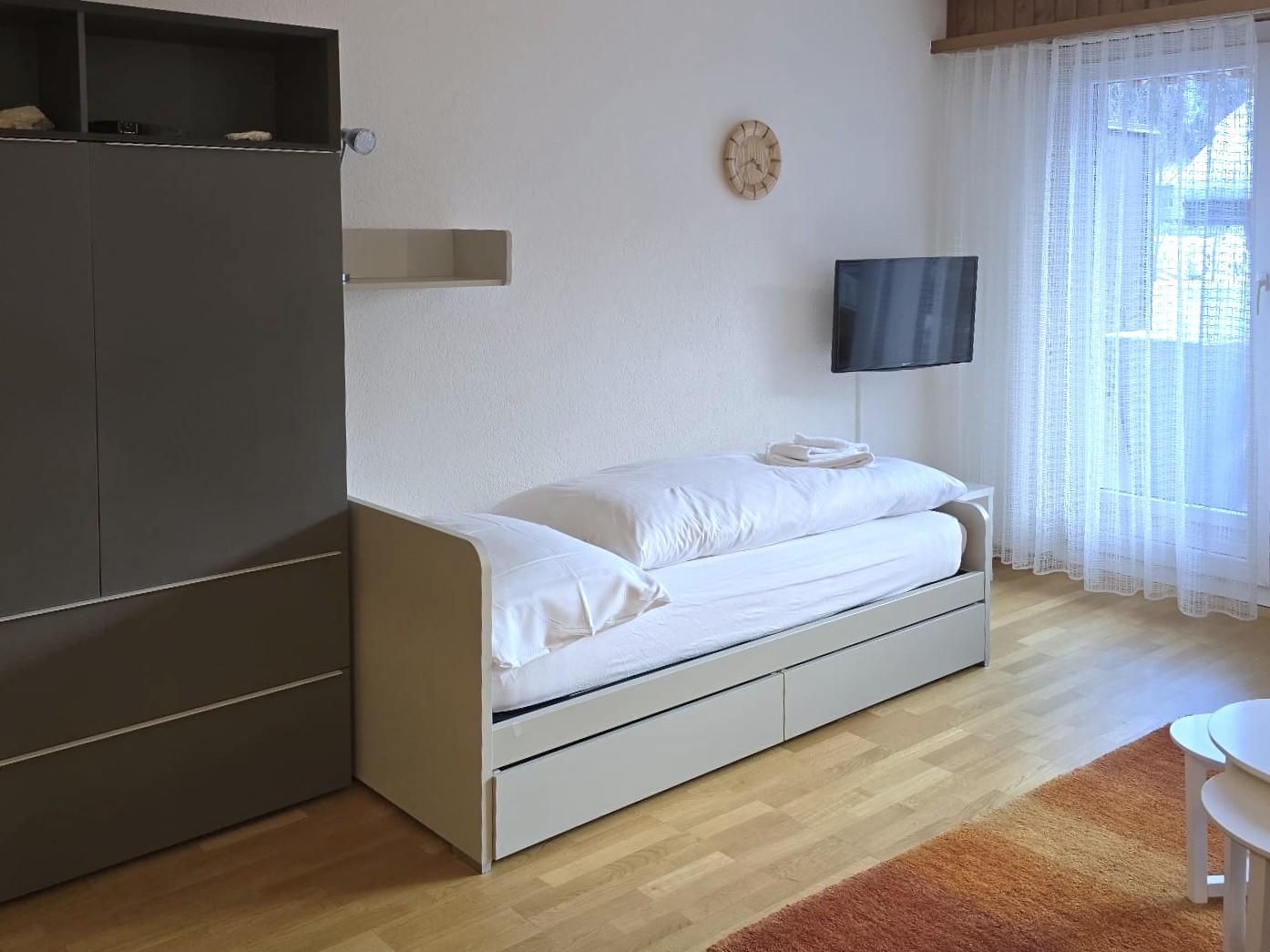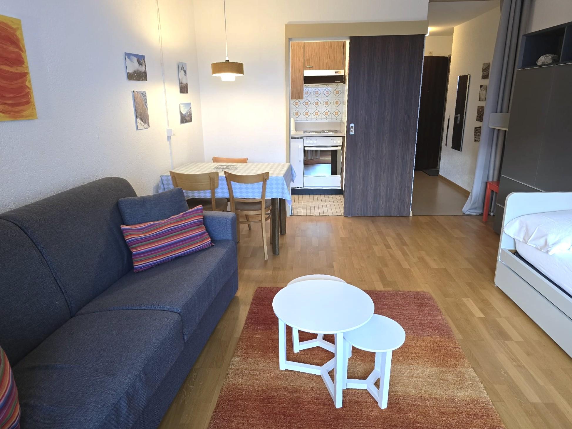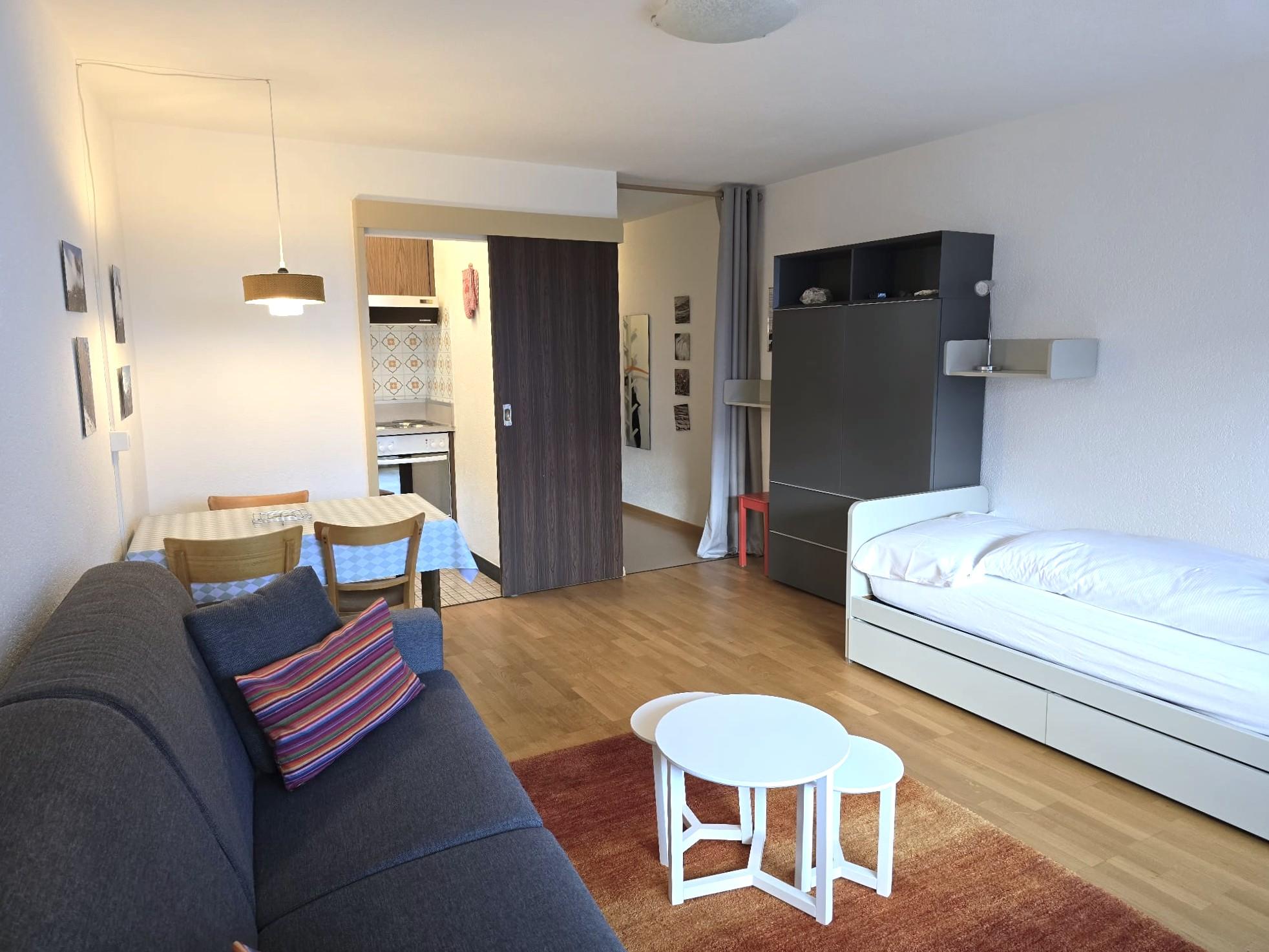 1-Zimmerwohnung: Wohn/Ess/Schlafzimmer mit 2 Betten, Küche, Dusche/WC, Südbalkon, gratis WLAN, Radio, TV. Garage zu mieten.