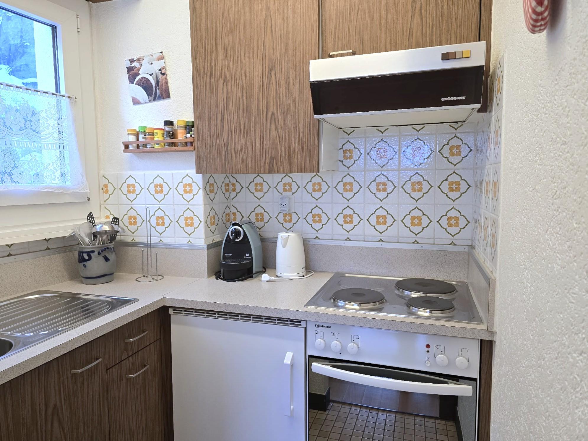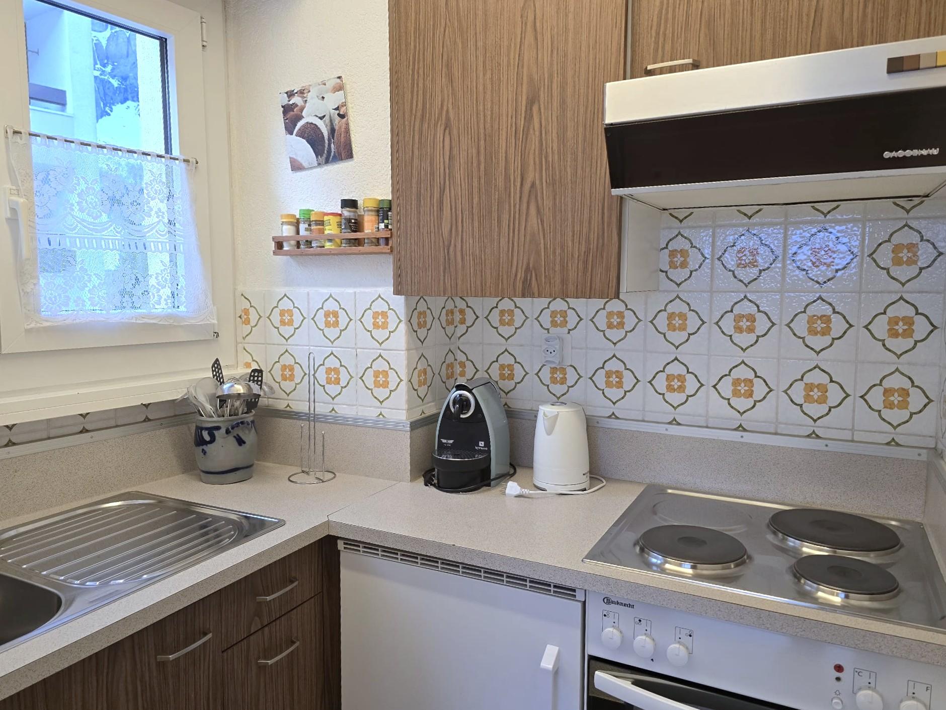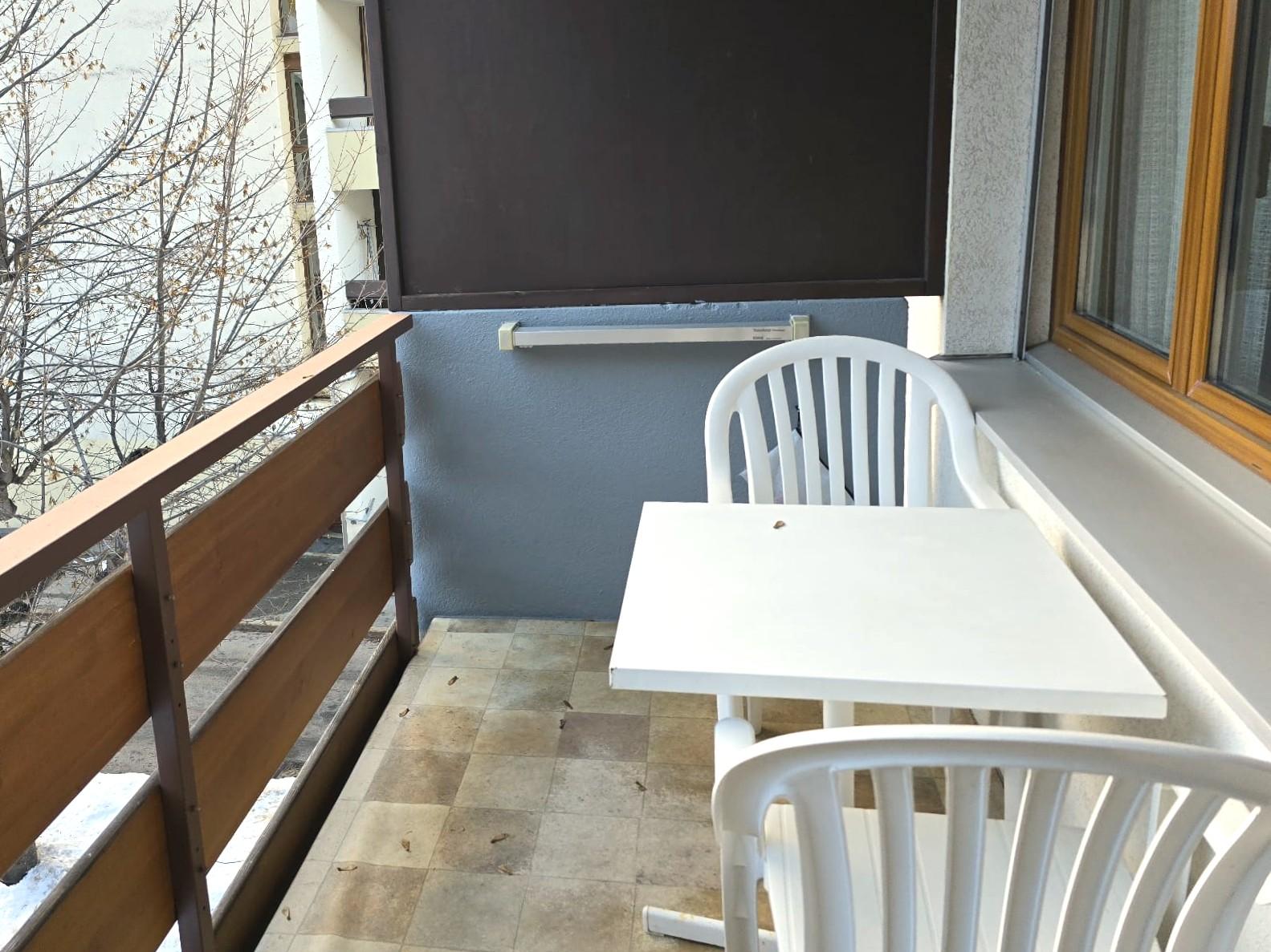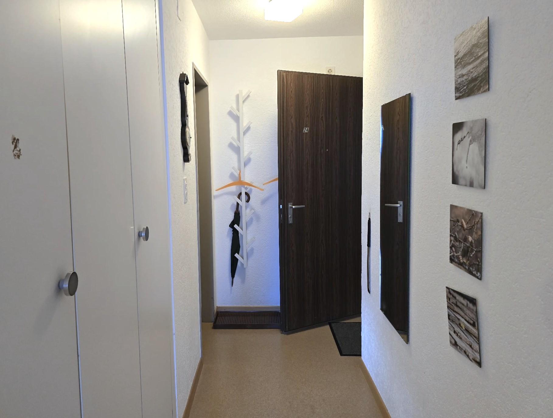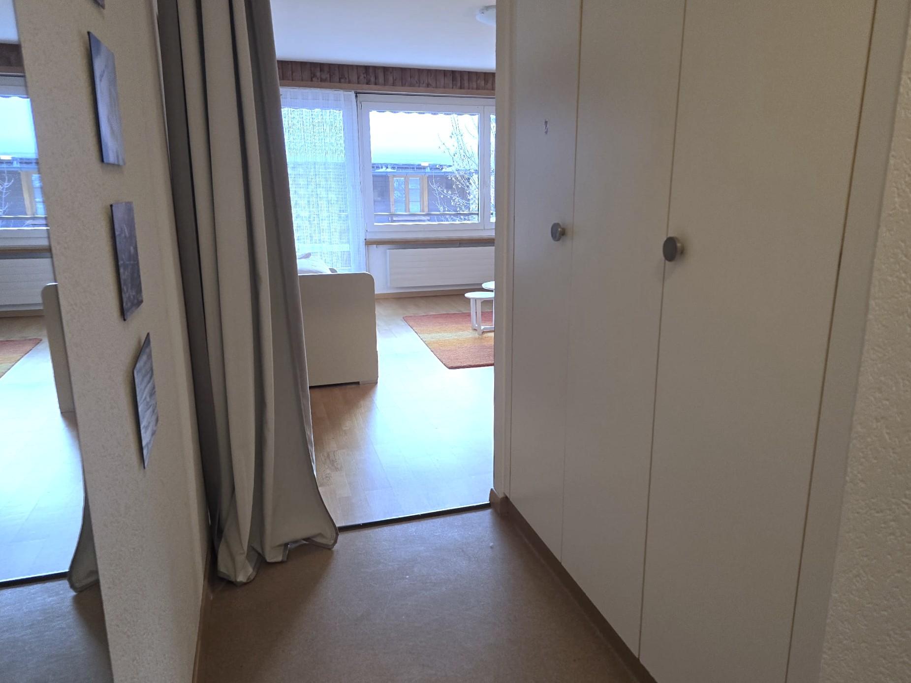 1-Zimmerwohnung: Wohn/Ess/Schlafzimmer mit 2 Betten, Küche, Dusche/WC, Südbalkon, gratis WLAN, Radio, TV. Garage zu mieten.