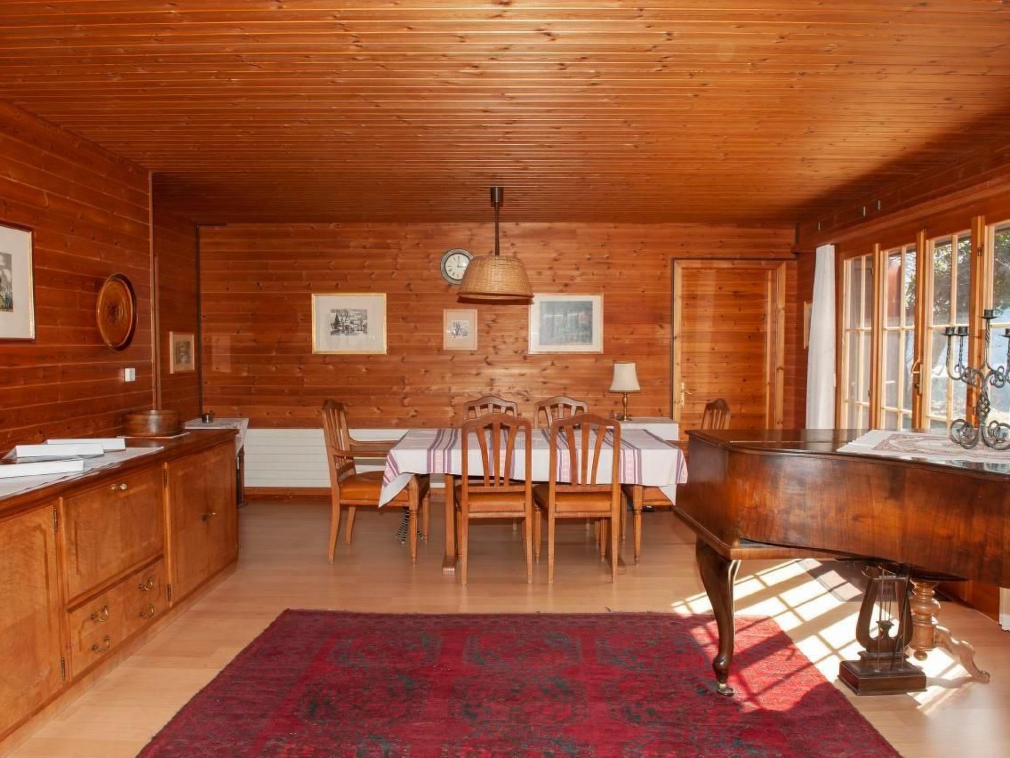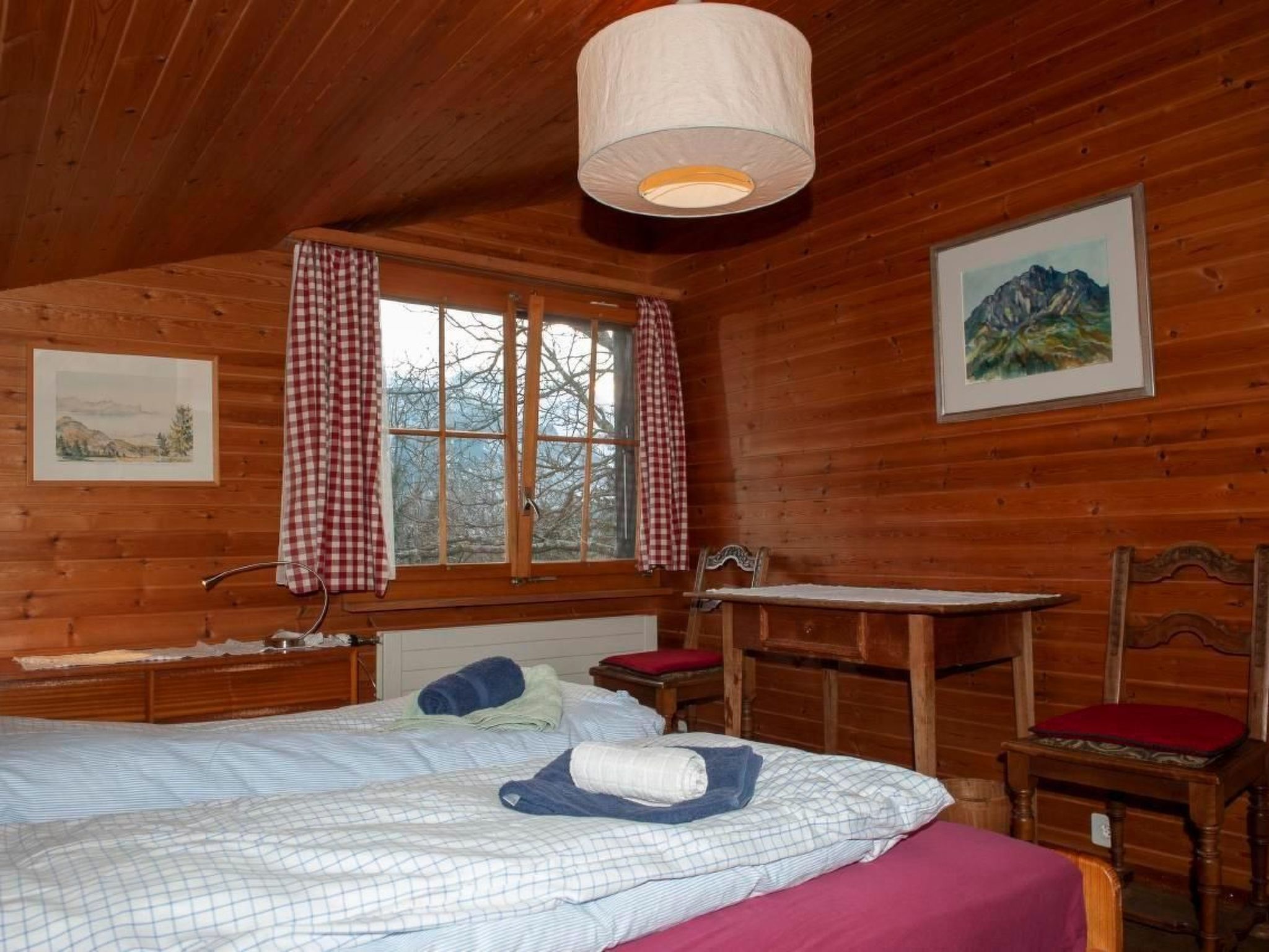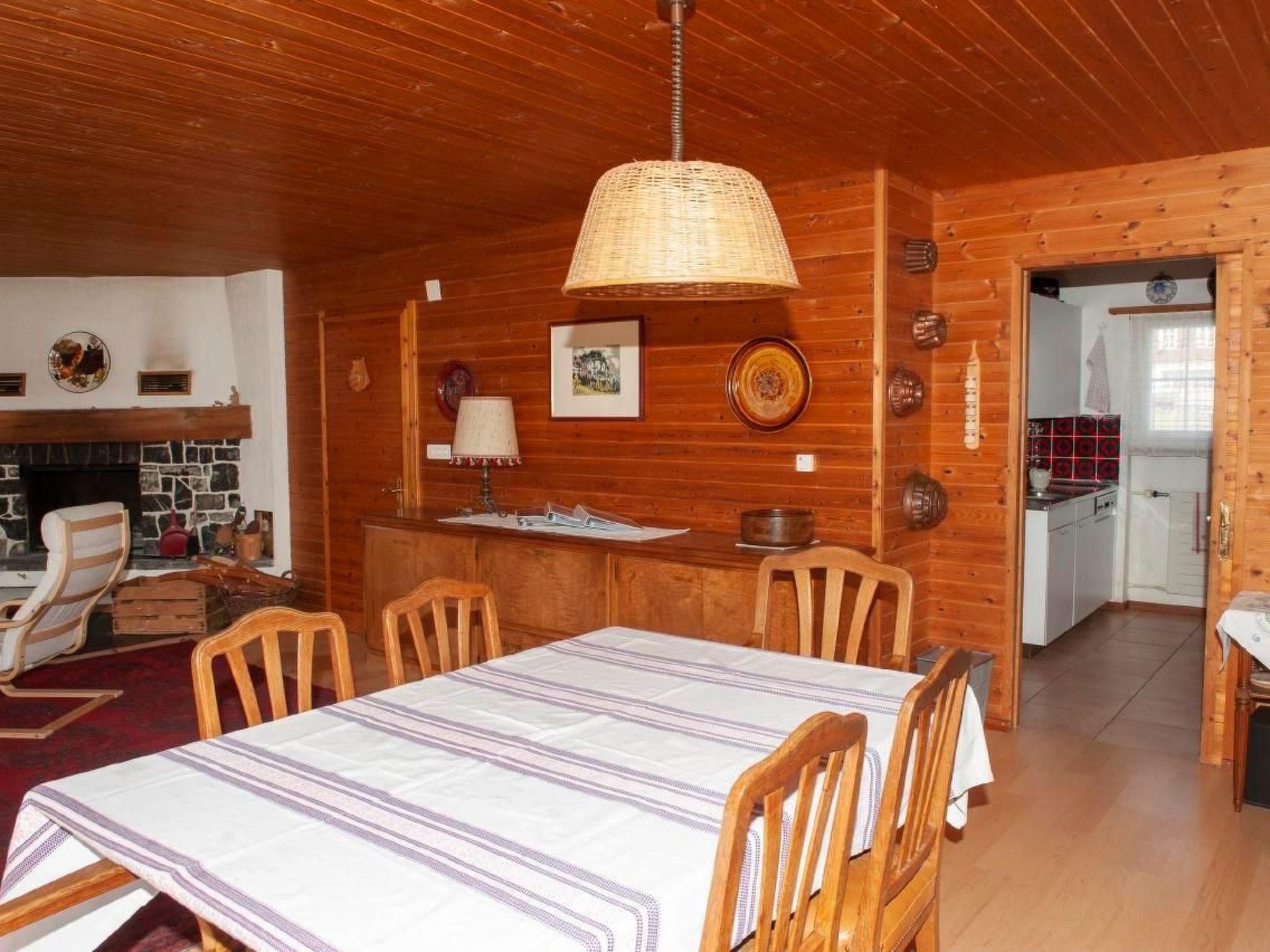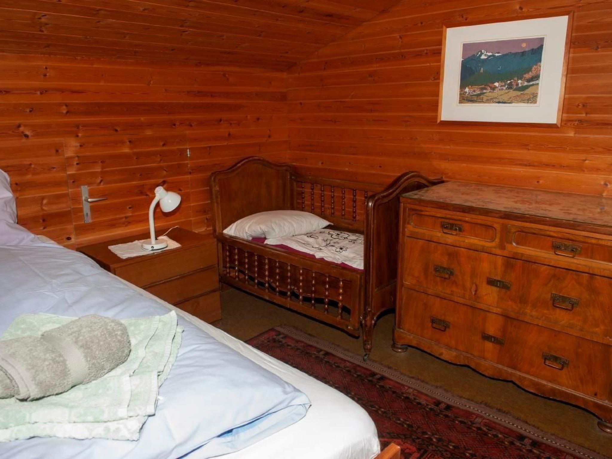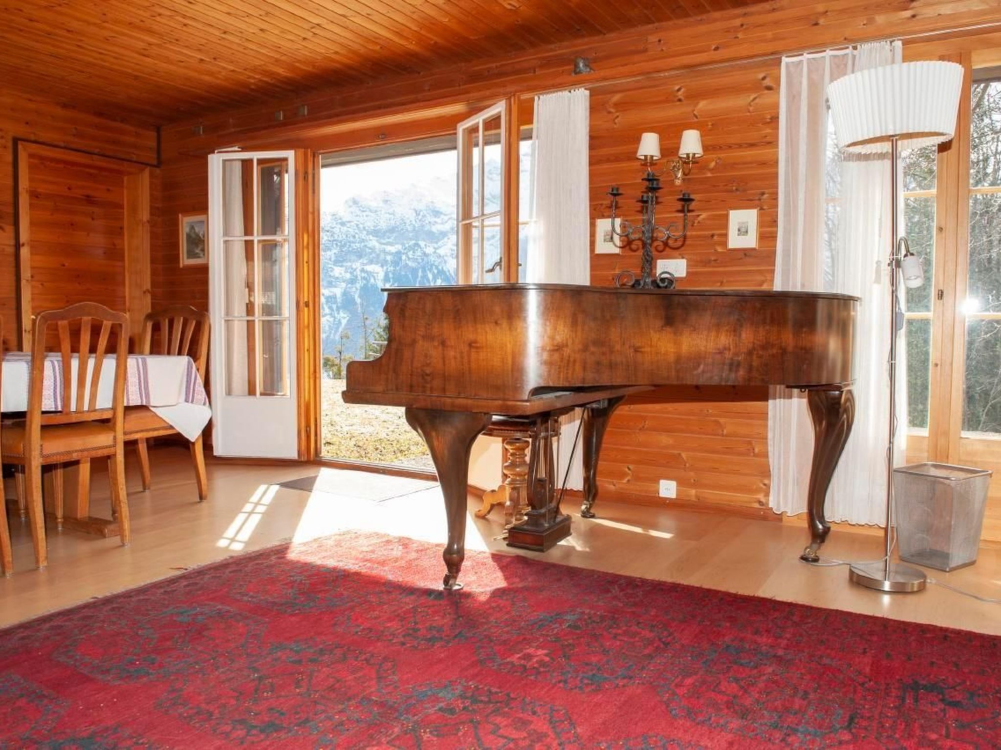 Die Innenausstattung lässt kaum Wünsche offen. und eine vollständig eingerichtete Küche mit vier Herdplatten und Backofen, Geschirrspüler, Raclette- und Fondue-Ausrüstung und einer Kapsel-Kaffee-Maschine. Im geräumigen Wohnzimmer laden der Esstisch mit 9 Stühlen und das Cheminée mit einer Sitzgruppe zu gemütlichen Stunden ein; mit einem kleinen Flügel, einer Stereoanlage und Swisscom-TV, einer Spielesammlung und einer grossen Auswahl von Belletristik und Krimis in der Hausbibliothek ist für Unterhaltung gesorgt. - Zwei Schlafzimmer im ersten Stock bieten jeweils 2 Schlafplätze (eines mit einem Doppelbett und eines mit einem Grand LIt und einem Kindergitterbett), zusätzlich gibt es ein Einzelschlafzimmer im Parterre mit einem rustikalen alten Holzbett. Ein Vorraum mit Garderobe und Schuhablage, ein Heizkeller mit Waschmaschine, ein Badezimmer mit Badewanne und eine separate Toilette runden die Innenausstattung ab.