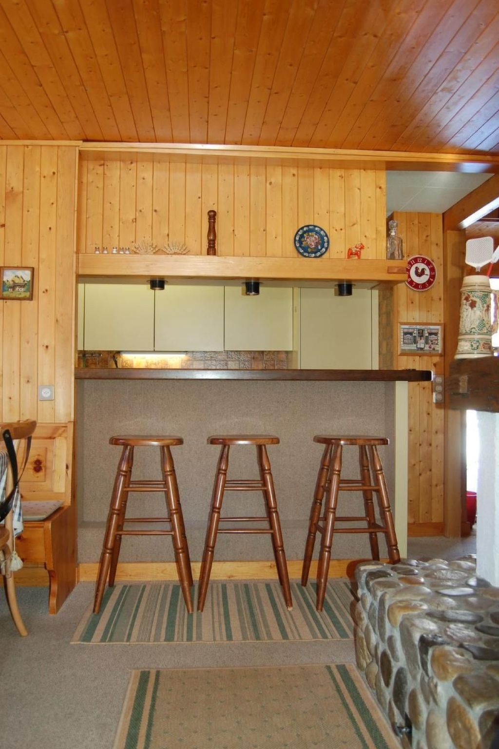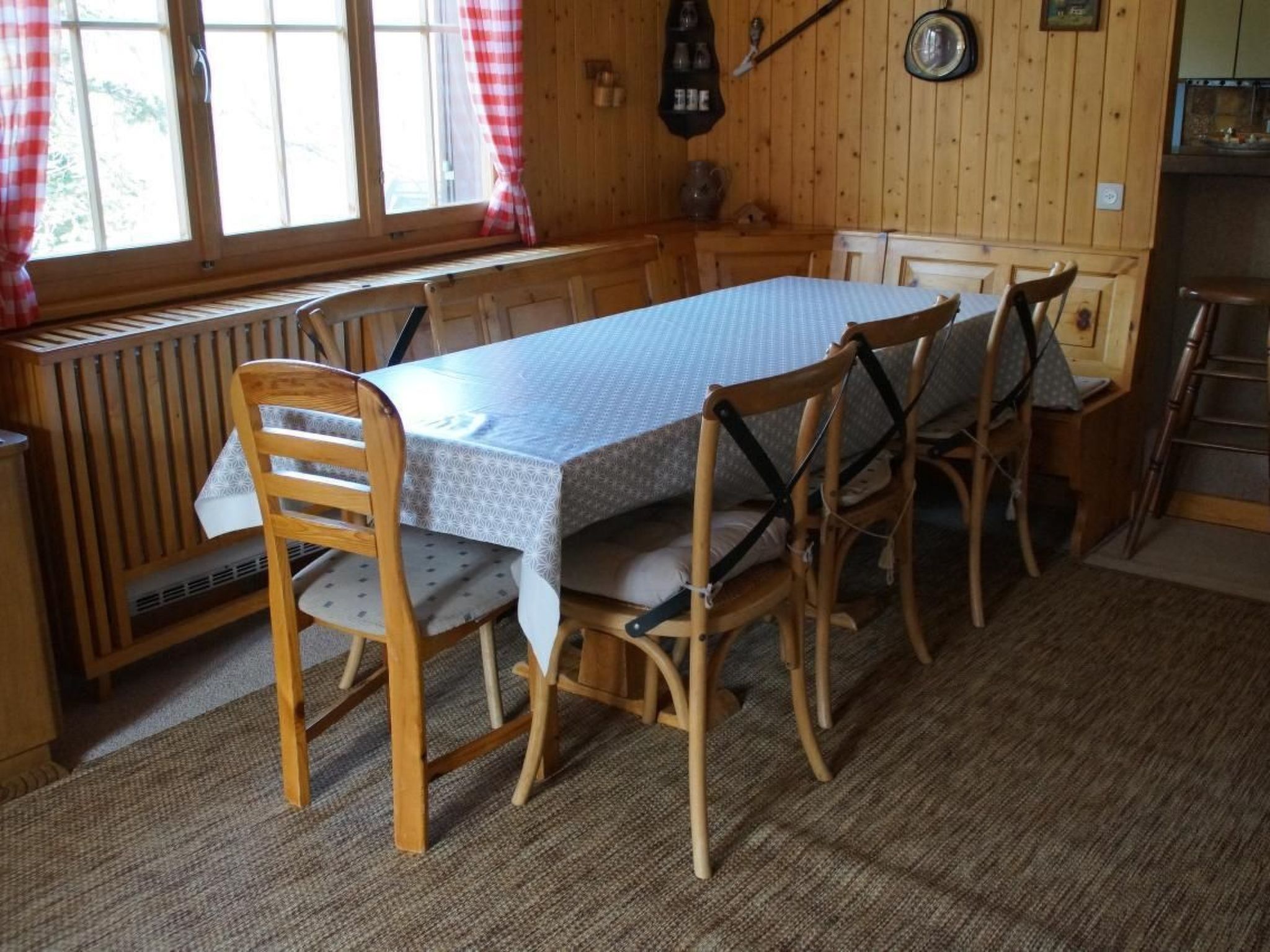 Innen bietet das Chalet einen offenen Wohn-/Essbereich mit Cheminée, der zum Entspannen und Genießen einlädt. Die Küche ist mit modernen Geräten wie Ceran-Kochfeld, Backofen, Kühlschrank und Geschirrspülmaschine ausgestattet. Zusätzlich verfügt sie über eine Küchenbar mit Barhockern und eine Essecke mit Eckbank, ausziehbarem Tisch und Stühlen für bis zu 9 Personen. Alle notwendigen Küchenutensilien, vom 12-teiligen Essgeschirr bis hin zum Raclette-Grill, sind vorhanden, um jeden kulinarischen Bedarf zu decken.