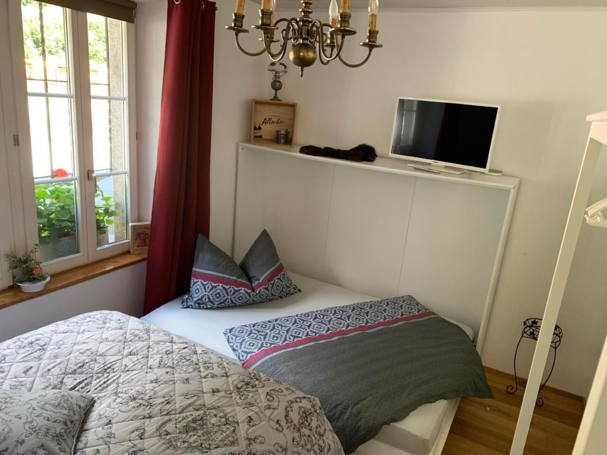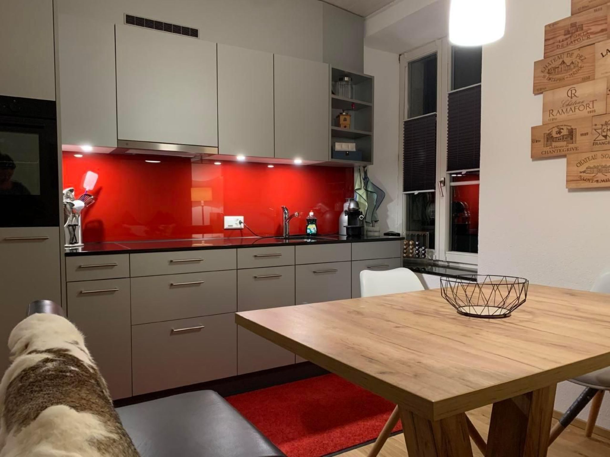 Im Herzen dieser reizvollen Wohnung befindet sich der helle und offene Wohn- und Essbereich. Die moderne Küche verführt mit ihrer roten Glasrückwand und ist hochwertig ausgestattet – inklusive Spülmaschine, Mikrowelle, Ceranfeld, Kühlschrank, Nespressomaschine, Wasserkocher und allem, was Sie sonst noch benötigen. Der angrenzende Essbereich, mit seiner gemütlichen Eckbank und dem Tisch, lädt zu entspannten Mahlzeiten in heimischer Atmosphäre ein. Der stilvolle Wohnbereich, ausgestattet mit einer ausziehbaren Couch, TV und WLAN, ist der perfekte Ort, um die Abende ausklingen zu lassen.