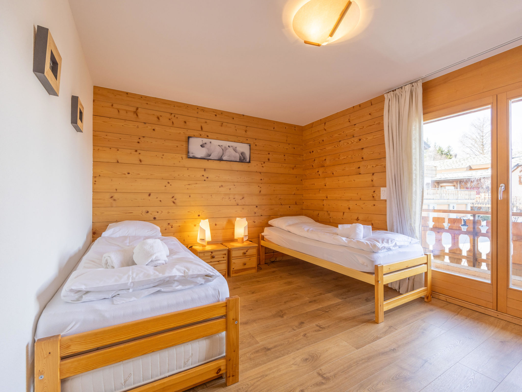 "Grands Ducs 202G", 4-Zimmer-Wohnung 95 m2 im 2. Stock. Komfortabel und schön eingerichtet: Wohn-/Esszimmer mit Panoramafenster mit offenem Kamin und Kabel-TV. 1 Zimmer mit 1 franz. Bett (180 cm, Länge 200 cm). 1 Zimmer mit 2 Betten (90 cm, Länge 200 cm). 1 Zimmer mit 1 x 2 Etagenbetten (90 cm, Länge 190 cm). Offene Küche (Backofen, Geschirrspüler, 4 Glaskeramikplatten, Toaster, Wasserkocher, Mikrowelle, Tiefkühler, elektrische Kaffeemaschine, Kapseln für die Kaffeemaschine (nespresso) extra, Racletteofen, Fondue Set (Chinoise, Käse)). Bad/WC, Dusche/WC. Grosser Balkon, Nordwestlage, kleiner Balkon, Südlage. Schöne Sicht auf die Berge und das Tal. Zur Verfügung: Internet (Wireless LAN, gratis). Parkplatz Nr. 202, Garage, Höhe 210 cm, Breite 230 cm. Bitte beachten: Nichtraucher-Unterkunft.