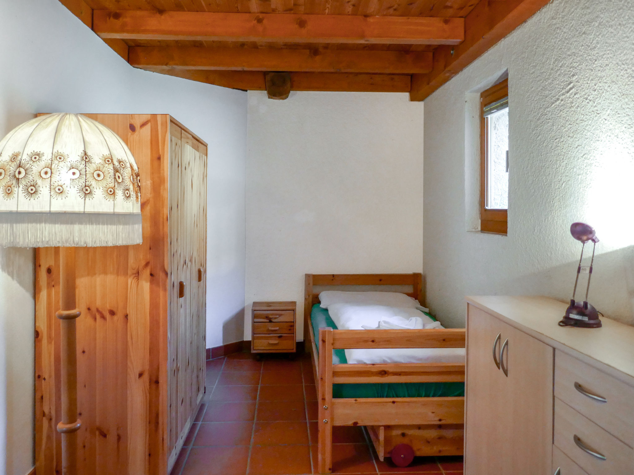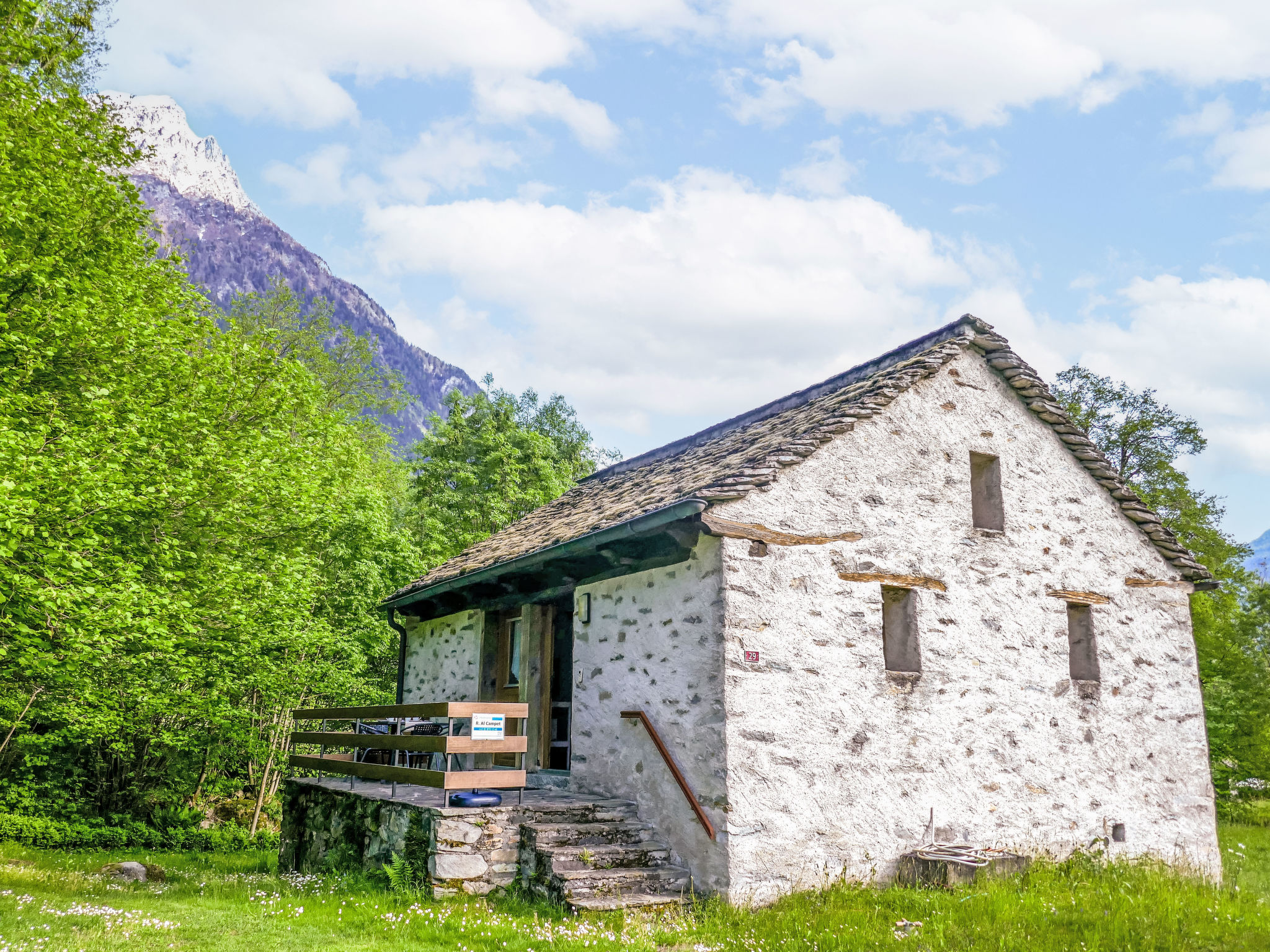 "Rustico al Campett", 4-Zimmer-Haus 110 m2 auf 3 Stockwerken. Geräumig, teilweise abgeschrägt, zweckmässig und komfortabel eingerichtet: offenes Wohn-/Esszimmer mit Esstisch, TV, Radio und Holzofen. Ausgang zur Terrasse. 1 Zimmer mit 2 Betten (90 cm, Länge 200 cm). Offene Küche (4 Glaskeramikplatten, Mikrowelle, elektrische Kaffeemaschine, Racletteofen, Fondue Set (Käse)). Unteres Geschoss: 1 Doppelzimmer mit 1 Doppelbett (1 x 160 cm, Länge 200 cm). Ausgang zum Garten. Gepäckraum. Dusche/WC. Obergeschoss: offene Galerie. Terrassenmöbel, Liegestühle. Sehr schöne Sicht auf die Berge, das Tal und die Landschaft. Zur Verfügung: Waschmaschine, Bügeleisen, Kinderhochstuhl, Babybett bis 2 Jahre (extra), Haartrockner. Internet (Wireless LAN, extra). Bitte beachten: geeignet für Familien. Nichtraucher-Haus. Feuerlöscher. NL-00001802