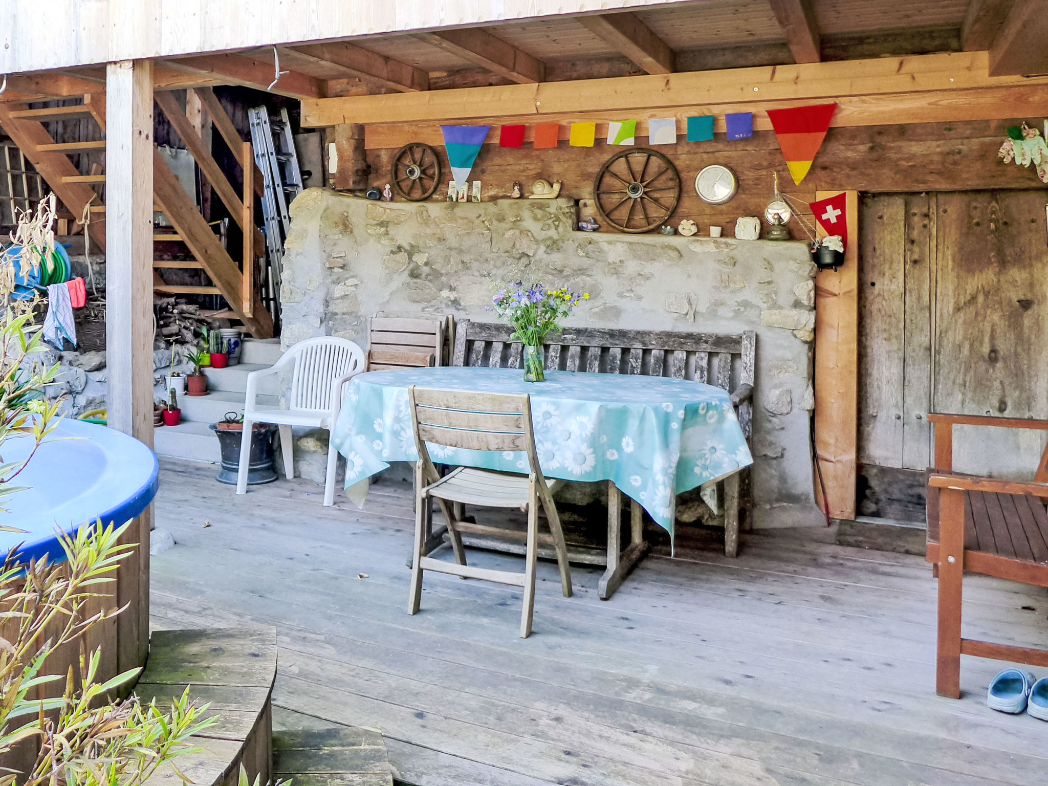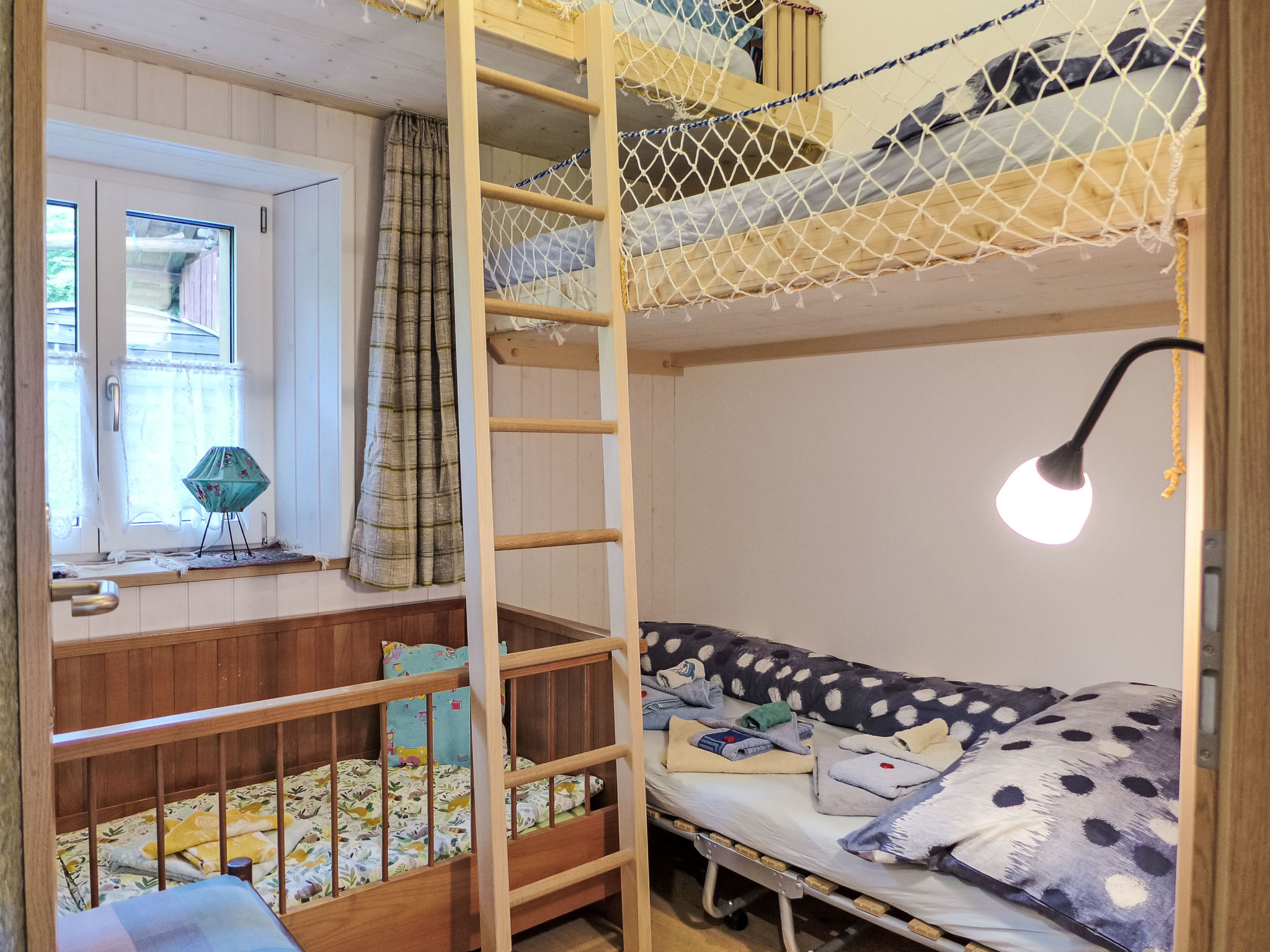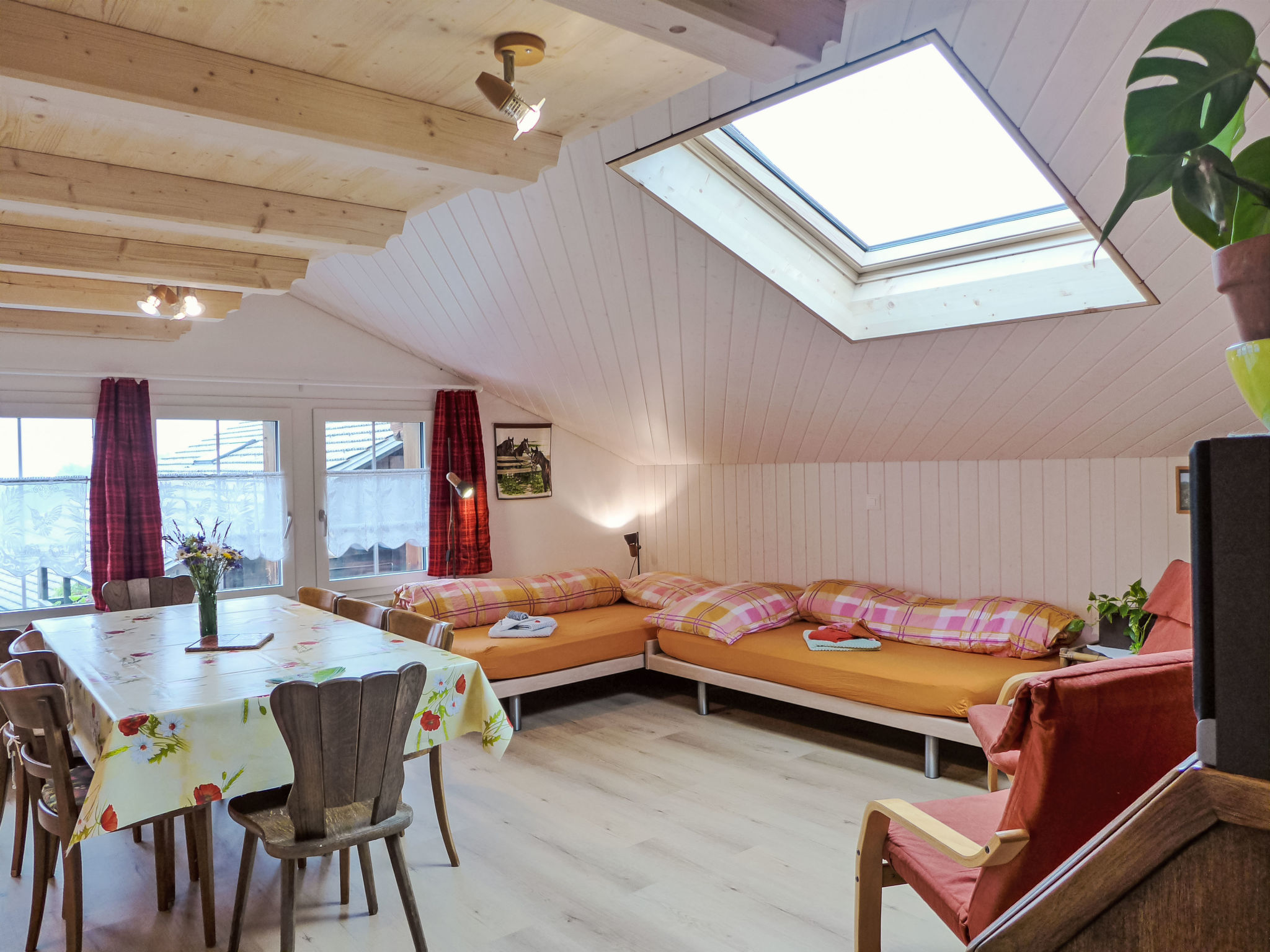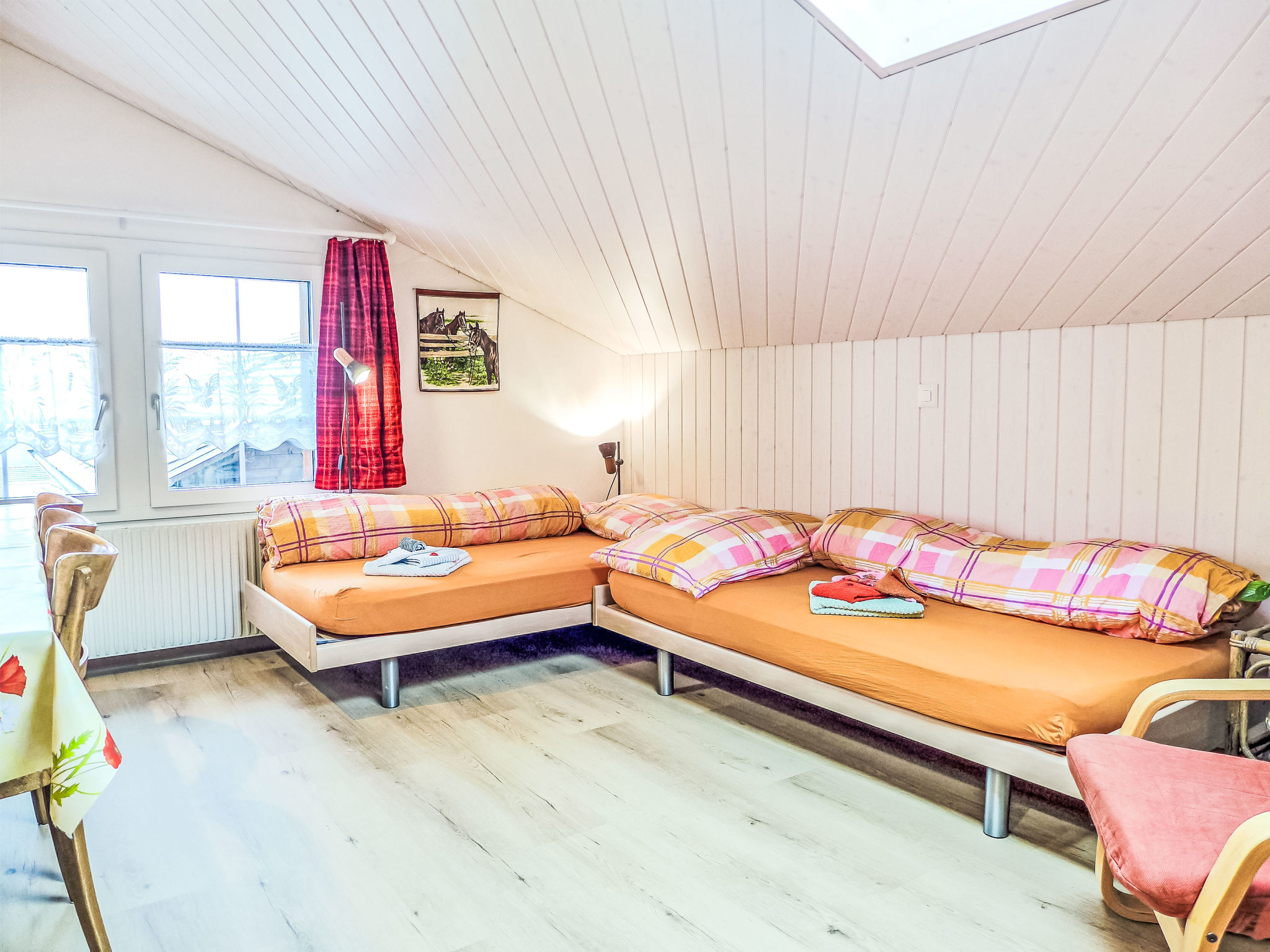 "Beim Thor Gross", 3-Zimmer-Wohnung 50 m2 auf 2 Stockwerken, im Obergeschoss. Geräumig und hell, teilweise abgeschrägt, einfach und gemütlich eingerichtet: offenes grosses Wohn-/Schlafzimmer mit 2 Betten (90 cm, Länge 200 cm), Esstisch, Flachbildschirm, Radio, Stereoanlage und DVD. 1 Zimmer mit 1 x 2 Etagenbetten (90 cm, Länge 200 cm). Offene Küche (Backofen, Geschirrspüler, 3 Glaskeramikplatten, Toaster, Wasserkocher, Mikrowelle, elektrische Kaffeemaschine, Kapseln für die Kaffeemaschine (Delizio) extra, Racletteofen, Fondue Set (Käse)). Dusche/WC. Dachgeschoss: (Leiter) 1 abgeschrägtes Zimmer mit 3 Schlafmöglichkeiten (90 cm, Länge 200 cm). Kleine Terrasse. Balkonmöbel. Schöne Sicht auf die Berge und die Landschaft. Zur Verfügung: Babybett bis 2 Jahre (extra), Haartrockner. Internet (WLAN, gratis). Parkplatz (1 Auto). Bitte beachten: Nichtraucher-Unterkunft. Maximal 1 Haustier/Hund erlaubt.