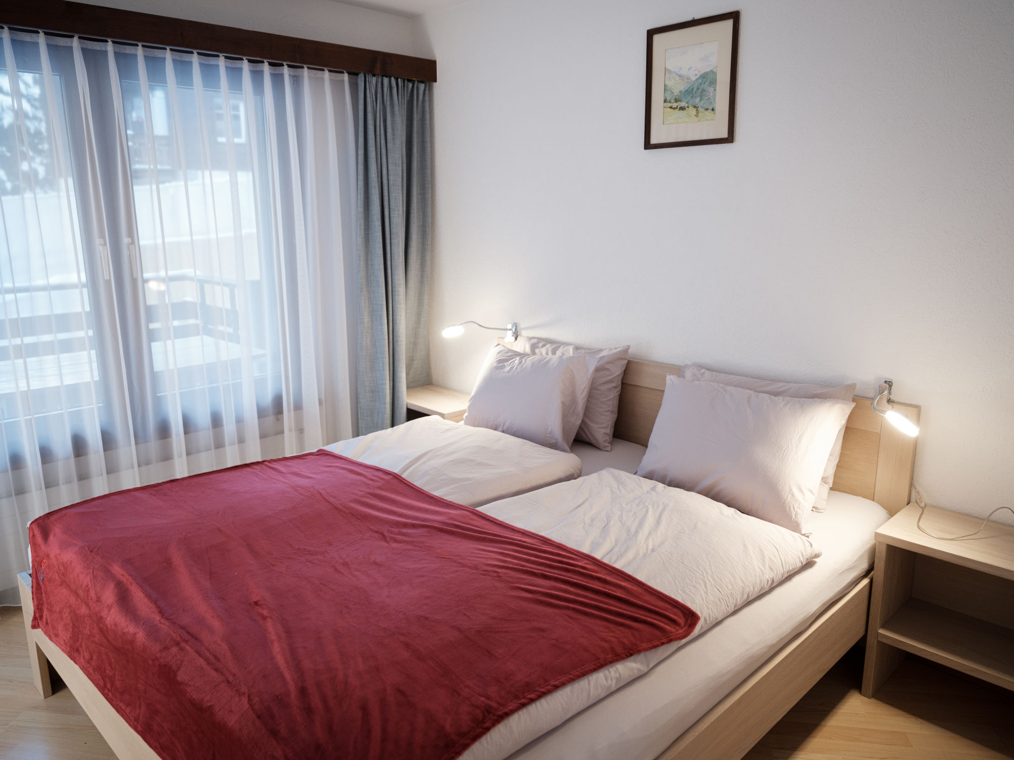 "Pasadena", 2-Zimmer-Wohnung 73 m2 im 1. Stock. Geräumig und hell, schön und geschmackvoll eingerichtet: Wohn-/Esszimmer mit Esstisch und TV. Ausgang zum Balkon. 1 Doppelzimmer mit 1 Doppelbett (2 x 90 cm, Länge 200 cm). Ausgang zum Balkon. Küche (Backofen, Geschirrspüler, 4 Glaskeramikplatten, Toaster, Wasserkocher, Tiefkühler, elektrische Kaffeemaschine). Bad/WC. Grosser Balkon. Balkonmöbel. Seitliche Sicht auf die Berge. Zur Verfügung: Haartrockner. Internet (Wireless LAN, gratis). Bitte beachten: Nichtraucher-Unterkunft.